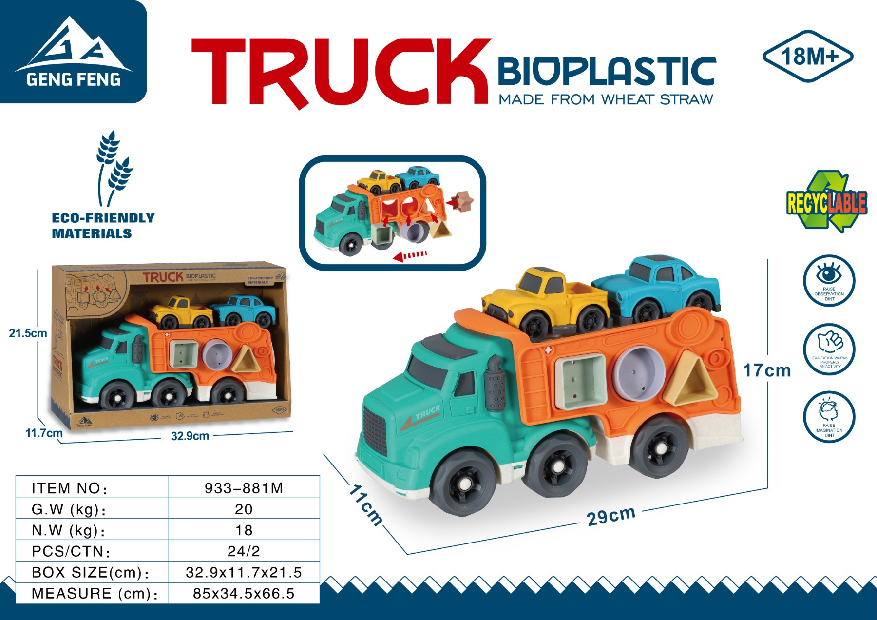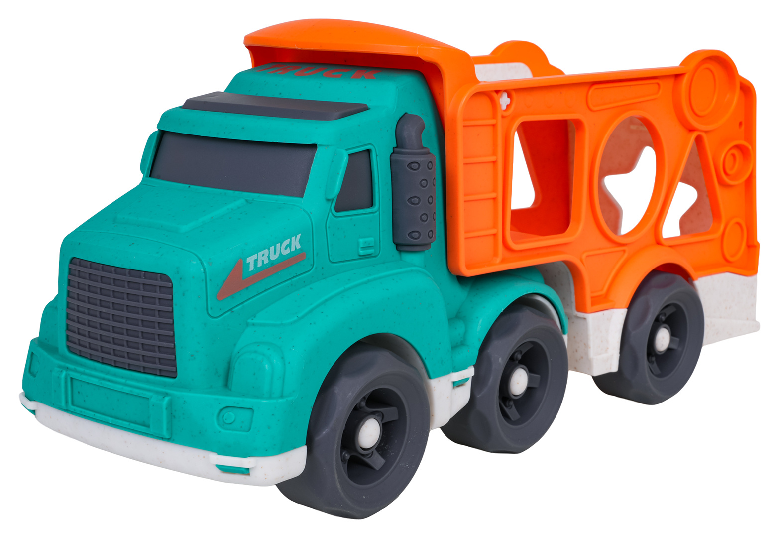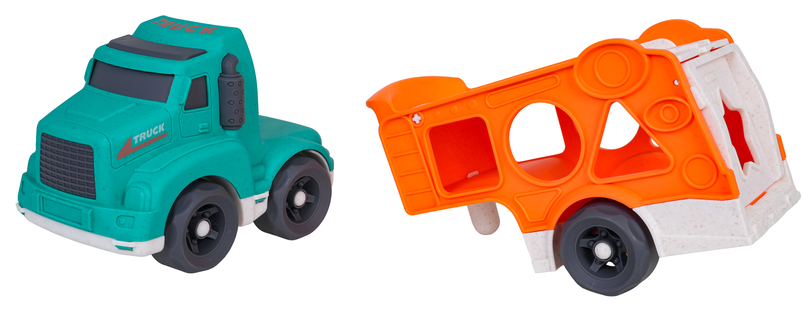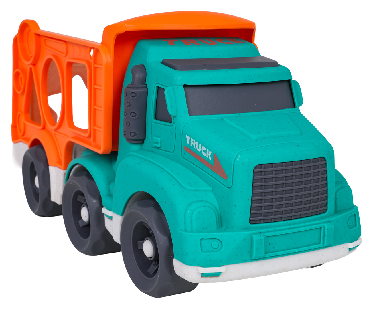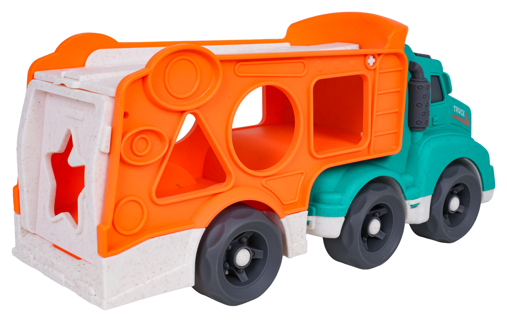 Sada odtahovka, vozidla, třídič vyrobený z bioplastu pro děti od osmnáctého měsíce života. Sada se skládá z vozidla a velkého přívěsu, po jehož stranách je třídič tvarů, kostky a 2 autíčka. Eko-materiál je bezpečný pro děti a šetrný k životnímu prostředí. Vozidla jsou barevná, odolná a odolná proti poškození. Přívěs můžeme odpojovat od vozidla. Ideální hračka do domu i na ven.