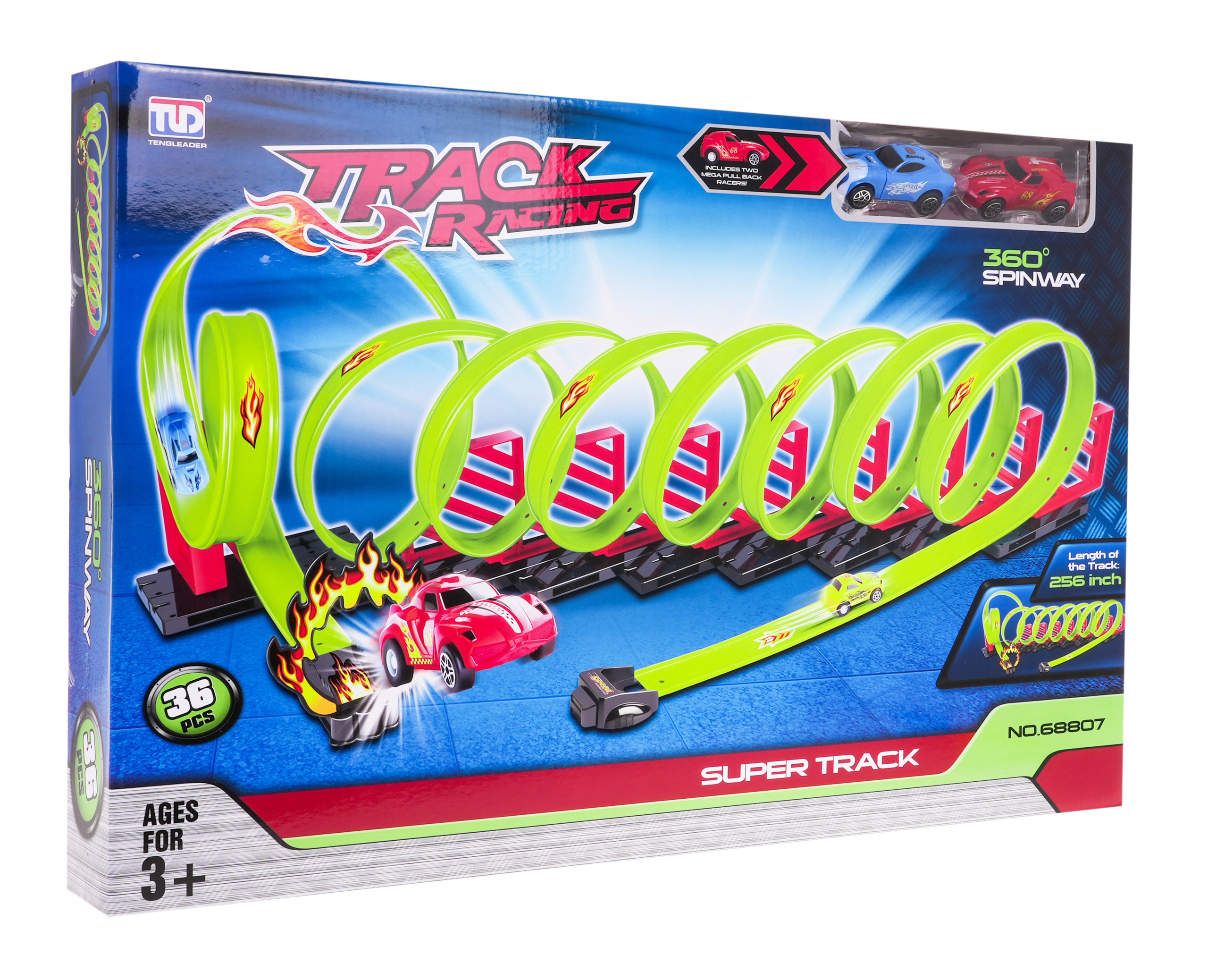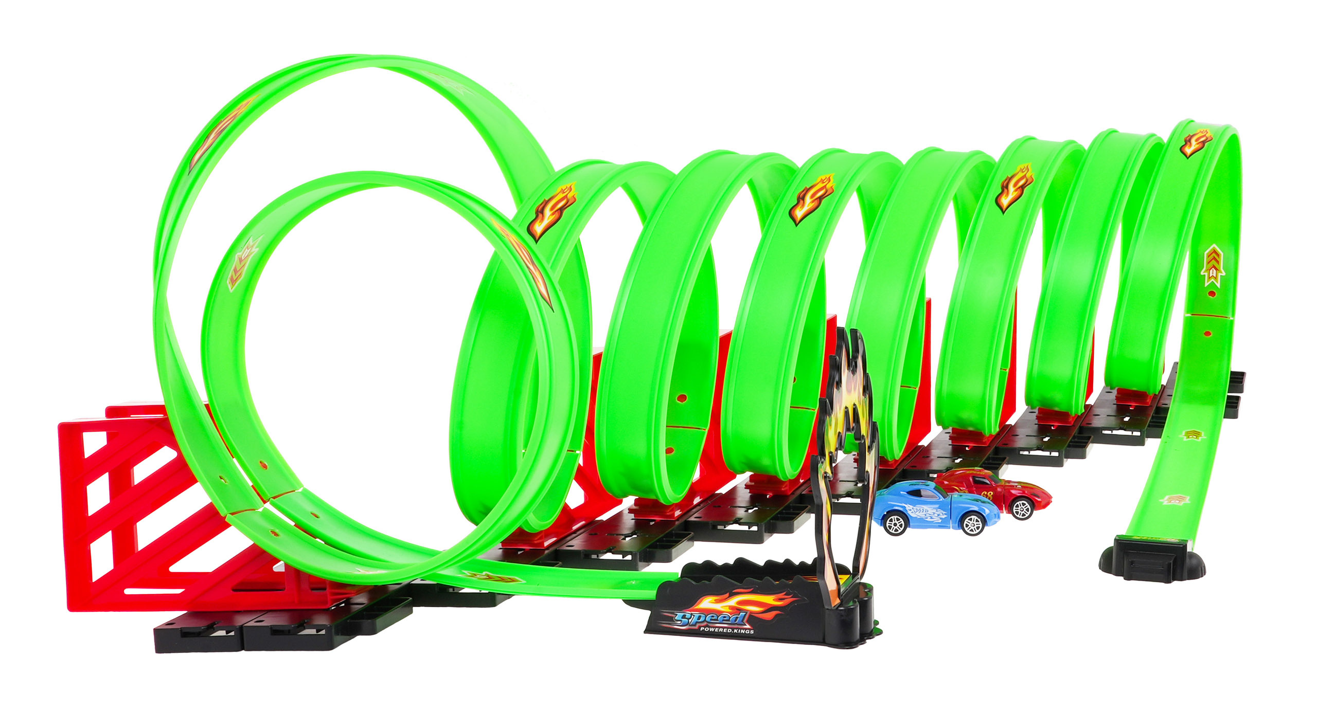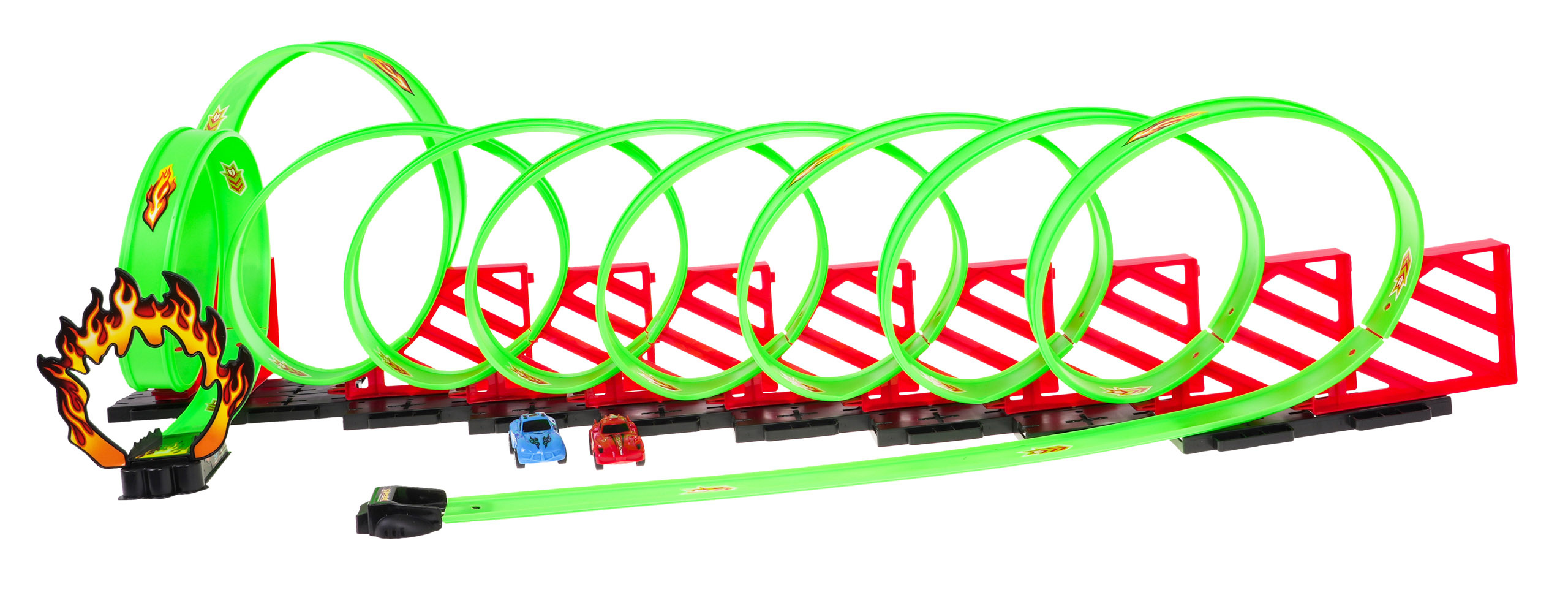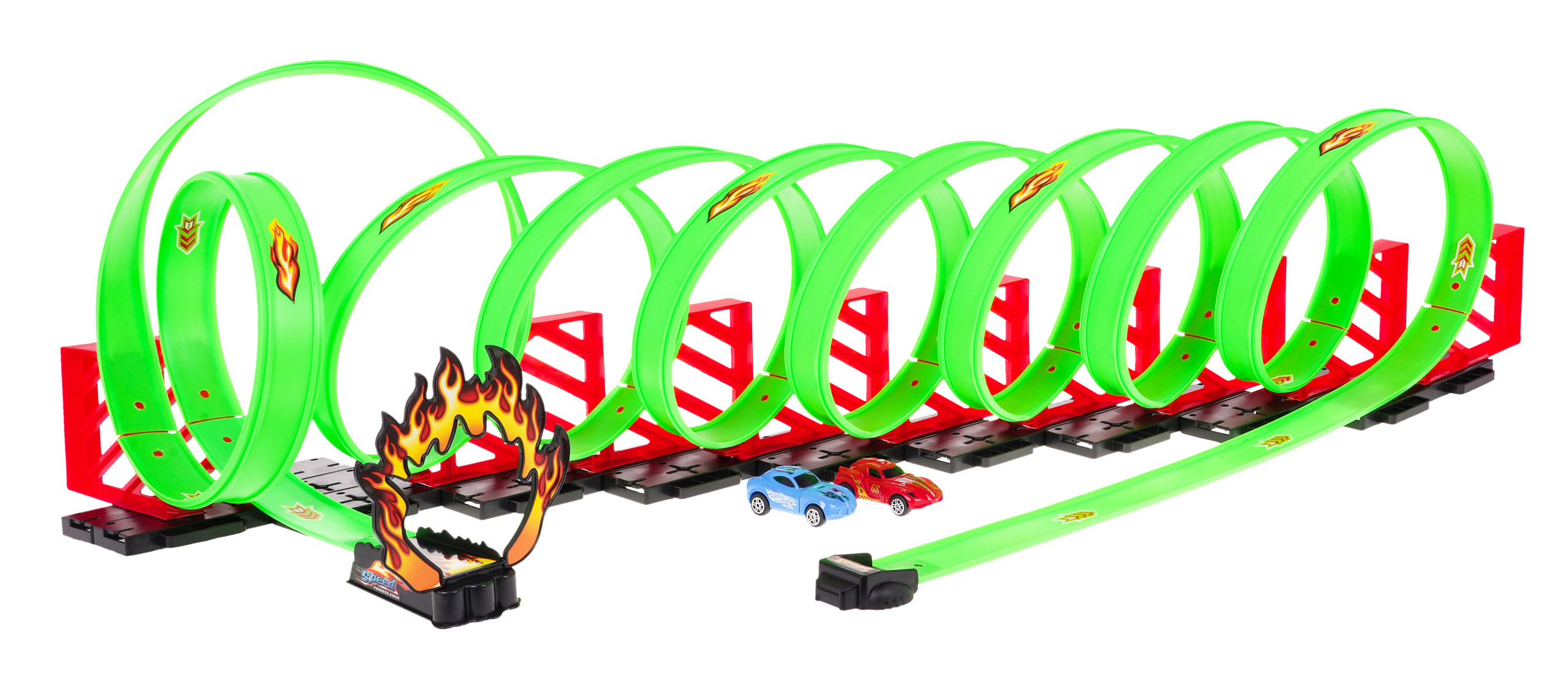 Extrémní závodní dráha se spoustou smyček a dvěma autíčky v ceně je určena pro děti od tří let. Dráha se skládá z 36 samostatně sestavitelných dílů, smyček a rovných úseků. Vozy mají pohon pull-back. Stačí je jen jemně postrčit dozadu a oni se rozjedou po dráze, projedou rovné úseky, na smyčkách se otočí o 360 stupňů a projedou požární smyčkou.