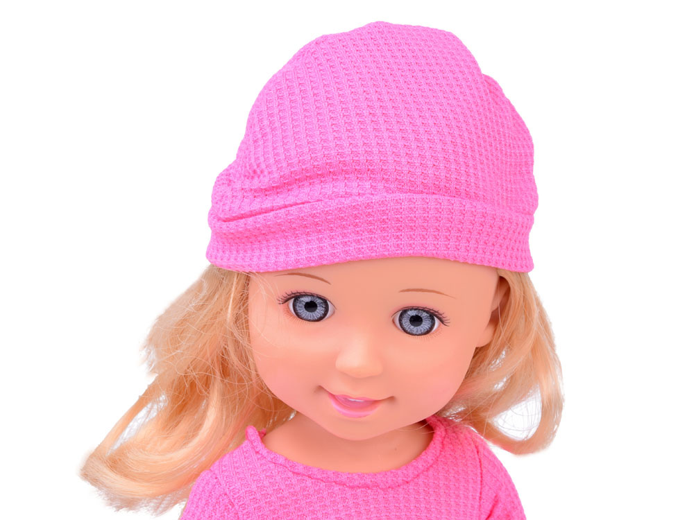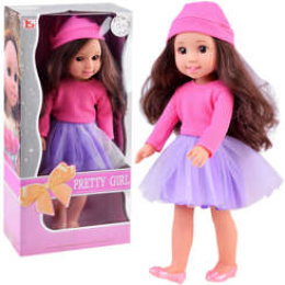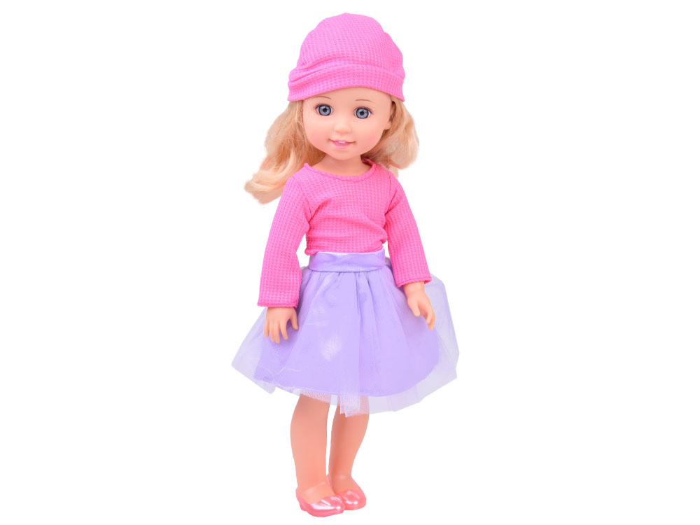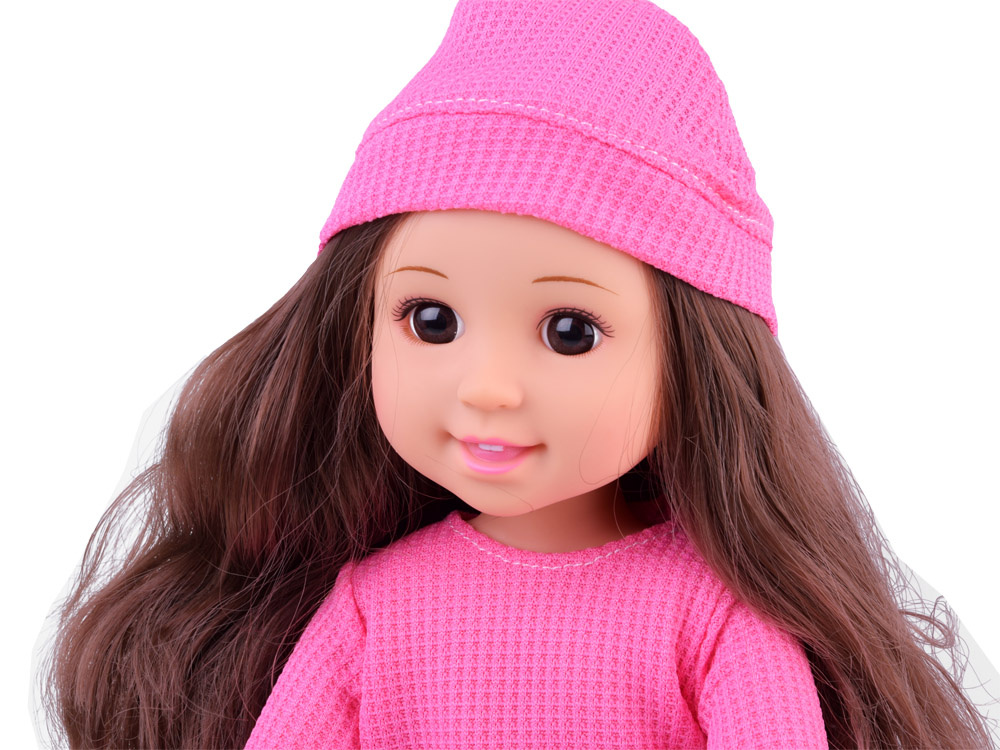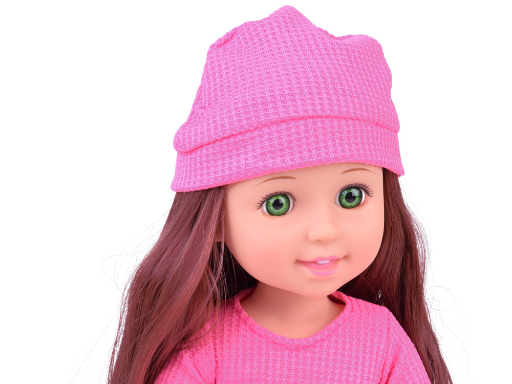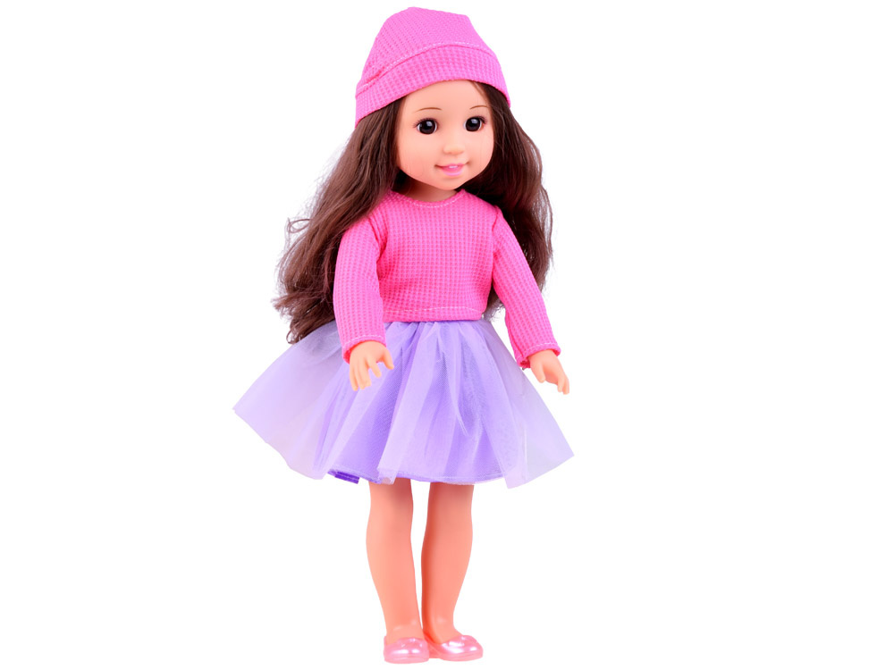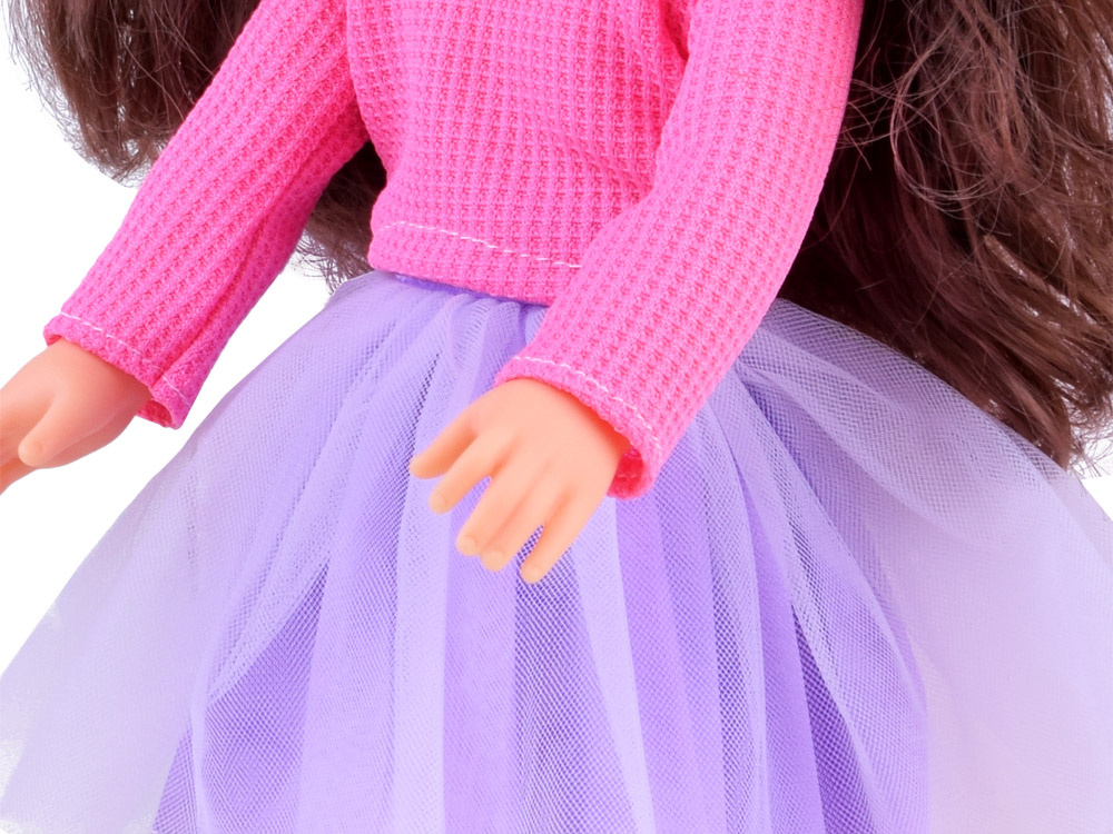 Rozkošná panenka pro každou holčičku, která poskytne spoustu pozitivní zábavy. 36 cm vysoká panenka má dlouhé hnědé vlnité vlasy. Na hlavě má růžovou čepici. Je oblečená do růžové halenky a fialové sukně, na nohou má růžové sandály. Panenka je celá z plastu, takže sedí stabilně. Má pohyblivé končetiny ruce a nohy. Dlouhé vlnité vlasy panenky lze libovolně upravovat a česat. S takovým módním návrhářem můžete vyrazit na ples nebo odpolední čaj.