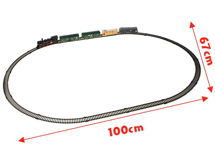 Napájení z baterií (2xAA) zajišťuje bezpečnost, protože není nutné používat síťový adaptér. Železnici pohání klasická parní lokomotiva. Kromě lokomotivy sada obsahuje 4 vagóny!Dva osobní a dva nákladní vozy. Celé depo (lokomotiva a všechny vagóny) je dlouhé 65 cm. Sestavená sada kolejí je 100 cm dlouhá a 67 cm široká.