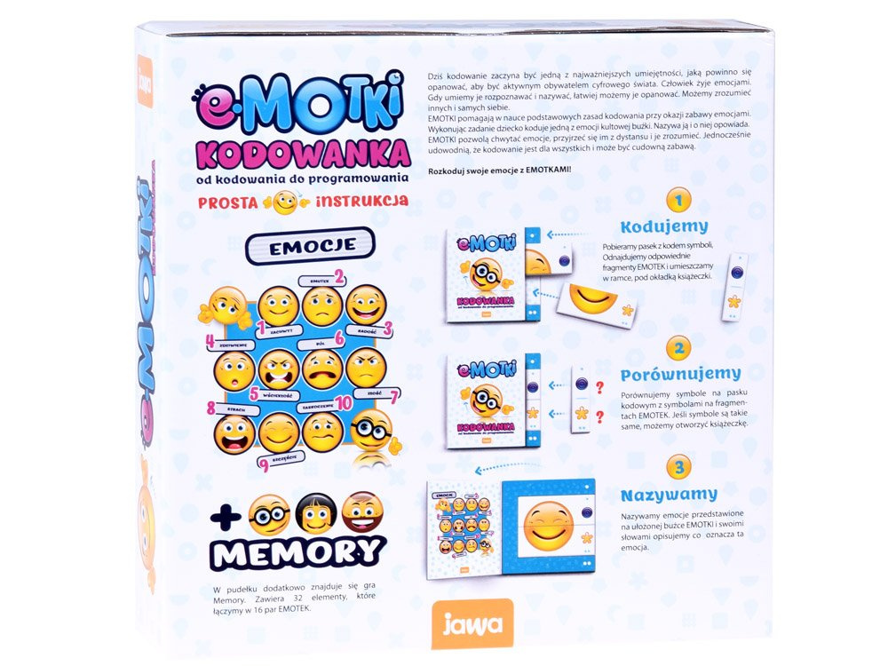 Hra na kódování pomáhá naučit základní principy kódování a zároveň se bavit emocemi. při plnění úkolu dítě zakóduje jednu z emocí ikonického smajlíka, pojmenuje ji a vypráví o ní. Emoce vám umožní pochopit emoce. podívat se na ně z odstupu a pochopit je. Zároveň vám dokáží, že programování je pro každého a může být skvělou zábavou. Podívejte se na další deskové hry z naší velkoobchodní nabídky.