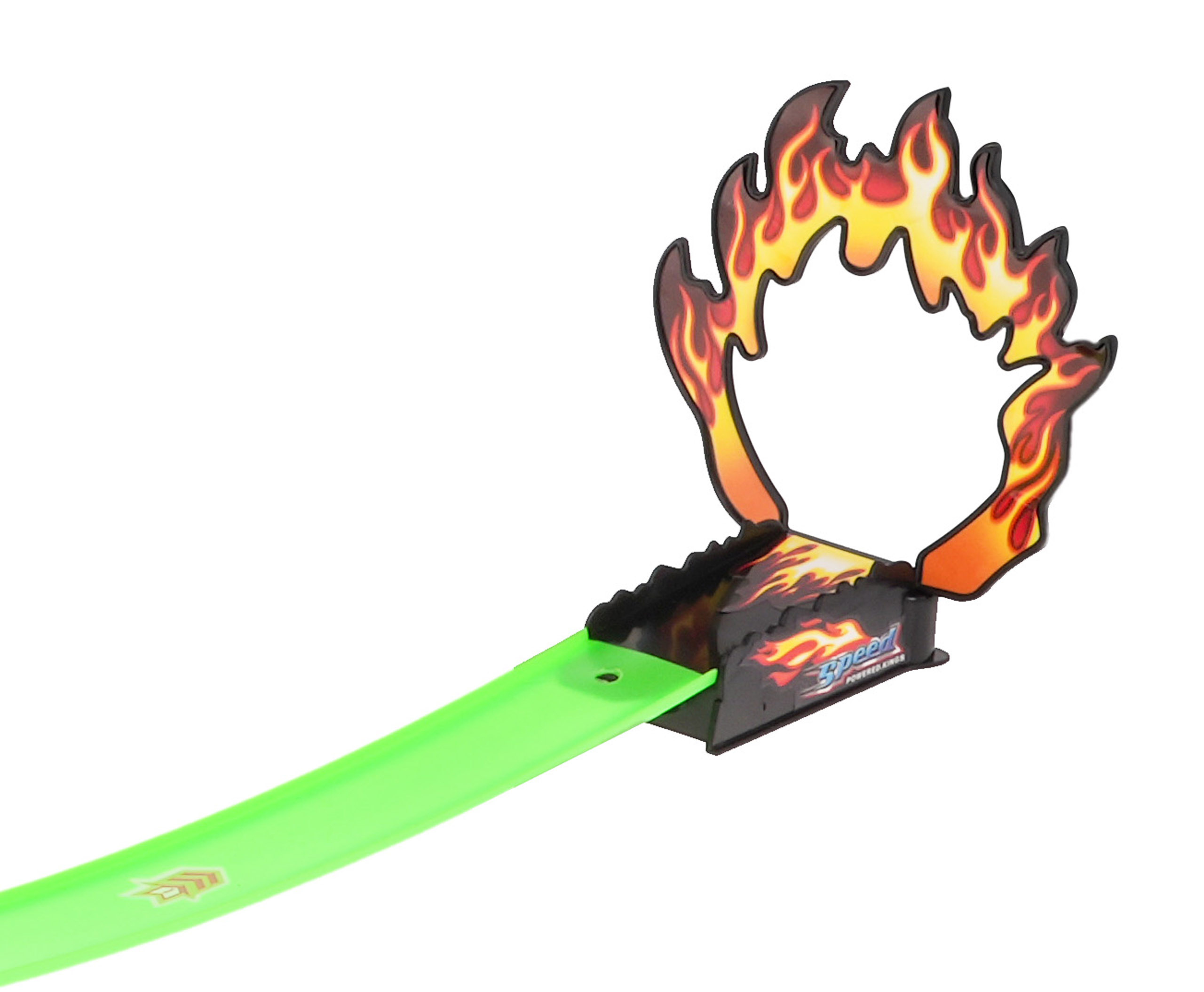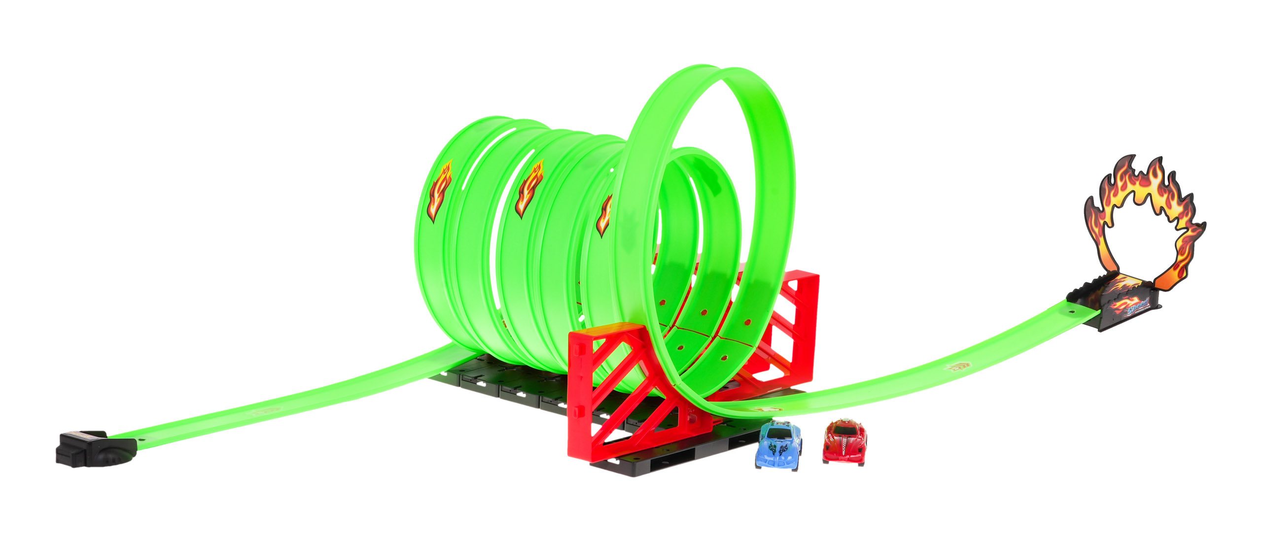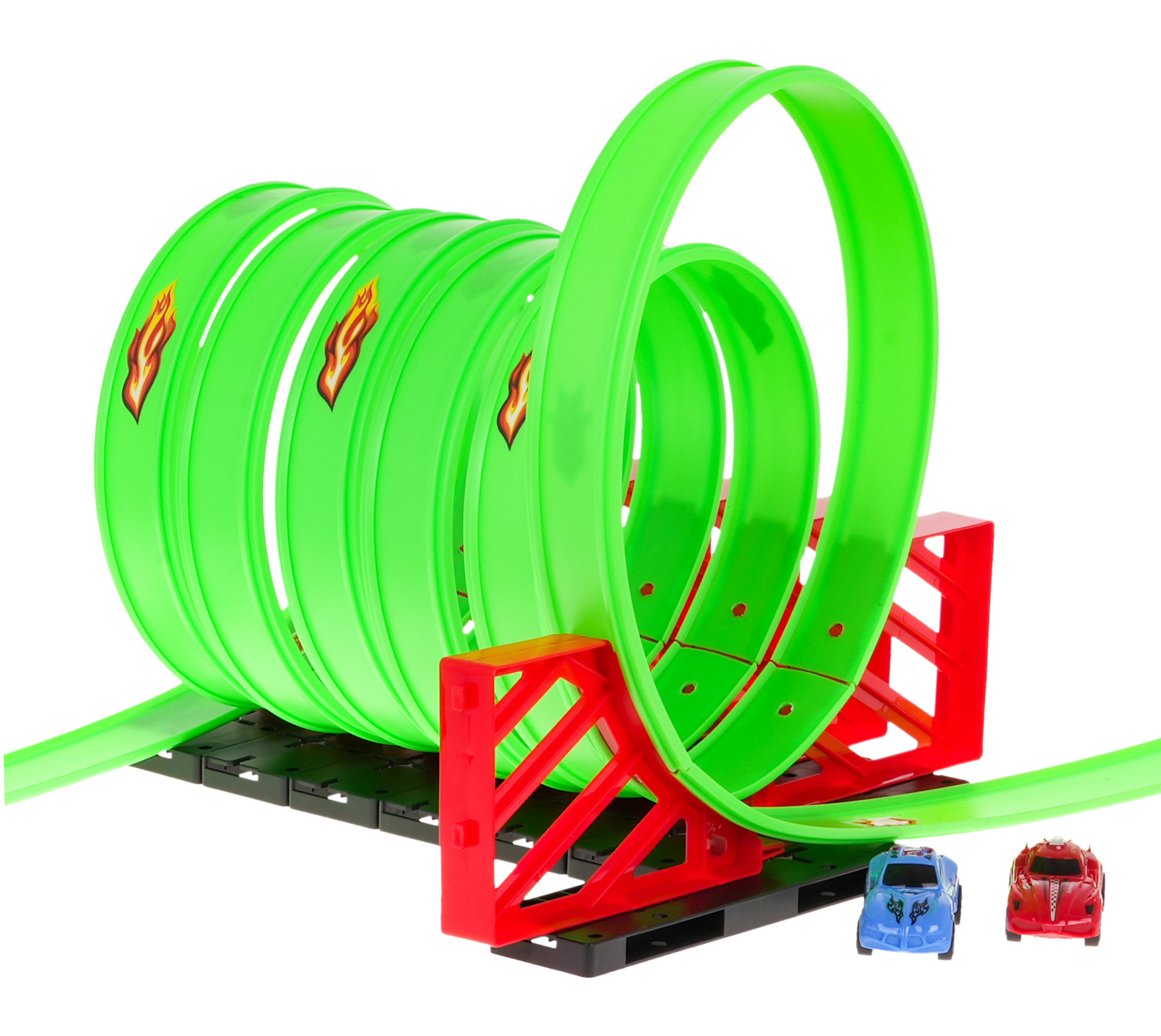 Extrémní závodní dráha se šesti smyčkami a autíčky je určena pro děti od 3 let. Soubor se skládá z 27 prvků. Celková délka dráhy je 185 cm. Dráha obsahuje rovné úseky, smyčky a odpalovací zařízení s "ohnivou" smyčkou. Vozy mají pohon Pull Back, který nevyžaduje žádné baterie. Stačí jemně zatlačit na auto dozadu a ono začne přeskakovat dopředu. Vozidlo je na startu nastaveno tak, že po zrychlení nejprve bleskově projede rovným úsekem, poté absolvuje šest smyček s otočkou o 360 stupňů, vjede do rovného úseku a proletí smyčkami "plamenů".autíčka jsou konstruována ze dvou pohyblivých částí, takže dokonale kopírují tvar dráhy a nespadnou. Dobrá zábava zaručena.