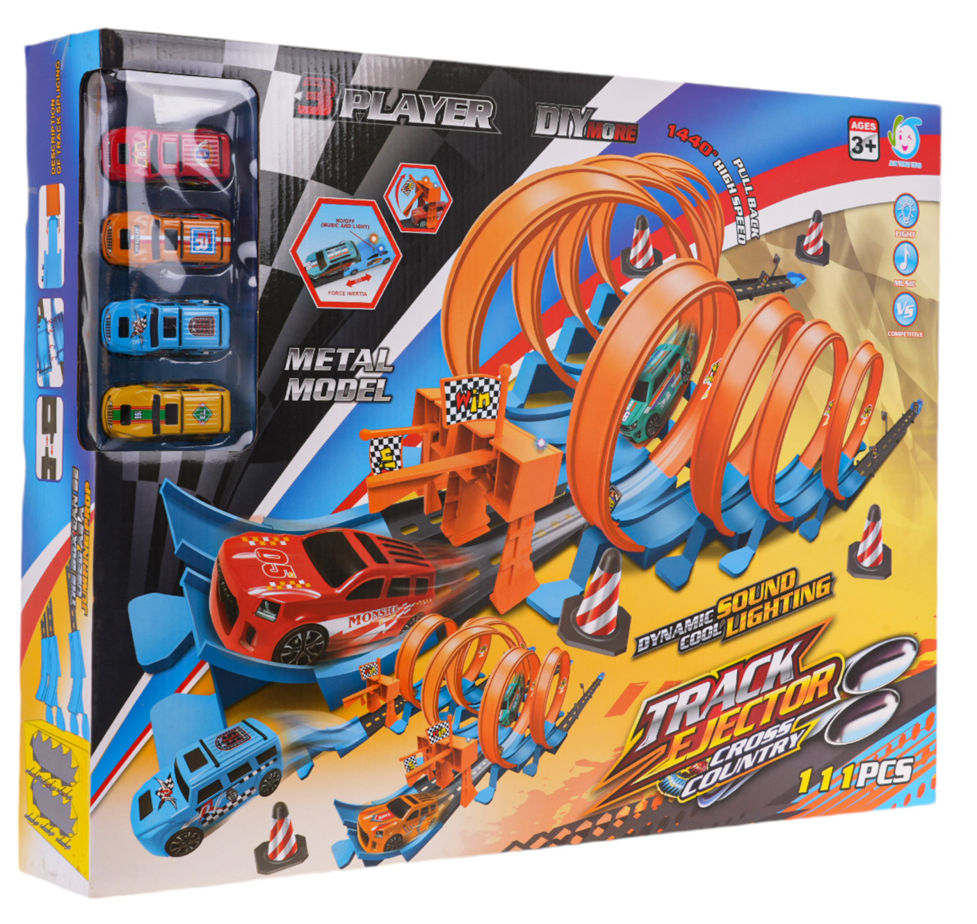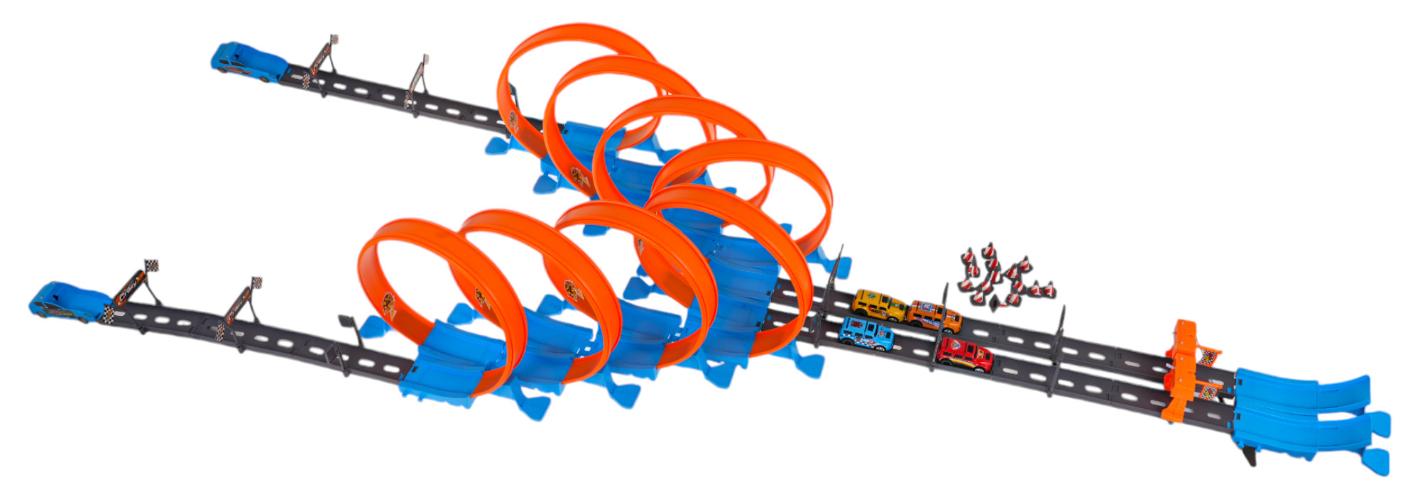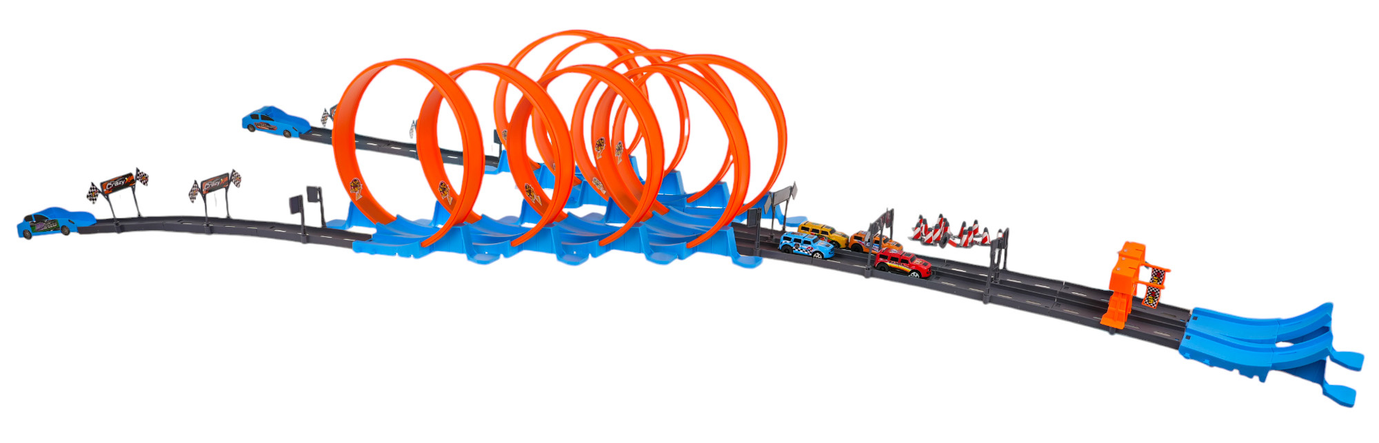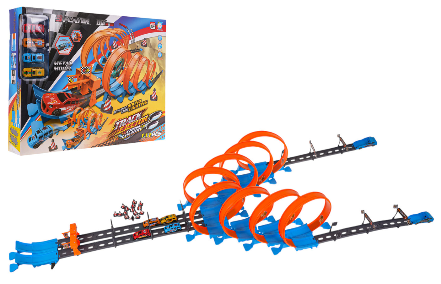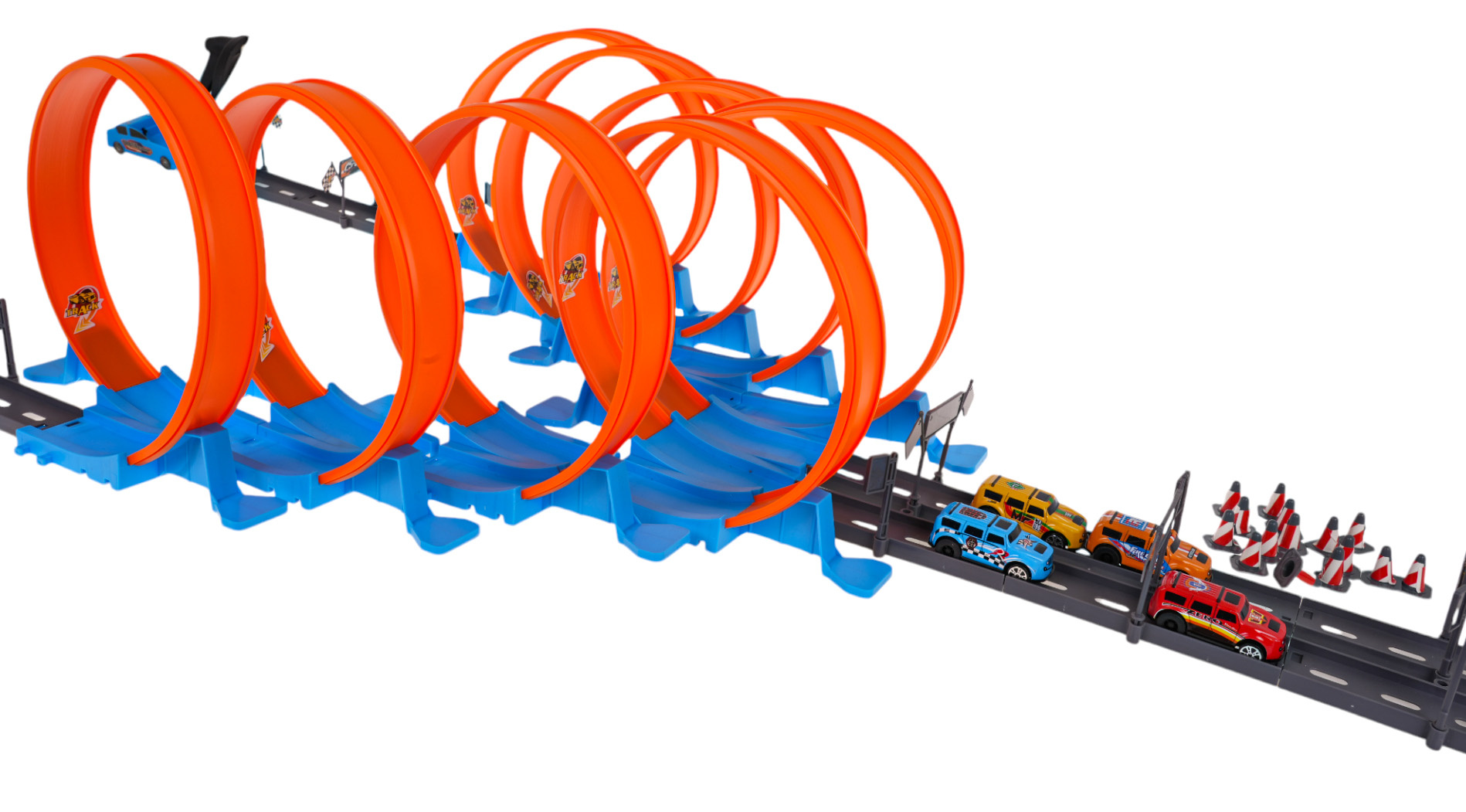 Extrémní, interaktivní závodní dráha s kovovými autíčky v sadě pro děti od 3 let. Sada se skládá ze 111 prvků pro vlastní montáž. Po vybudování trať obsahuje spoustu smyček o 360 stupňů. V sadě se nacházejí čtyři vozidla s kovovou karoserií. Dráha je vybavena zvukovými a světelnými efekty, jako jsou veselé melodie, zvuky jízdy, klakson a blikající světýlka. Hračka je napájena bateriemi typu 3 x LR41 – stožár (baterie jsou součástí balení) a 9 x LR44 – plastová autíčka (baterie jsou součástí balení).
