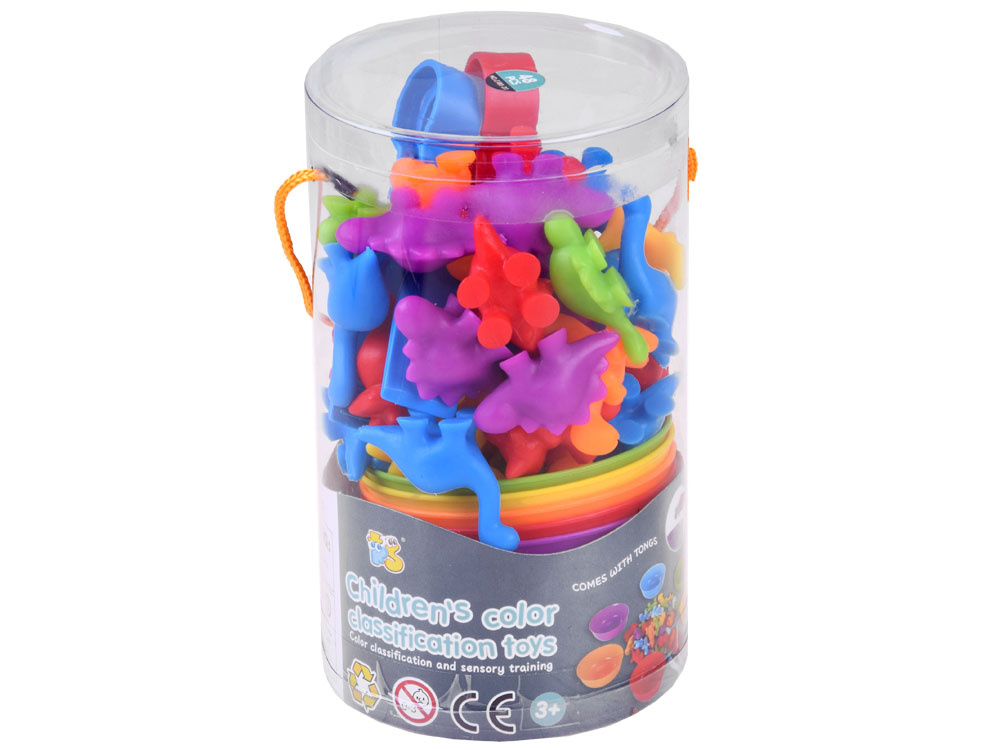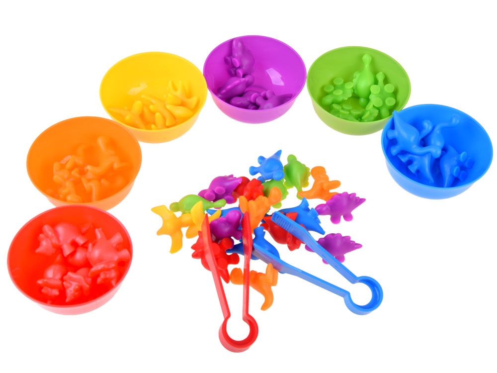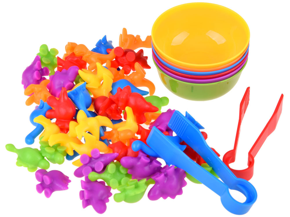 Všichni dinosauři se vysypou a smíchají dohromady, misky se rozloží. Úkolem dítěte je pomocí pinzety roztřídit dinosaury a umístit správnou barvu do správné misky.Dokáže je také rozdělit na tvary a provádět různé matematické operace. Skvěle se hodí k učení počítání, sčítání a odčítání bude snadné a zábavné.