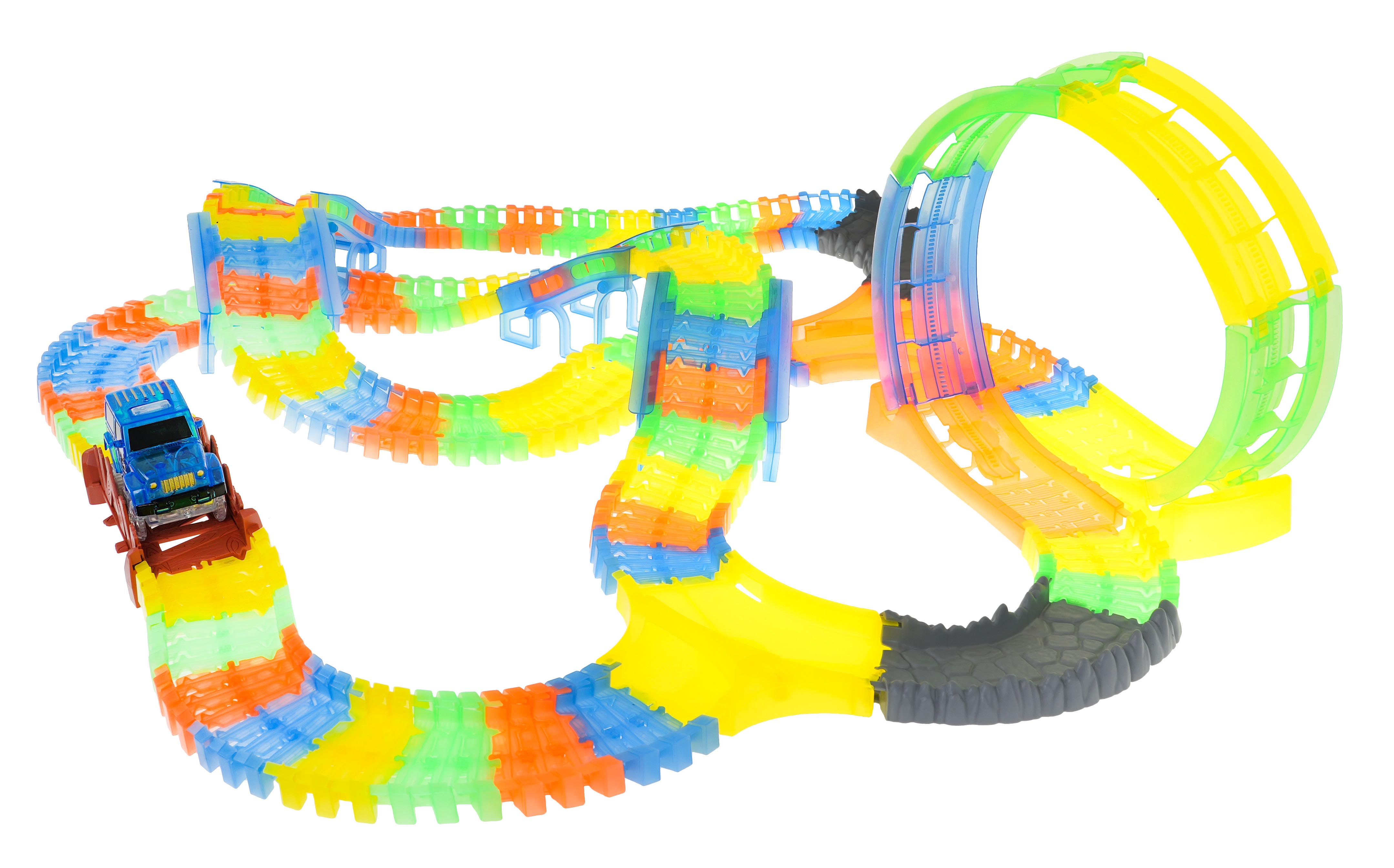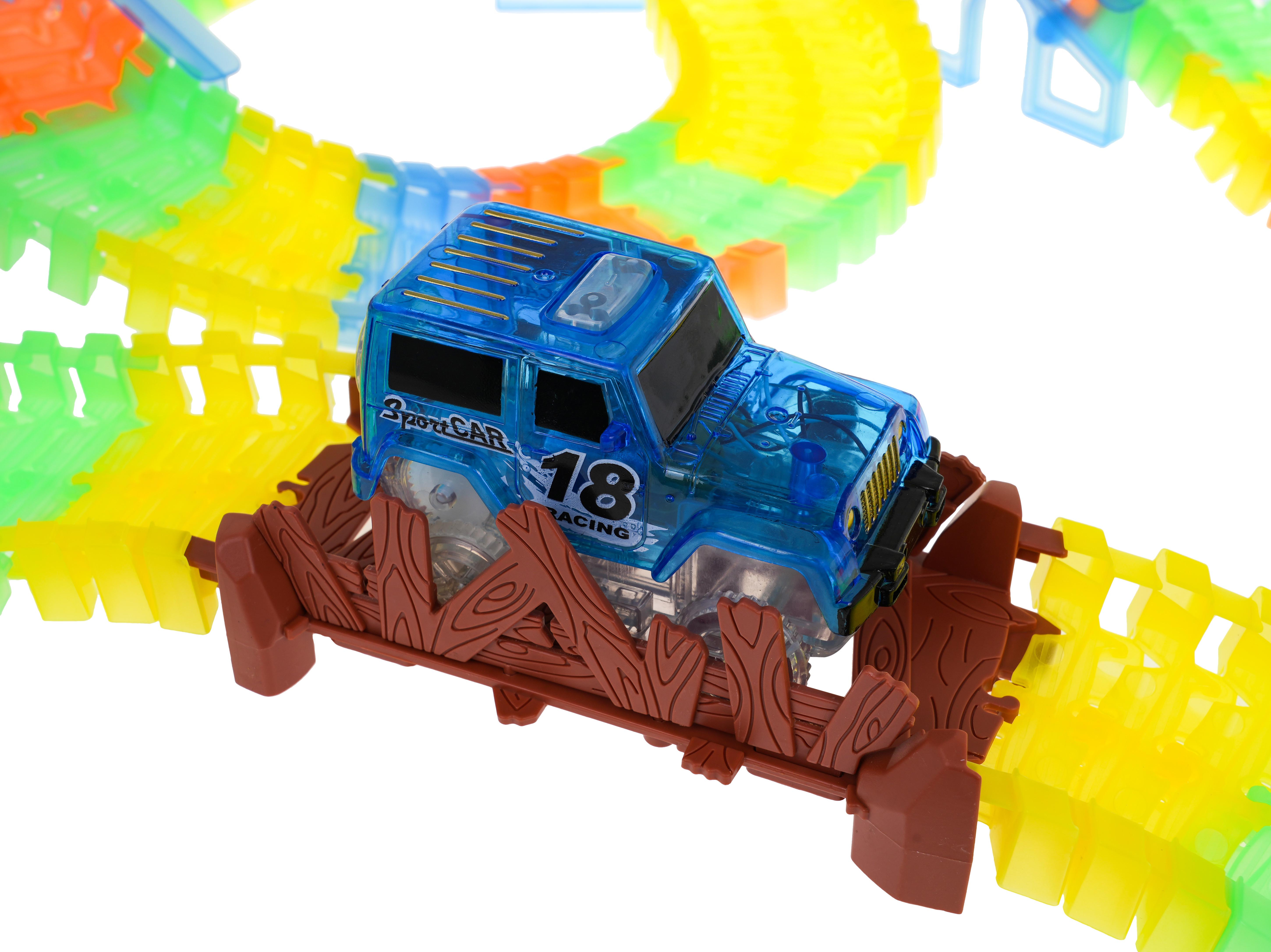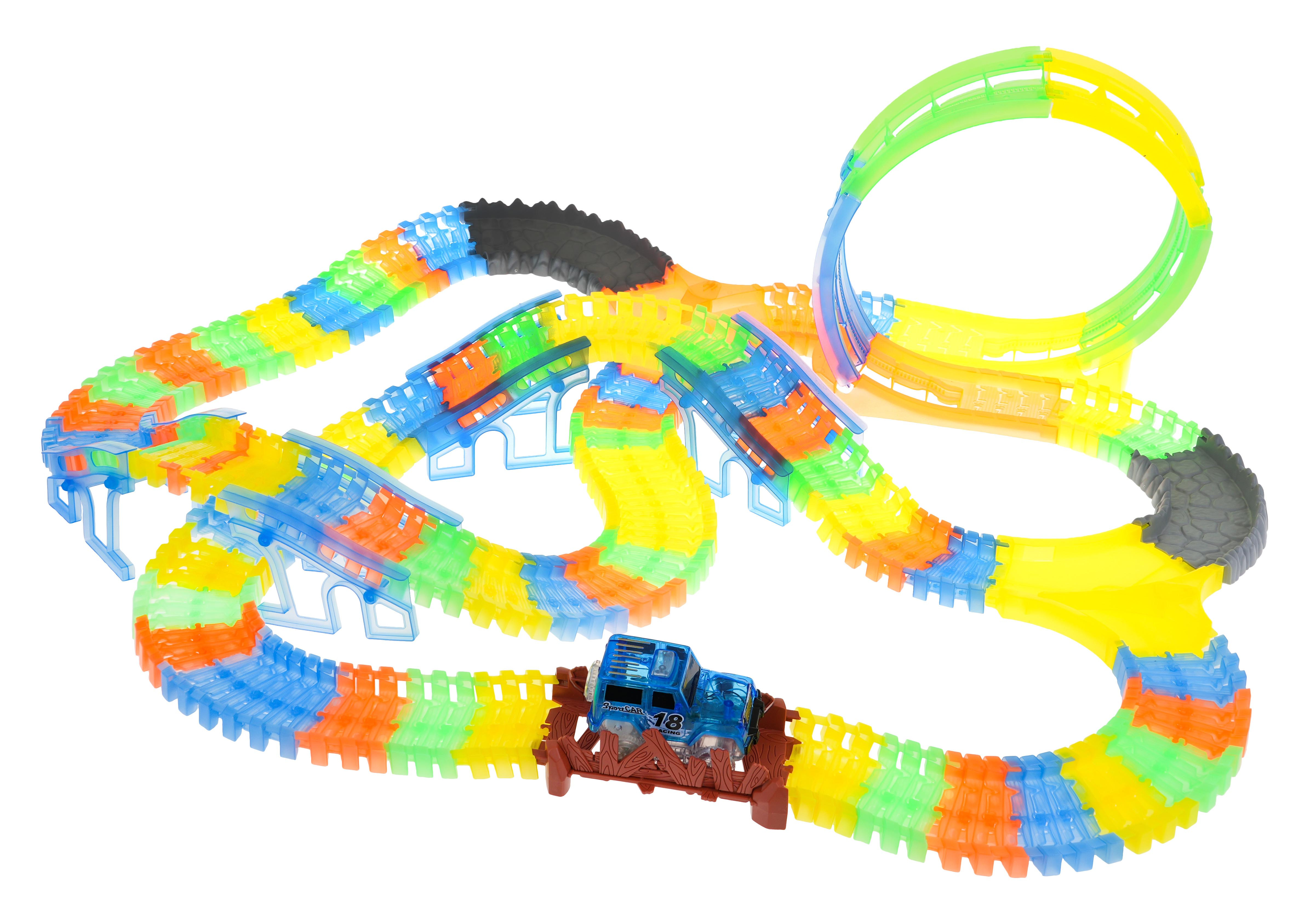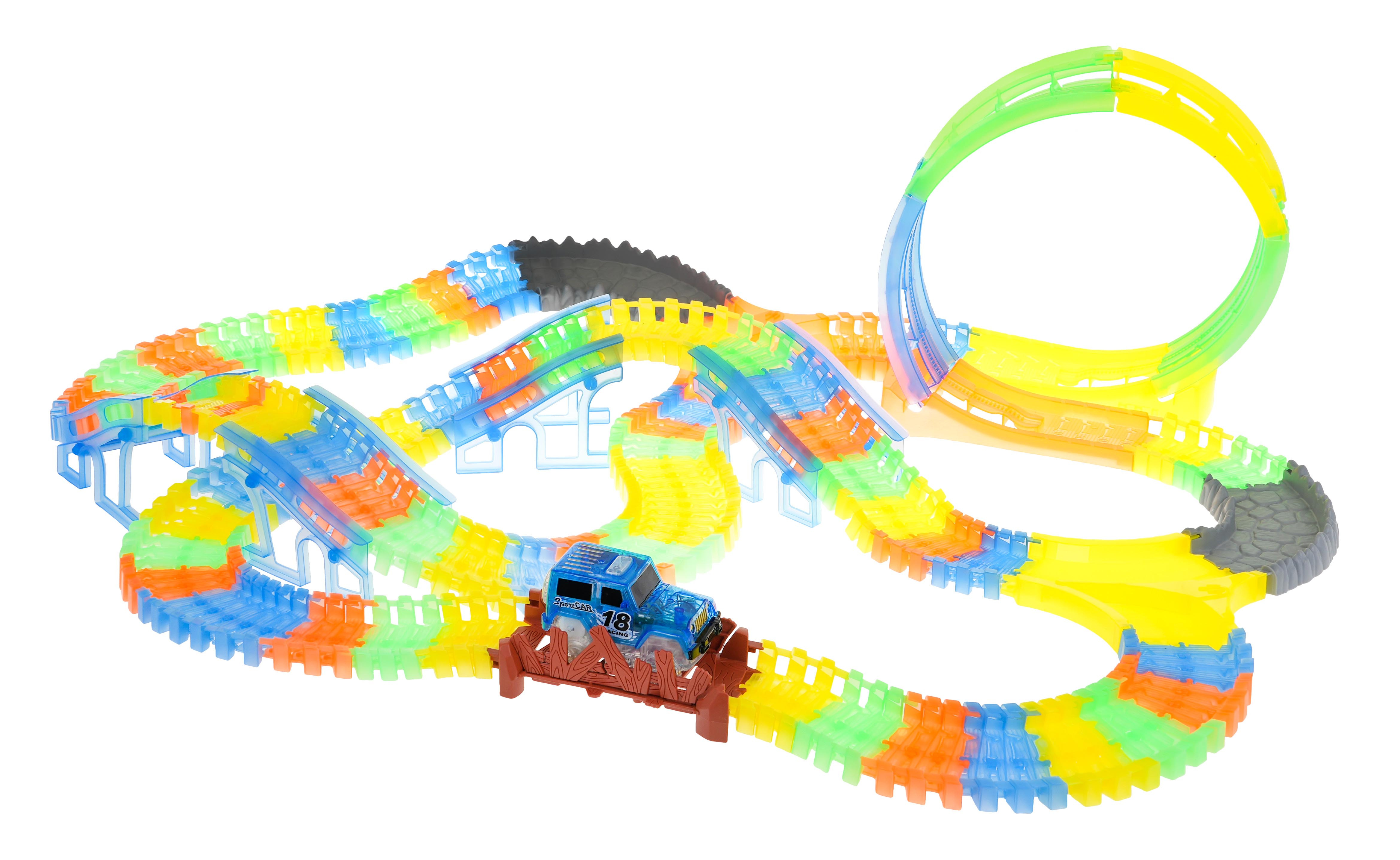 Dráha svítící ve tmě se smyčkou a autíčkem v ceně je určena pro děti od 3 let. Pásy jsou flexibilní, lze je libovolně kombinovat, otáčet, zvedat, přeskupovat, a to vše za jízdy.kromě toho jsou stopy fluorescenční a ve tmě svítí. Vozidlo, které je součástí sady, má podsvícení LED, jízda ve tmě vytváří úžasný efekt. Vozidlo je napájeno 2 bateriemi AA 1,5 V, baterie nejsou součástí balení. Vůz nastartujete stisknutím tlačítka na střeše. Celková délka dráhy je 446 cm.