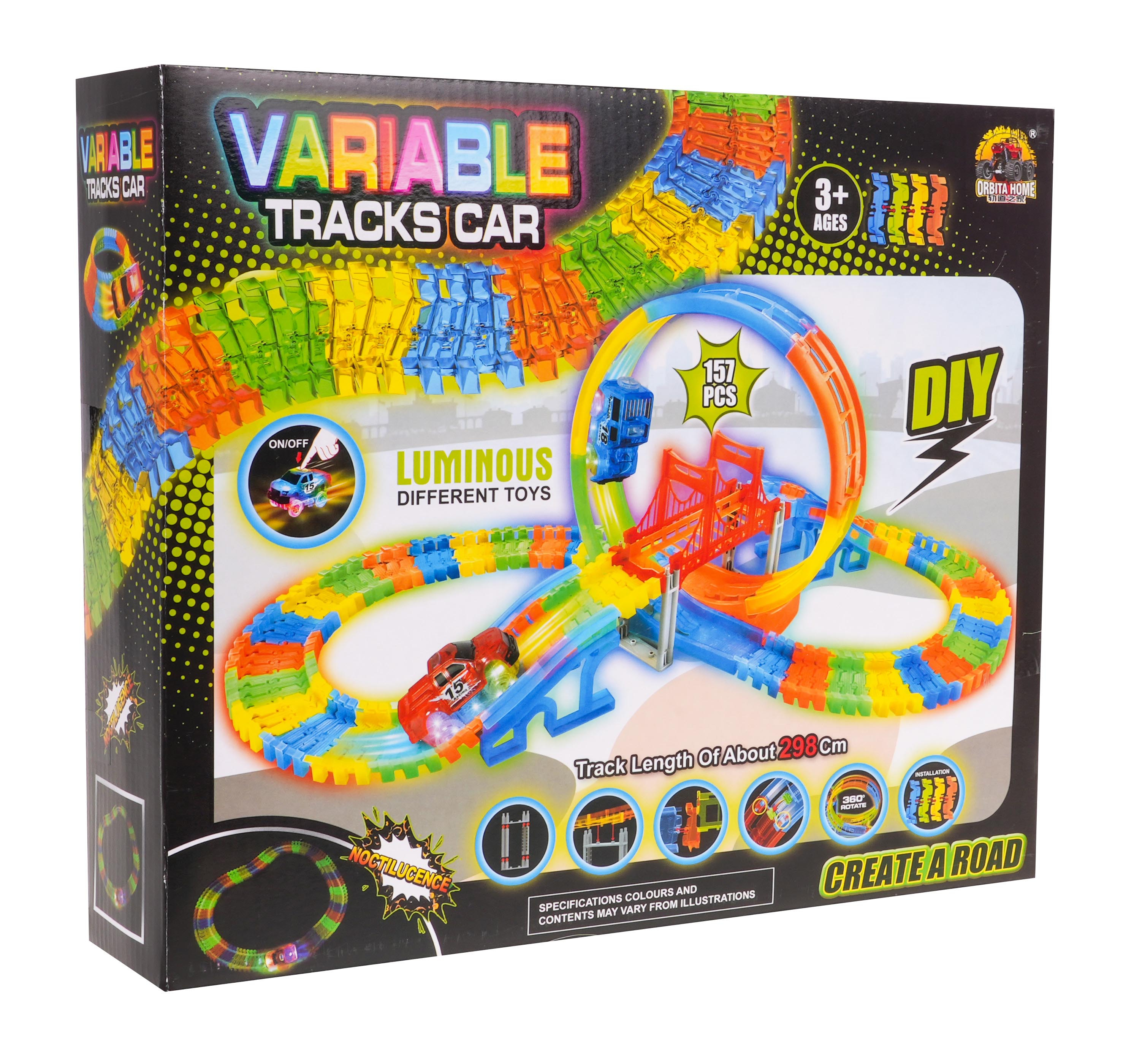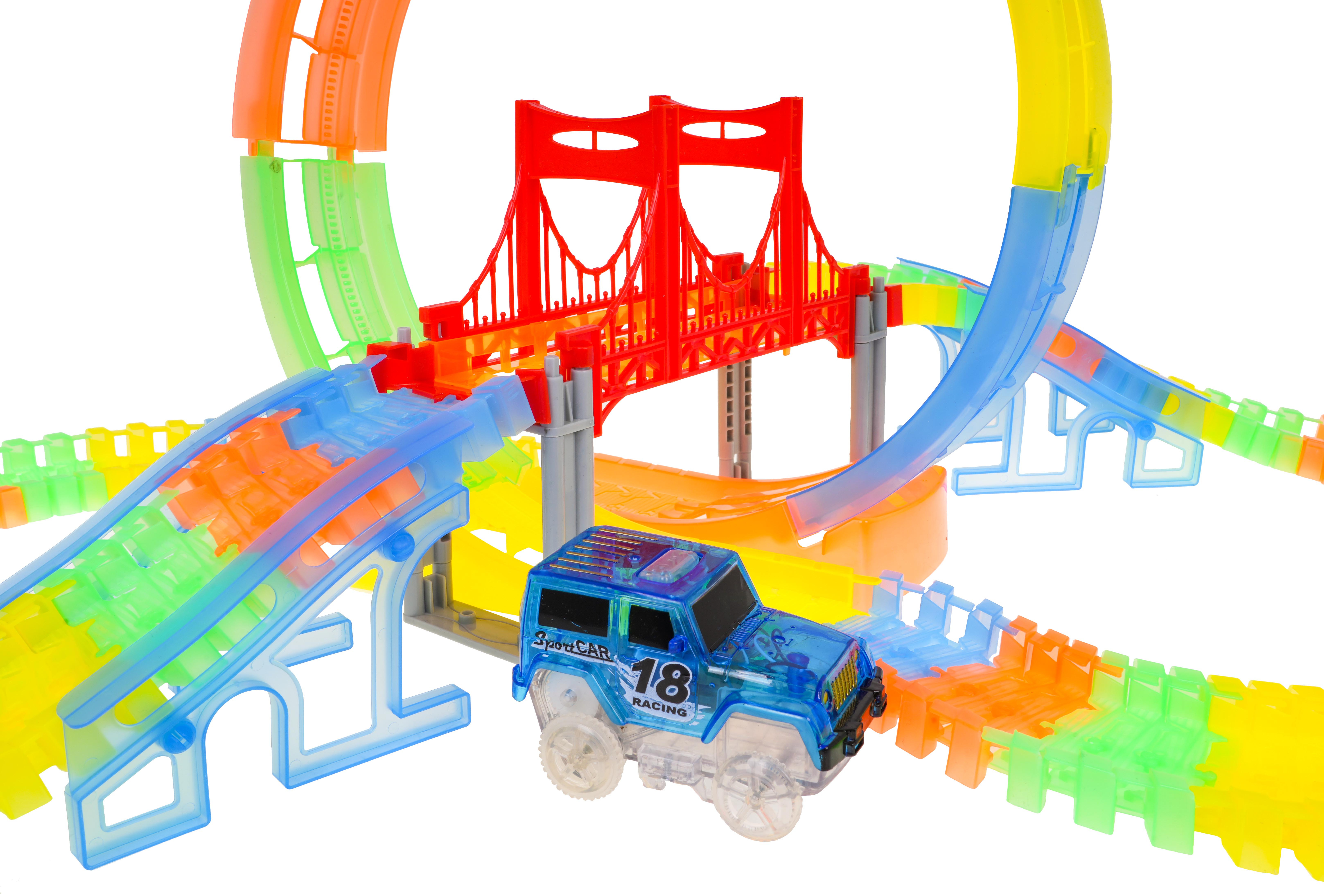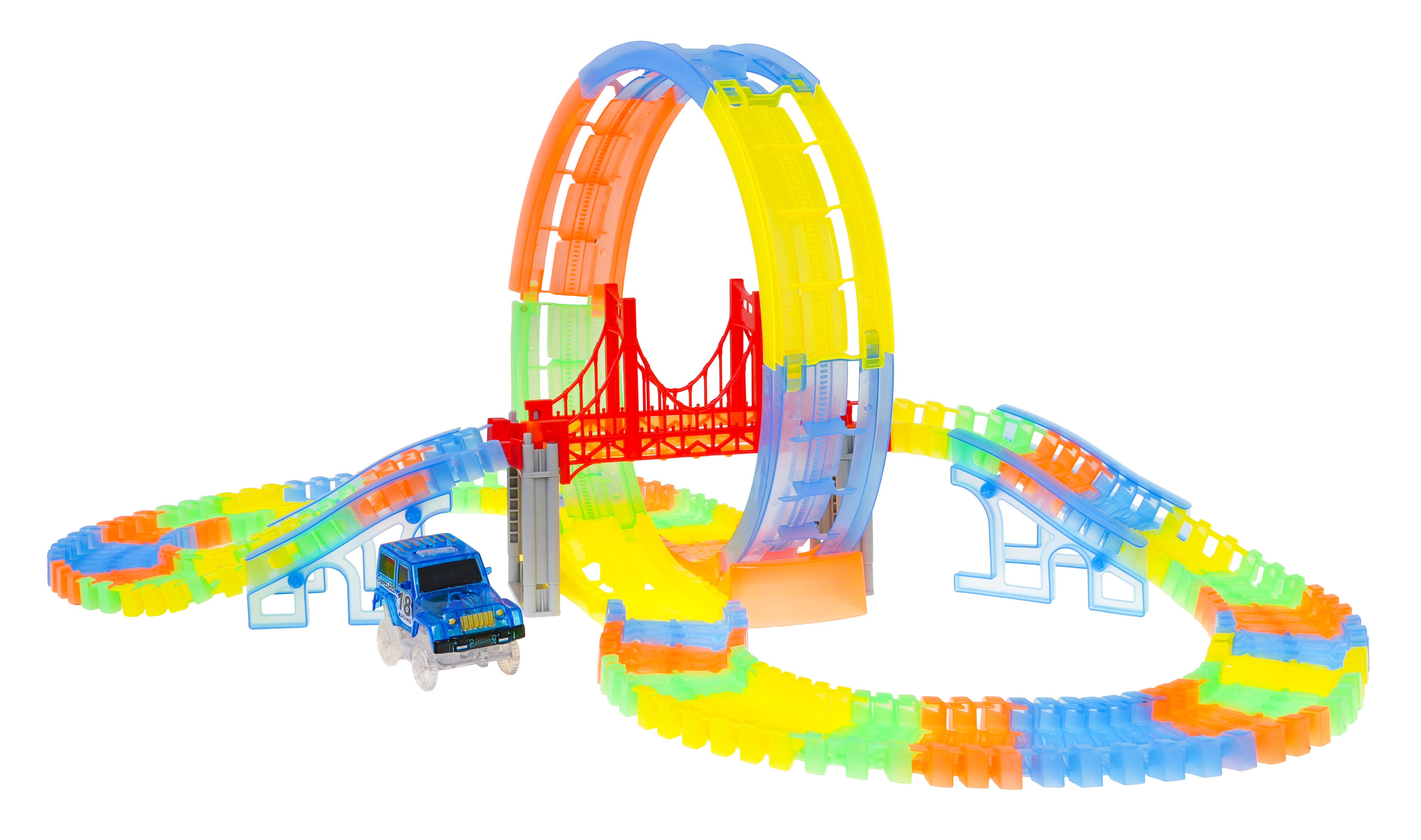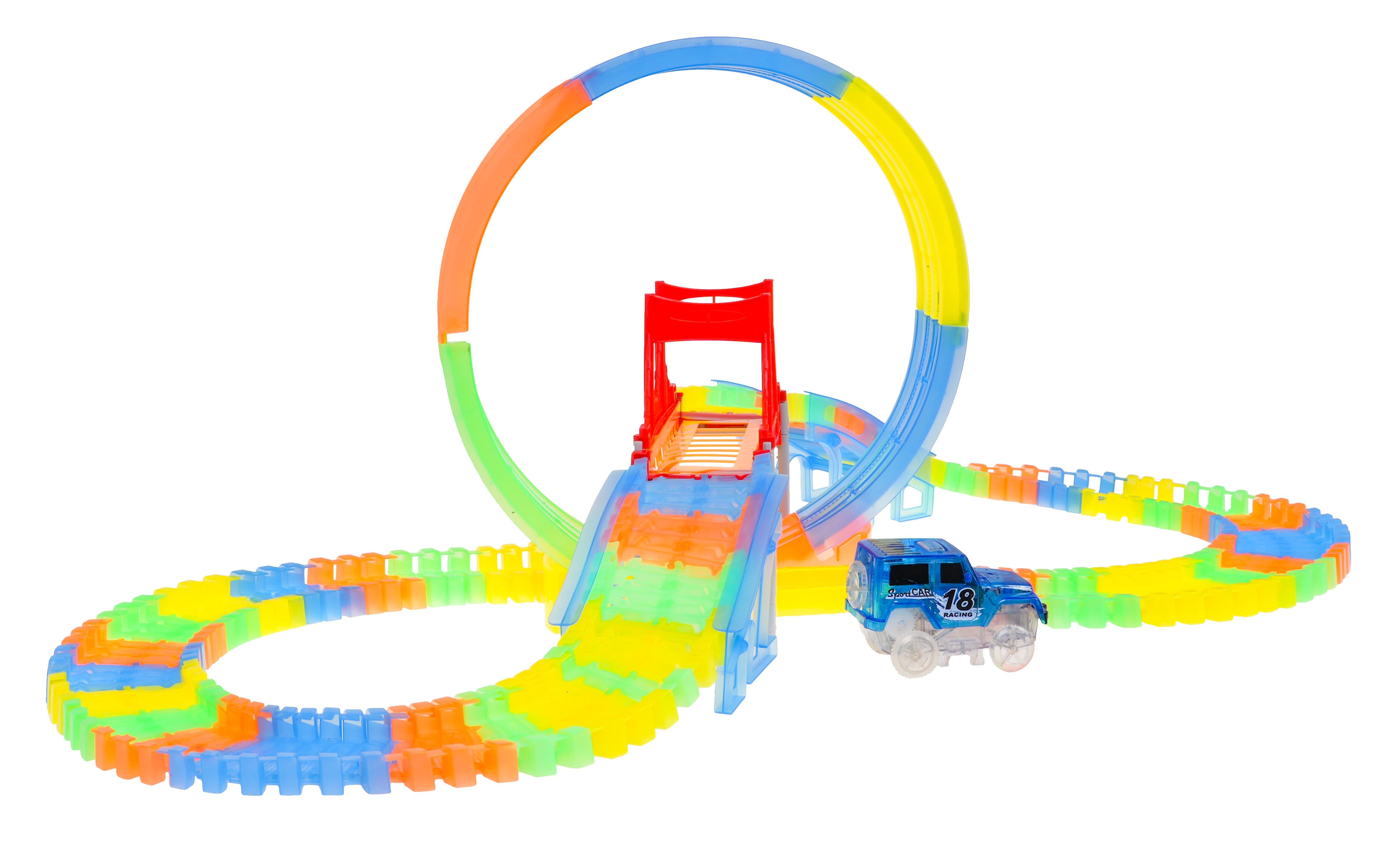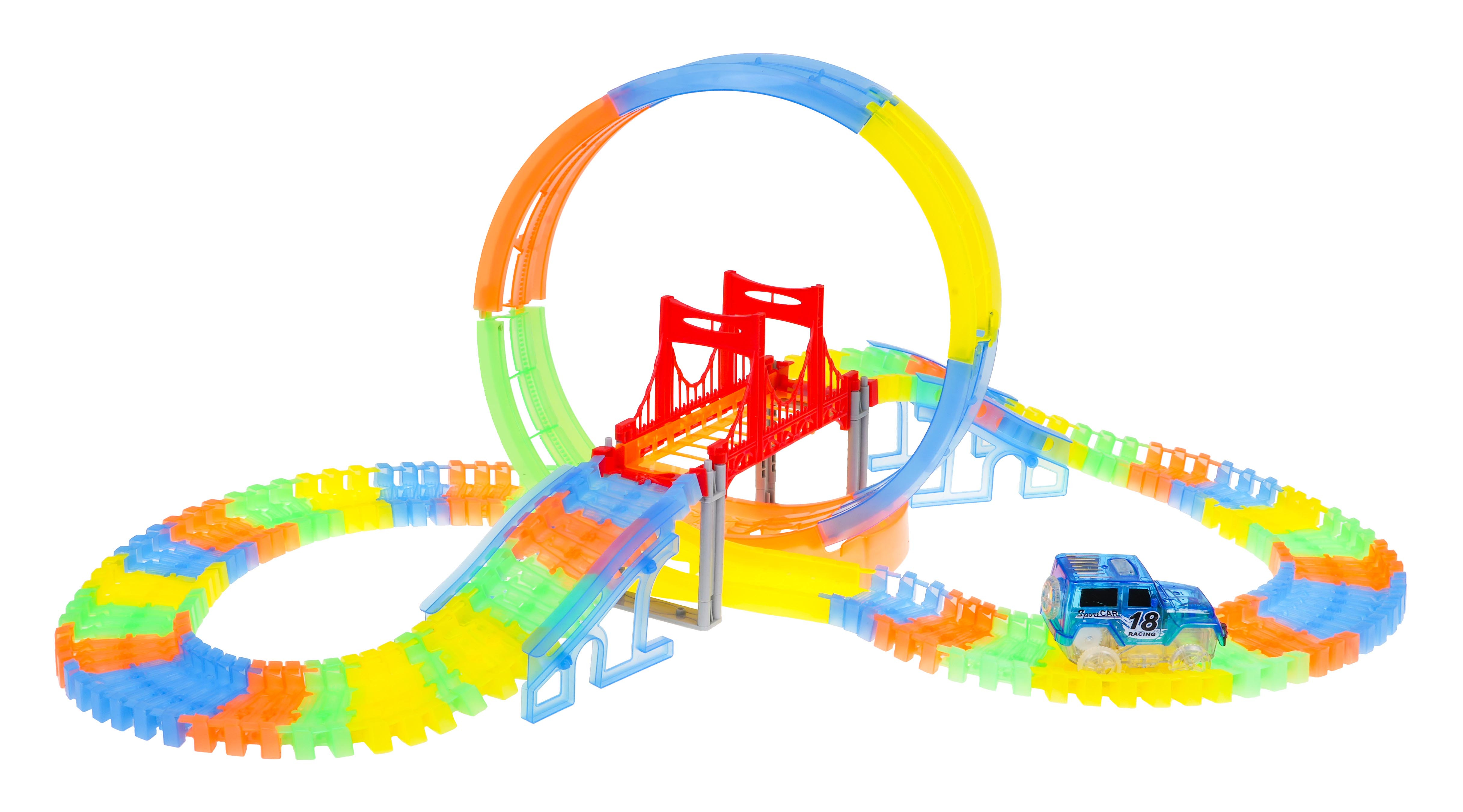 Svítící dráha se smyčkou a autíčkem v ceně je vhodná pro děti od 3 let. Pásy jsou flexibilní, lze je libovolně kombinovat, otáčet, zvedat, přeskupovat, a to vše za jízdy.kromě toho jsou stopy fluorescenční a ve tmě svítí. Vozidlo, které je součástí sady, má podsvícení LED, jízda ve tmě vytváří úžasný efekt. Vozidlo je napájeno 2 bateriemi AA 1,5 V (nejsou součástí balení). Vůz nastartujete stisknutím tlačítka na střeše.