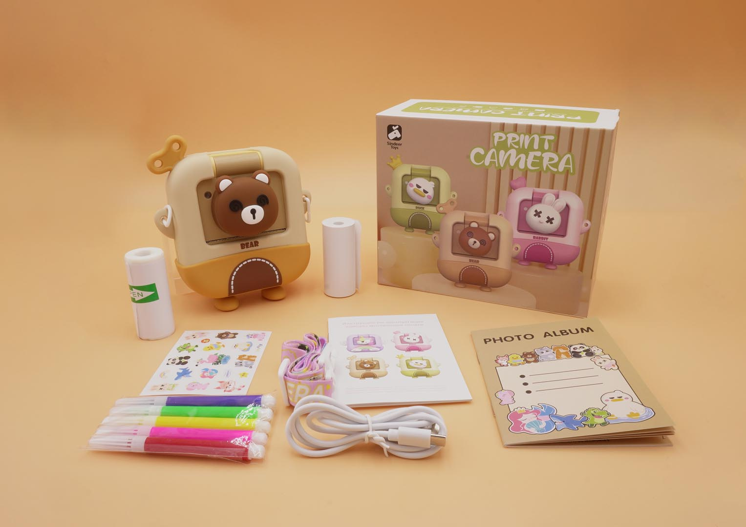 Sada fotoaparátu s funkcí okamžitého termálního tisku a příslušenstvím pro děti od tří let. Fotoaparát po pořízení snímku okamžitě vytiskne černobílou fotografii. K sadě byly přiloženy barevné fixy, aby si vaše dítě mohlo vybarvit výtisk. Přístroj má slot na TV kartu, aby si vaše dítě mohlo uchovávat všechny fotografie a videa, protože tento model má také funkci nahrávání. Do sady, kromě dříve zmíněných popisovačů, byly přidány také 2 termální role, nabíjecí kabel, šňůrka, samolepky, album na fotografie. Přístroj je napájen akumulátorem typu 3,7 V (v balení).