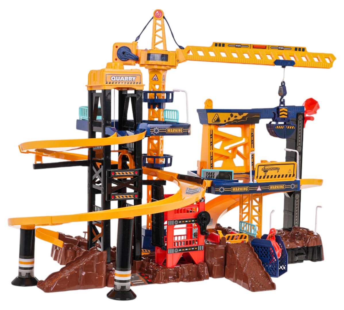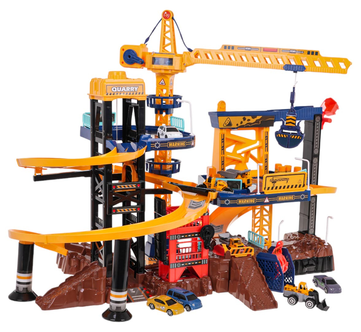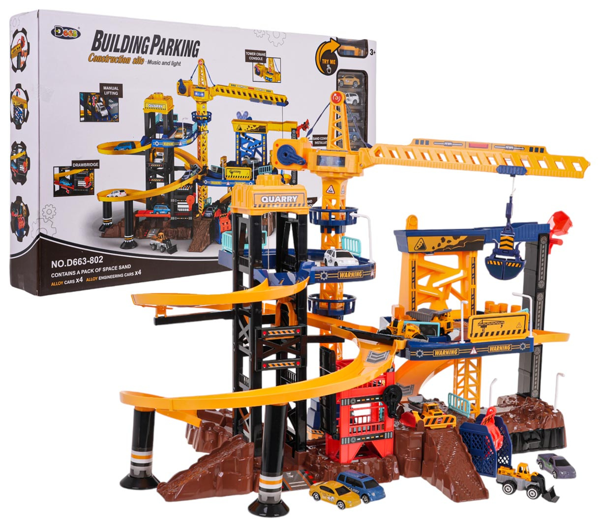 Sada navíc obsahuje čtyři auta, čtyři stavební vozidla, kinetický písek a stavební příslušenství. Hračka má zvukové a světelné efekty, díky nimž je každý herní zážitek ještě realističtější a poutavější.Po sestavení měří sada přibližně 80 x 55 x 46 cm a nabízí prostornou hrací plochu. Sada obsahuje jeřáb s pohyblivým ramenem a zvukovým panelem, ručně ovládaný výtah a padací most, který lze otevírat a zavírat pomocí speciální páky.