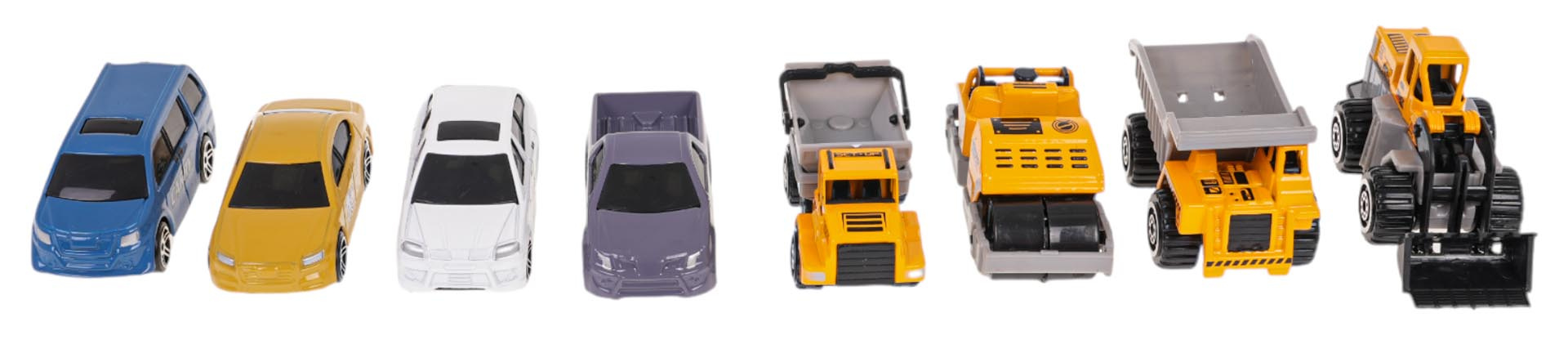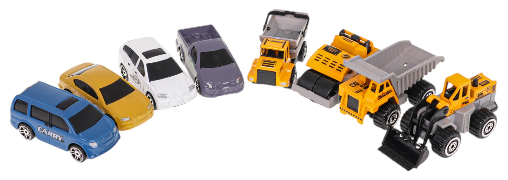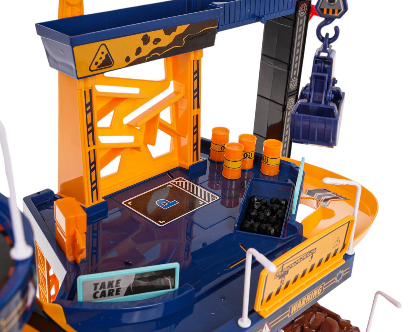 Součástí je také dopravní pás pro přepravu kamenů a mini skladovací prostor na písek pro uložení příslušenství. Sada obsahuje osm vozidel – čtyři auta a čtyři stavební stroje (buldozer, sklápěč, válec a transportní vozidlo), každé o velikosti ideální pro malé ručičky. Hračka je napájena třemi bateriemi AG13 (jsou součástí balení), které napájejí zvuky a světla, což umocňuje realistický pocit ze hry.