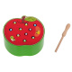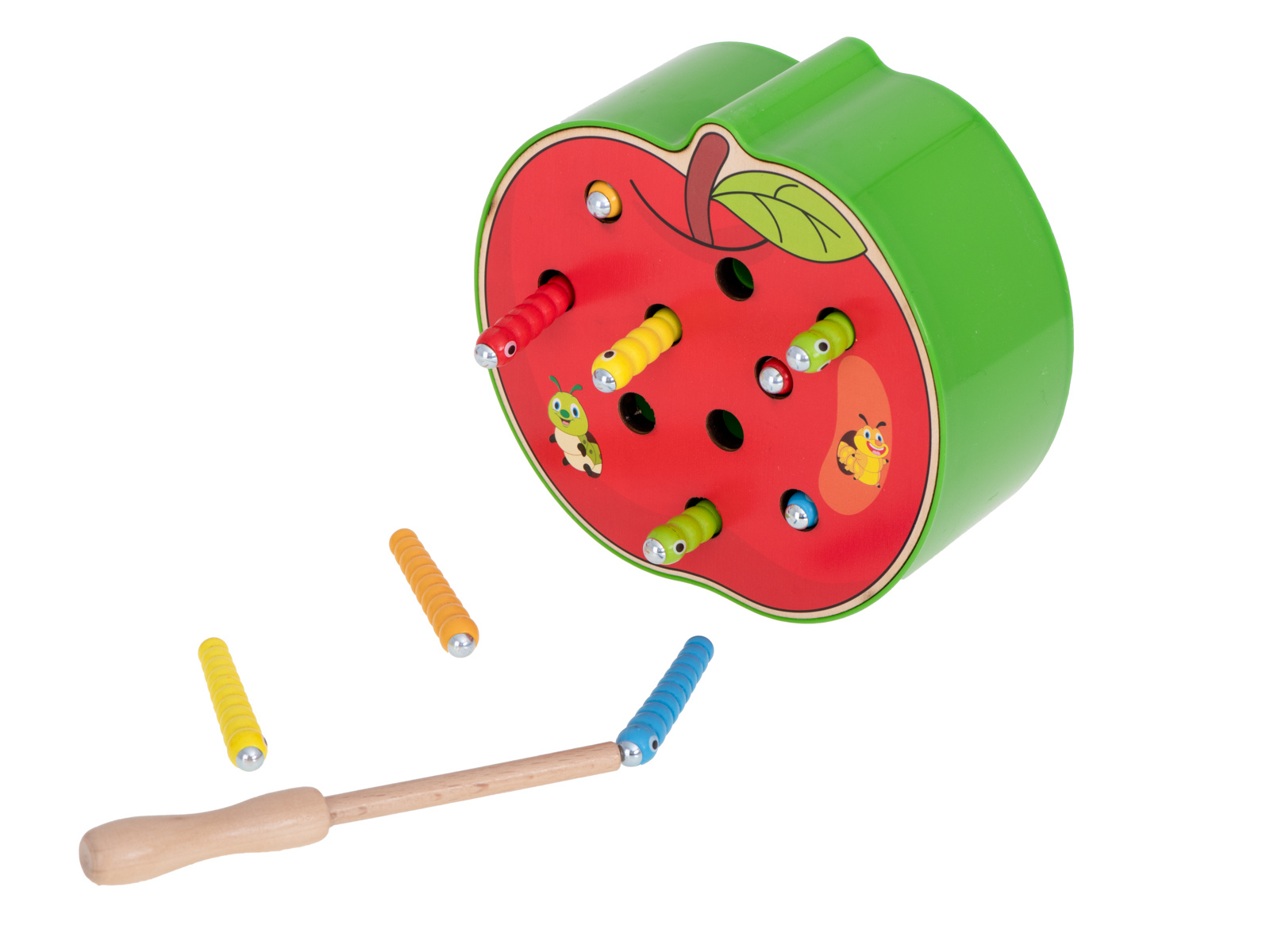 Hra je vyrobena ze dřeva, okraj základny je navíc vyztužen plastem. Součástí je základna ve tvaru jahody, která ukrývá 10 barevných housenek ze dřeva a kovu, dřevěnou hůlku s magnetem na konci. Úkolem dítěte je "chytit" housenky na magnet a odstranit je z podstavce. Obtížnější verze spočívá v umístění červů zpět do základny.