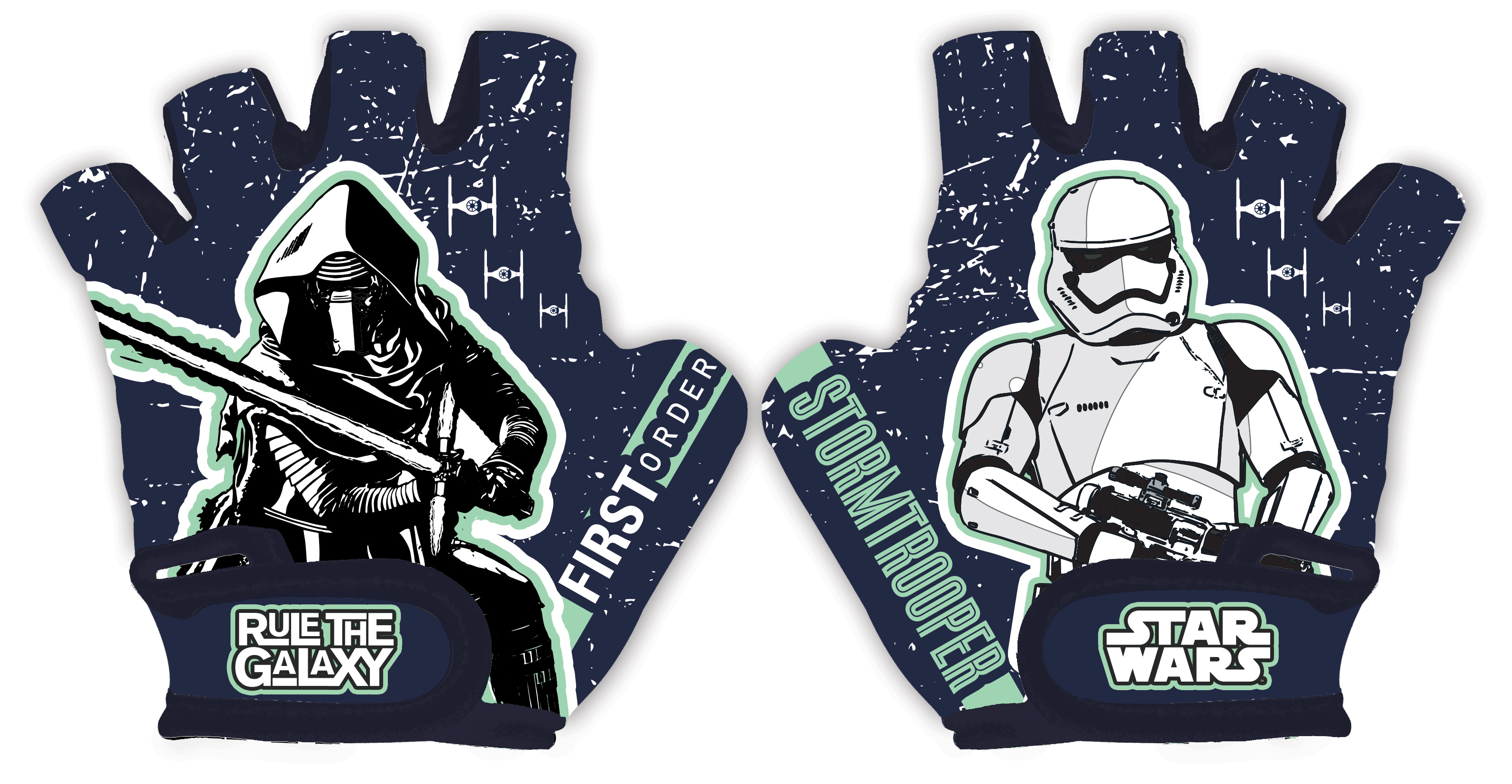 Cyklistické rukavice jsou vyrobeny z odolných materiálů s barevným potiskem, zdobené postavami ze Star Wars. Rukavice mají suché zipy, které umožňují přizpůsobení na ruku dítěte. Spodní část rukavice je lemována speciálním materiálem, který poskytuje dobré odpružení a umožňuje dítěti bezpečně držet volant.