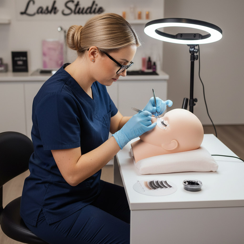 Profesionální tréninková hlava pro výuku aplikace umělých řas.