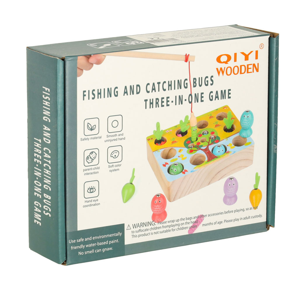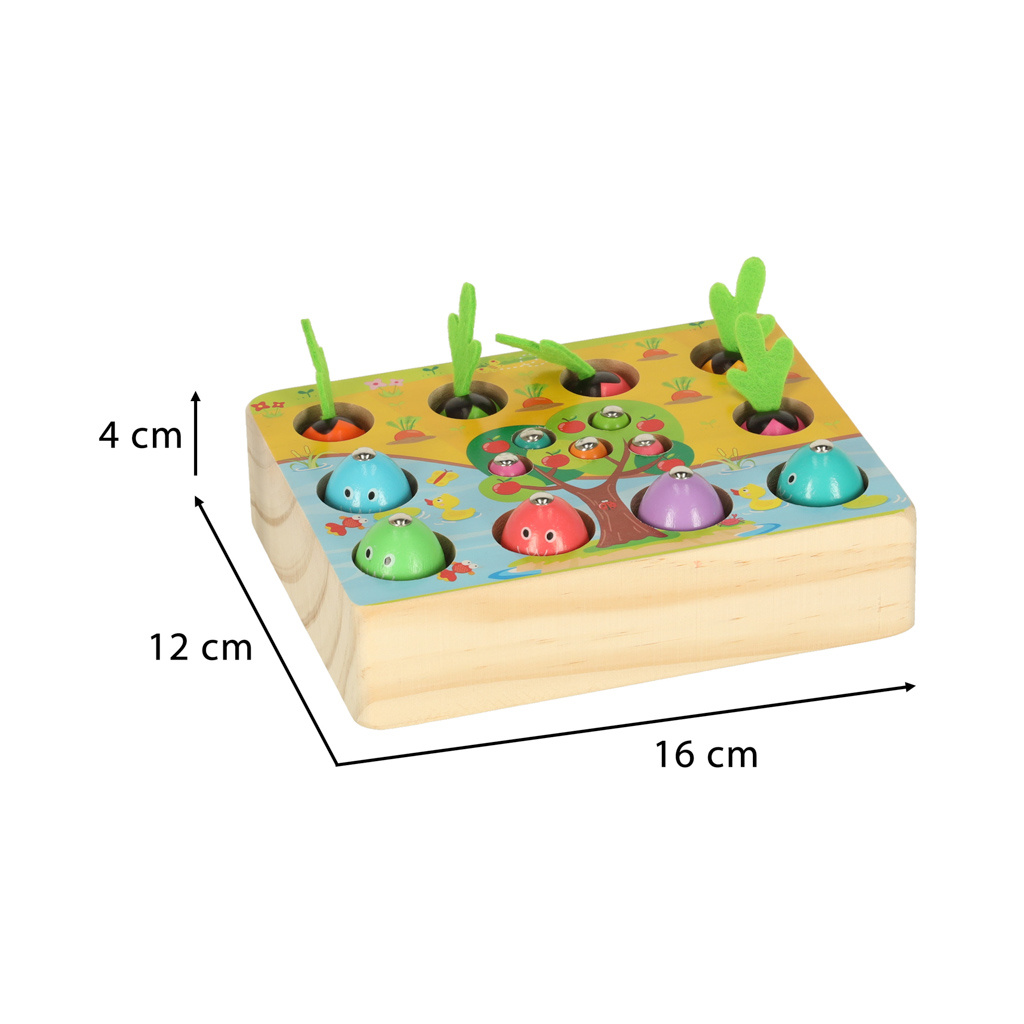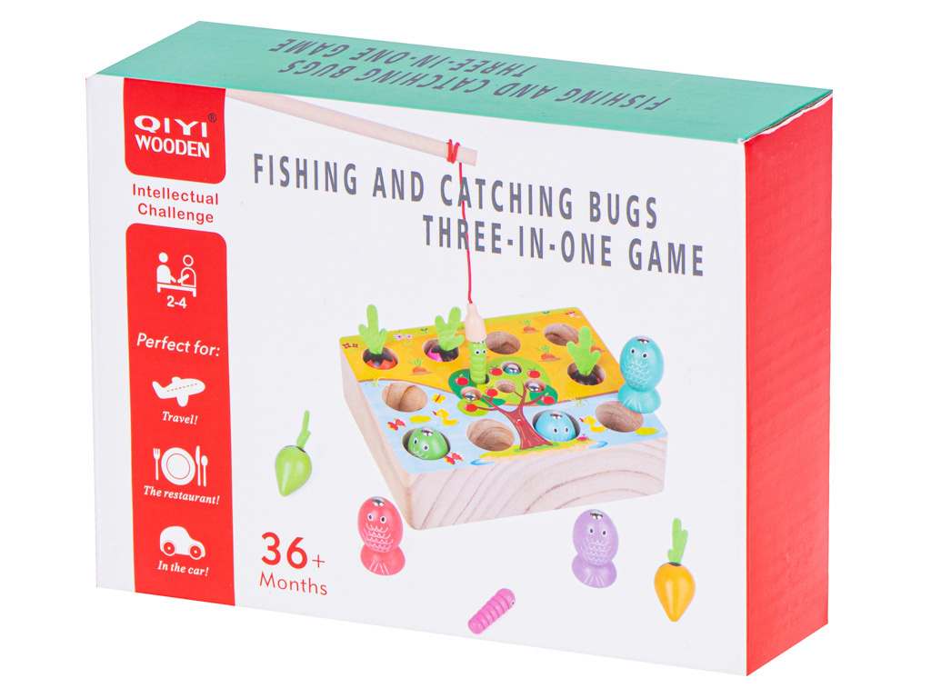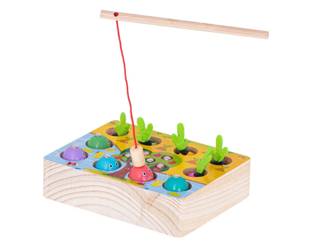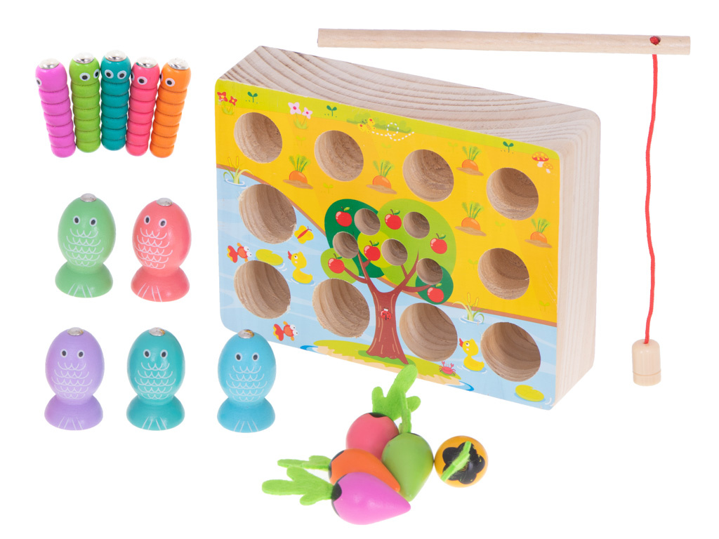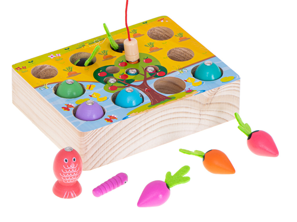 S touto magnetickou hrou se vaše dítě nejen pobaví, ale také si osvojí řadu důležitých a užitečných životních dovedností! Pravidla hry jsou velmi jednoduchá! pomocí magnetického rybářského prutu vytáhnete ryby nebo červy z příslušných otvorů v dřevěném podstavci! Kromě rybiček a žížal obsahuje základna i barevnou zeleninu, kterou lze z otvorů vytáhnout tak, že ji chytíte za plstěné listy! To bude stimulovat prstíky malých zahradníků a rozvíjet jejich schopnost rozpoznávat různé povrchy. K vytažení některého z magnetických dílků bude muset dítě prokázat velkou trpělivost a přesnost!