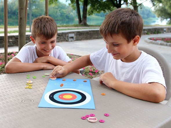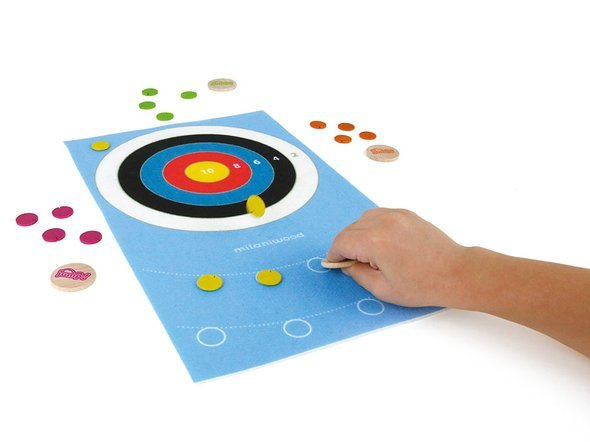 Návod: Umístěte plstěnou "desku" na rovný povrch a uhlaďte ji. Terč na lukostřeleckém terči se skládá z 5 soustředných kruhů, z nichž každý má jinou barvu a je mu přiřazeno jiné skóre: 2, 4, 6, 8 a 10. Na plstěné desce jsou kromě terče dvě čáry, ze kterých se bude střílet. Hráči si mohou vybrat, zda budou střílet z bližší nebo z vedlejší čáry. Vezměte si velký disk a 4 "šipky" (malé disky s otvory) stejné barvy. Umístěte jednu "šipku" na každý ze 4 kroužků na vybrané čáře. Vítězem se stává hráč s nejvyšším počtem bodů mezi hráči střílejícími ze stejné linie - Úplný návod ke hře je součástí balení.