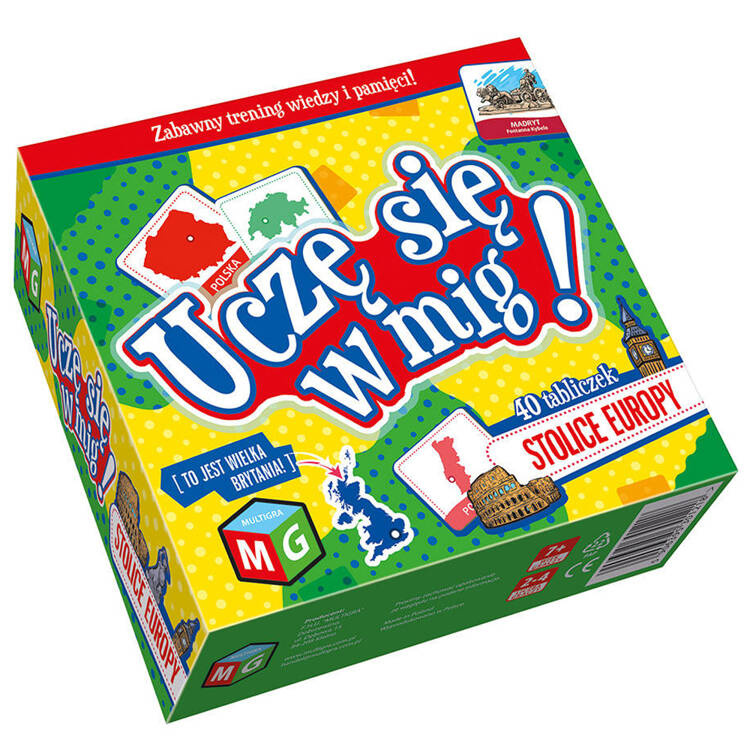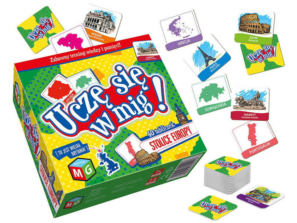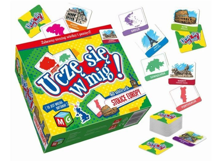 "UČÍM SE V MIGU - HLAVNÍ MĚSTA EVROPY" je skvělá hra, která rozvíjí paměť a postřeh vašeho dítěte. Kromě toho rozšíří jeho zeměpisné znalosti a pomůže v něm probudit povahu skutečného cestovatele, přičemž mu poskytne spoustu zábavy a vzrušení. Vítězem hry se stává ten, kdo si ze všech ilustrovaných destiček ležících na stole lícem nahoru nejlépe zapamatuje polohu dvojic zemí a jejich hlavních měst, které jsou na okamžik odkryté.