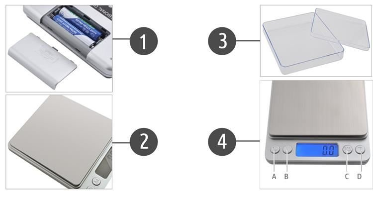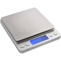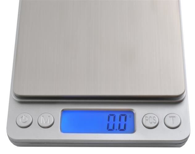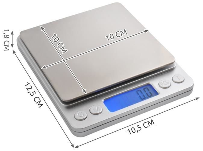 SPECIFIKACE - rozsah měření: 0-2kg ; přesnost měření: 0,1g; jednotky měření: g / oz / ozt / dwz / ct / gn / tl; materiál šátku: ocel; displej: modře podsvícený LCD; napájení: 2 x AAA baterie (součástí balení); hmotnostní rozměry (délka / šířka / tloušťka): 12,5x10,5x1,8 cm; rozměry pánve: 10x10 cm; vlastní hmotnost produktu: 300g.
