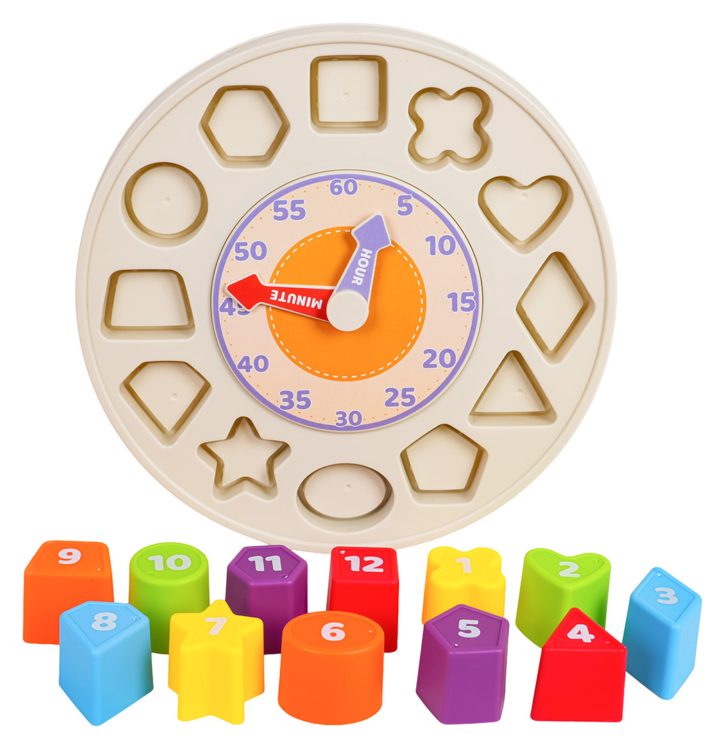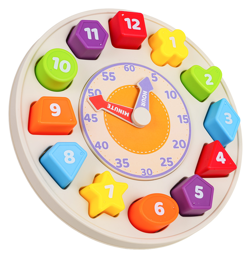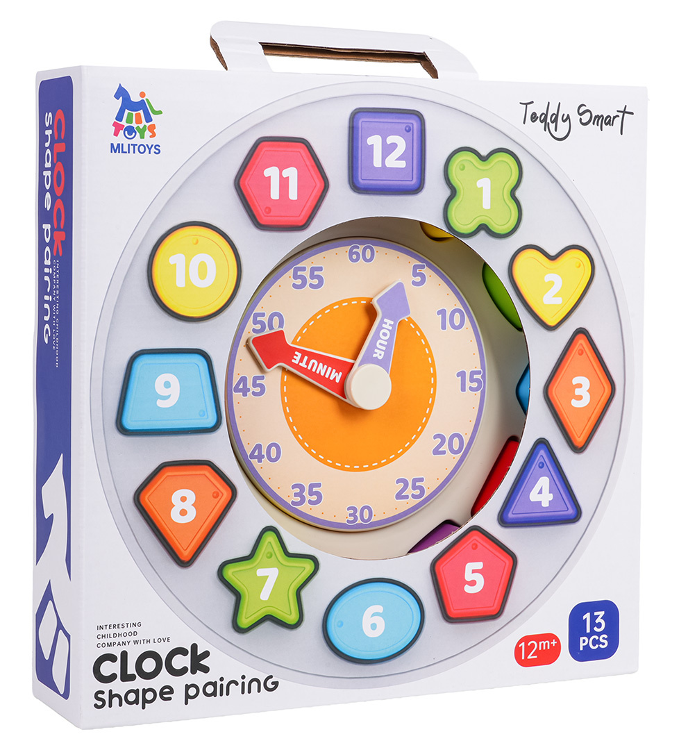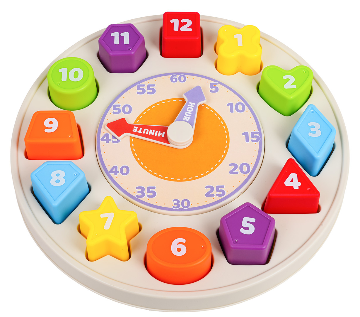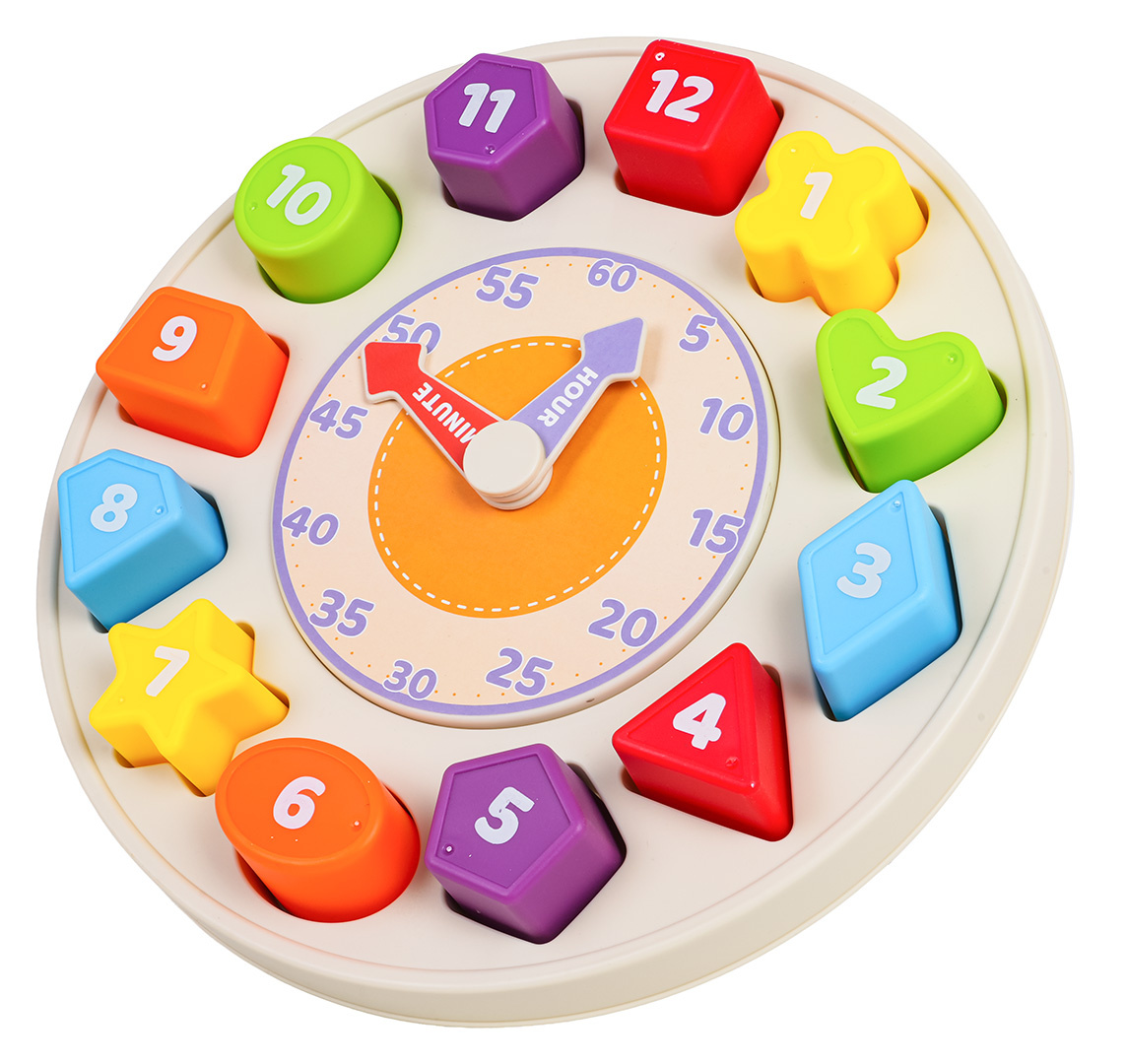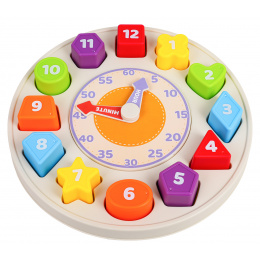 Vzdělávací hodiny s tvarovým třídičem pro nejmenší od dvanáctého měsíce života. Sada byla vyrobena z bezpečných materiálů v živých barvách. Na ciferníku můžeme najít pohyblivé ručičky a čísla od 5 do 60. Na vnější straně ciferníku se nachází třídič tvarů. Do prohlubní různých tvarů může malý umístit až 12 kostek. Každý kousek je označen číslem od 1 do 12. Díky této sadě se malý dítě prostřednictvím hry seznámí s hodinami, naučí se rozpoznávat minuty a hodiny, pozná různé tvary a barvy.