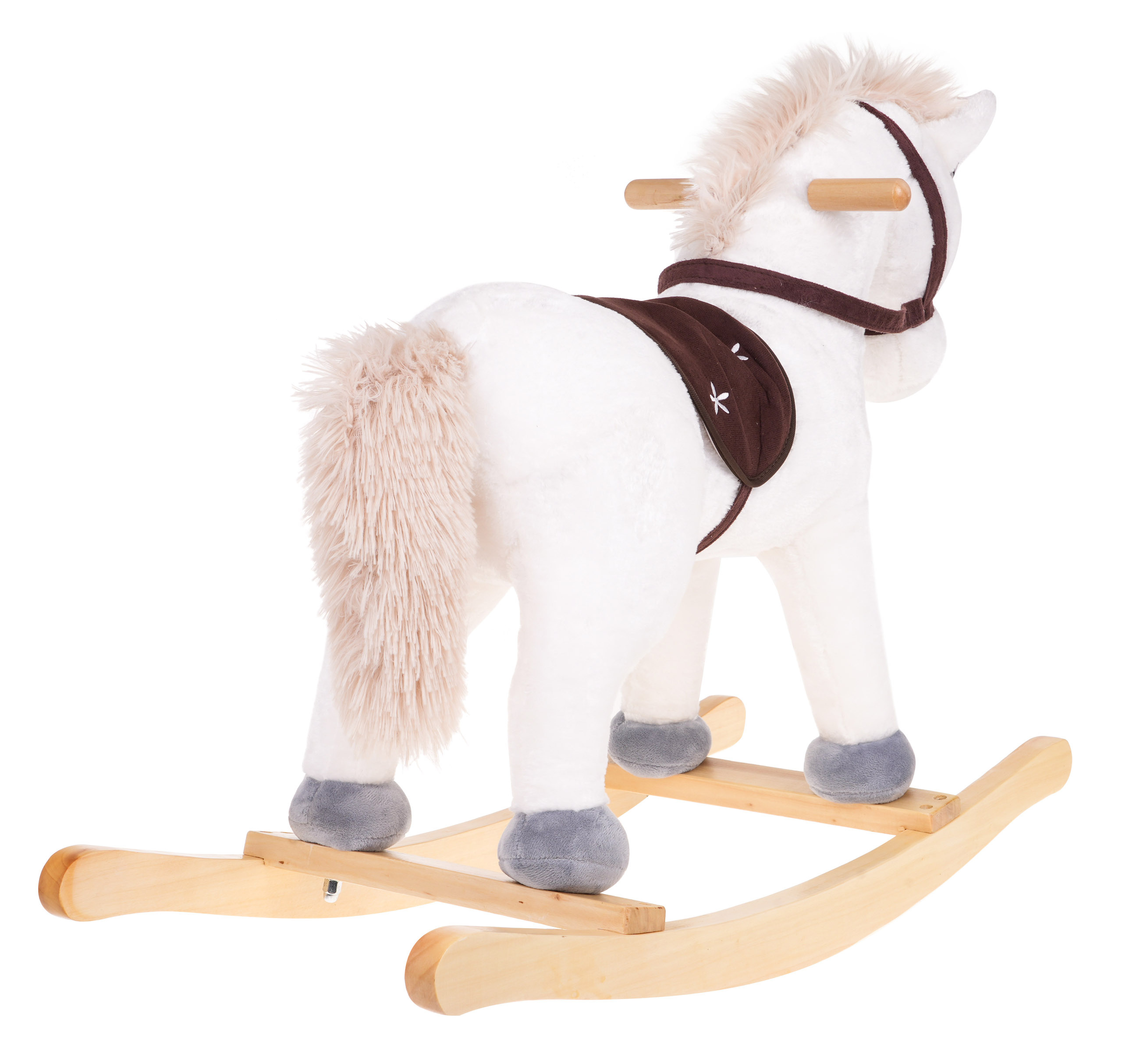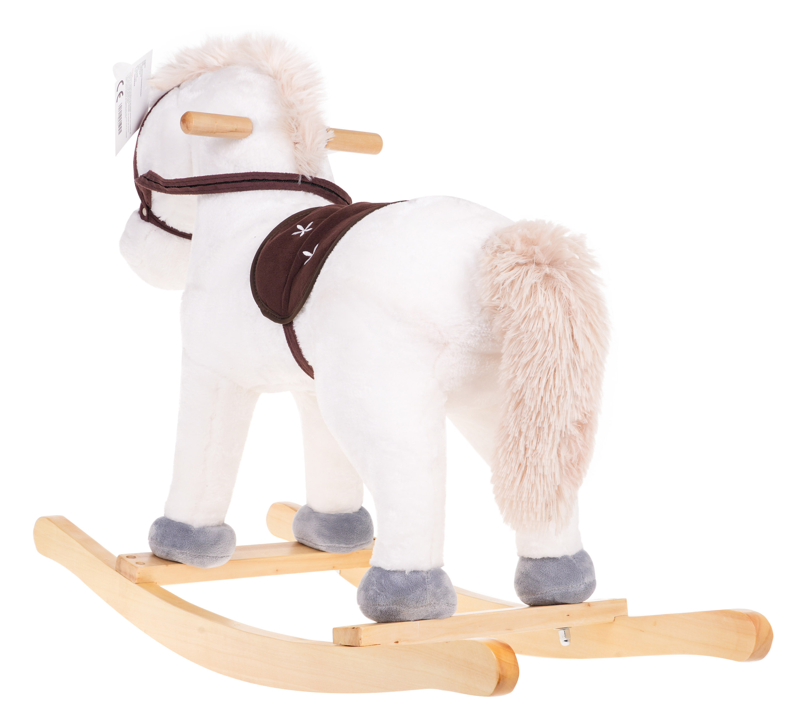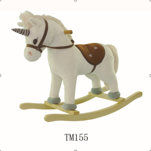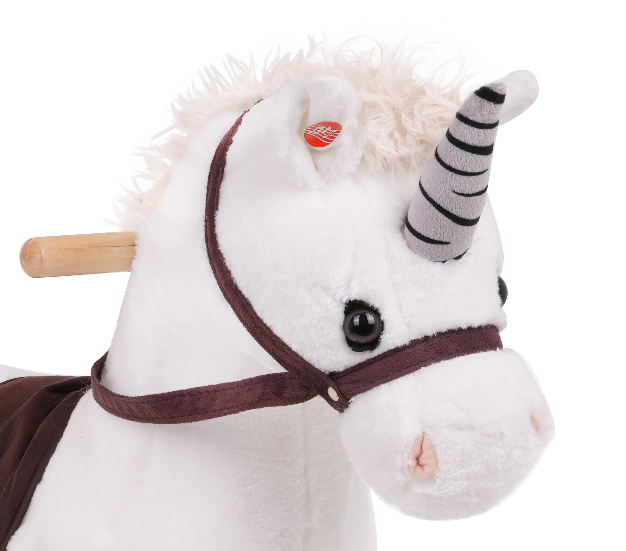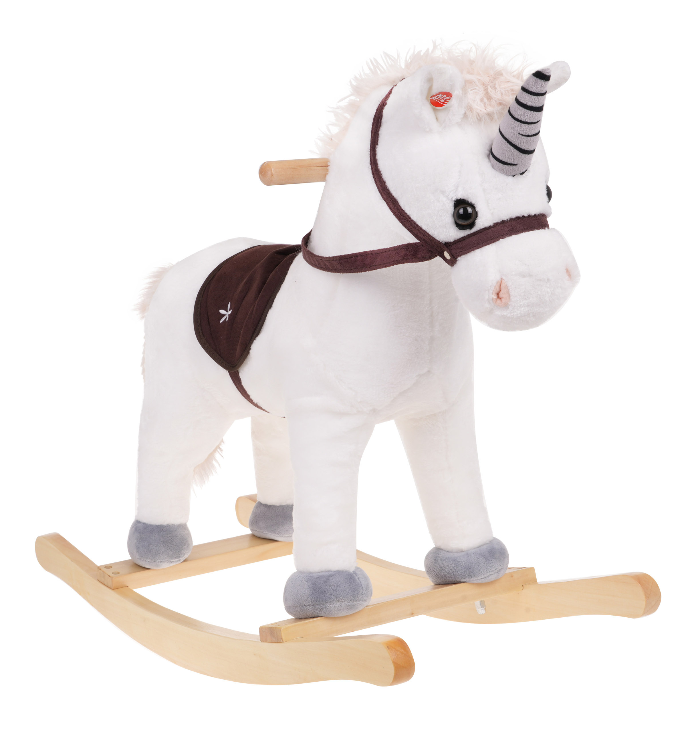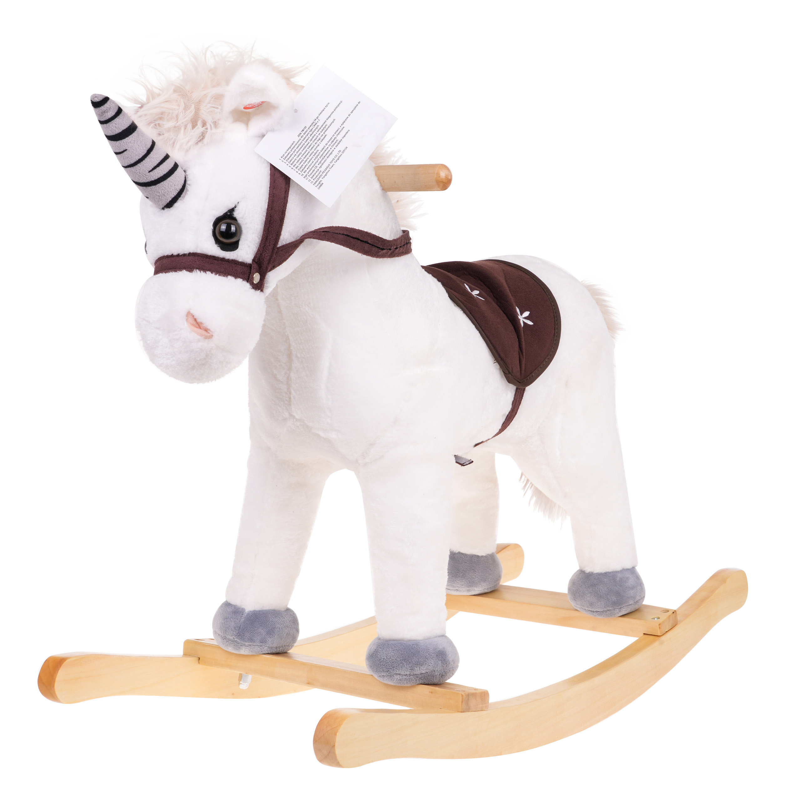 Krásný bílý houpací koník jednorožec se zvuky, pro děti od 24 měsíců. Hračka je vyrobena z materiálu příjemného na dotek, má pohodlné sedátko, dřevěné rukojeti a dřevěné ližiny. Na pravém a levém uchu koně jsou senzory, které spouštějí zvuky ržání a cvalu. Hračka je napájena 3 bateriemi LR44, které jsou součástí balení.