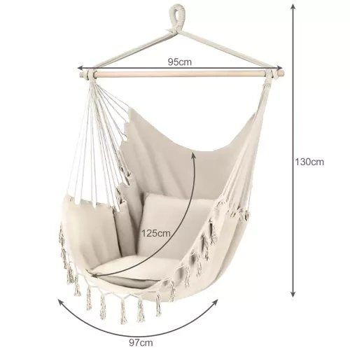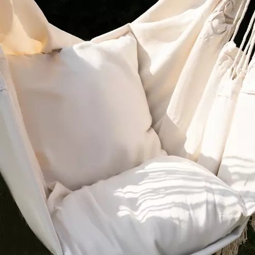 ODOLNÝ MATERIÁL - 65% bavlna zajišťuje správnou ventilaci , což ovlivňujekomfort používání závěsného křesla i v horkých dnech . Za pevnost sedáku je zodpovědná 35% příměs polyesteru. Pevnýmontážní kolo je připojeno kodolná lana , rovnoměrně rozmístěná po stranách houpací sítě přes dřevěnou příčku. Tato konstrukce tvoří celeksnadno se zavěsí a houpací síť je dobře vyvážená a stabilní .