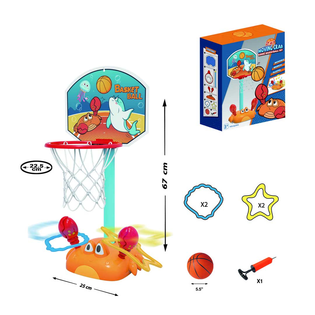 Hra na zručnost 2v1 basketbal a ringo pro děti od 3 let. Hra je vyrobena z nejkvalitnějších materiálů v živých barvách, které přitahují pozornost dítěte. Utíkající krab zve ke hře. Základem hry je krab s klepety, na které se hází kroužky, které jsou součástí sady. Nad krabem se nachází koš na basketbal. Aby ztížit úkol, veselý krab nestojí na místě, ale utíká doprava a doleva. Dítě musí prokázat chytrost, rychlost a přesnost. Hračka je napájena bateriemi typu 3 x AA 1,5 V (nejsou součástí balení).