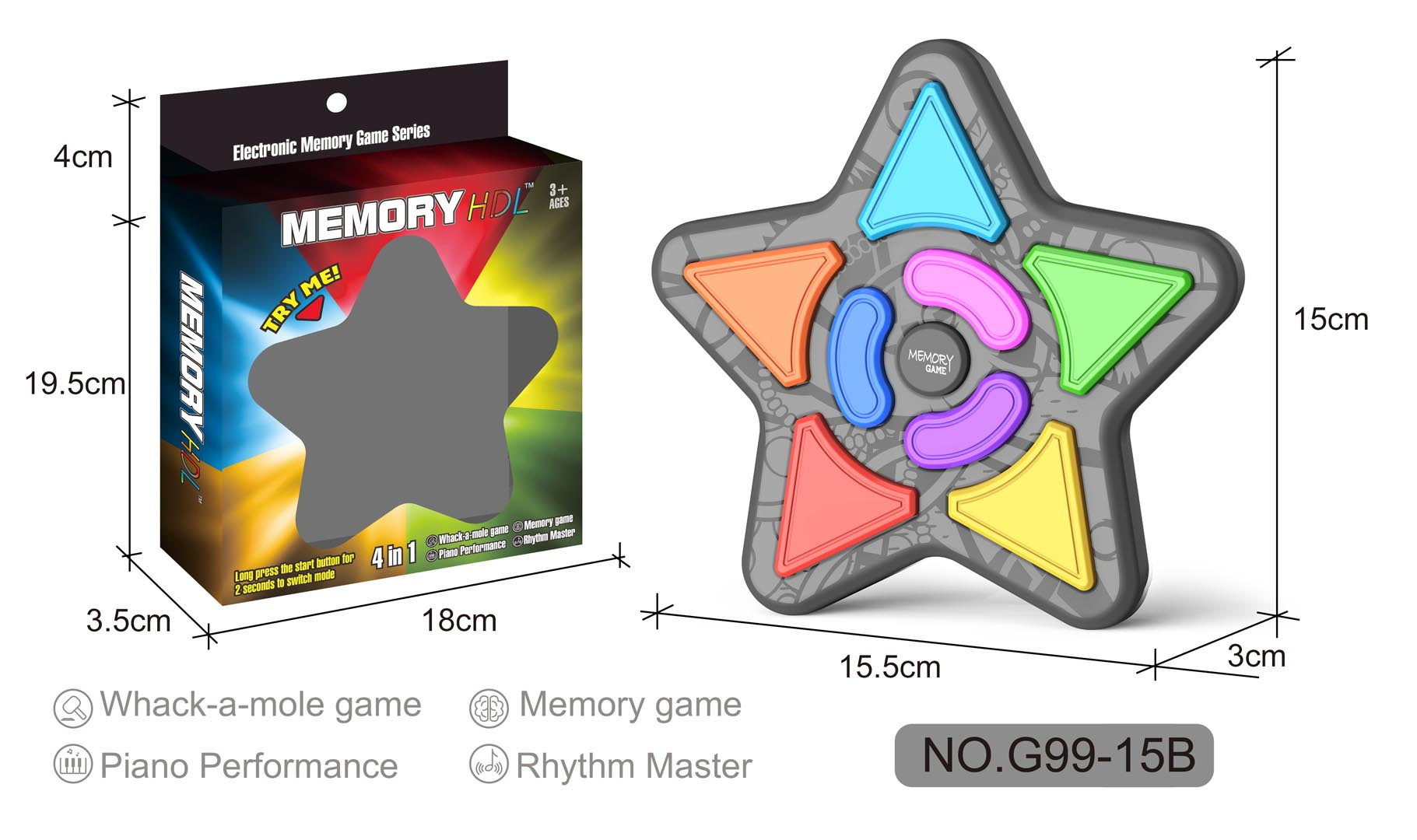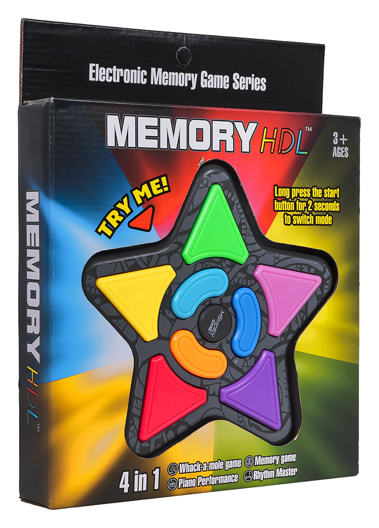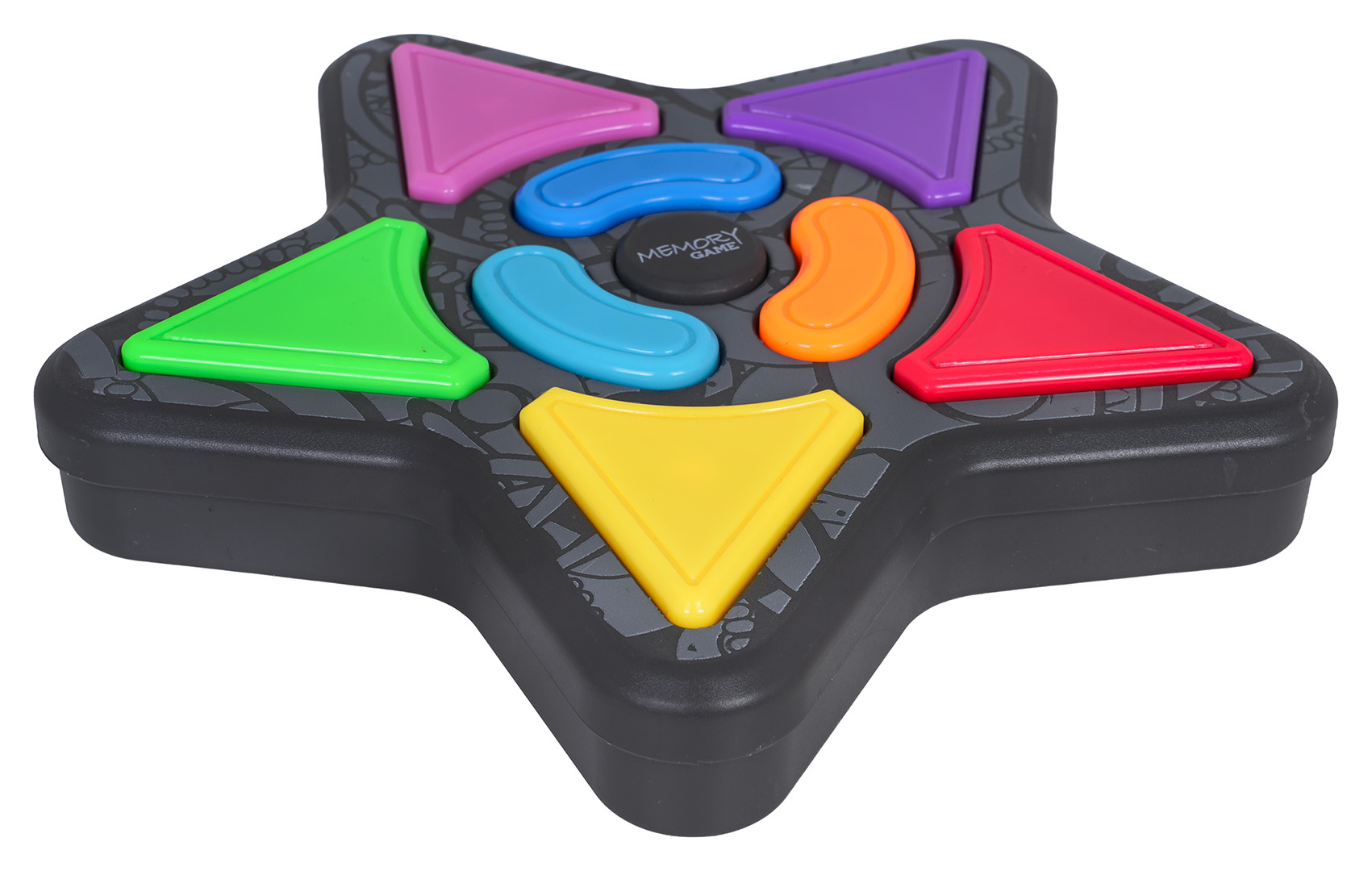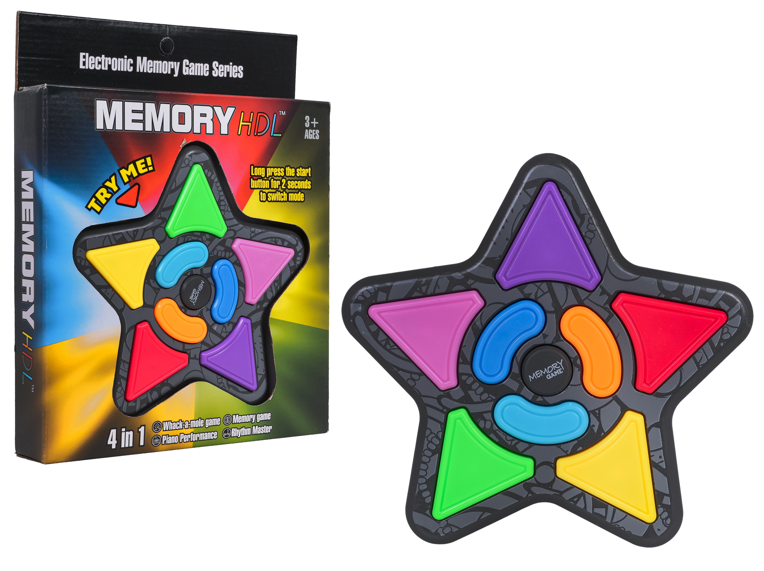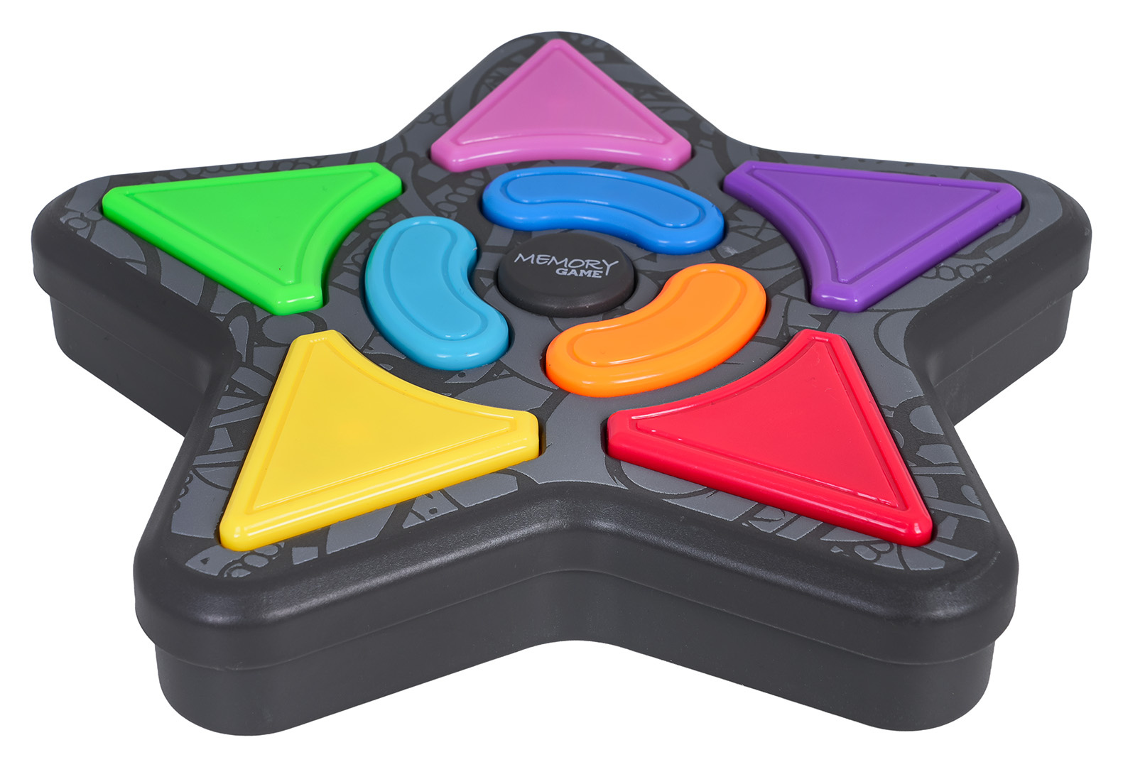 Elektronická, logická kapesní hra ve tvaru hvězdy Memory pro děti od tří let. Tato populární hra spočívá v opakování sekvence dříve zobrazených barev. Hru začneme stisknutím velkého tlačítka MEMORY umístěného uprostřed hry. Následně počítač ukazuje – podsvěcuje barevná pole, která je třeba zopakovat. S každou sekvencí se úroveň obtížnosti zvyšuje. V případě chyby je slyšet charakteristický zvuk a hru je třeba začít znovu. Zařízení nabízí až 4 různé herní režimy, které měníme podržením prostředního tlačítka. Další výhodou hry je její malá velikost, takže ji můžete schovat do kapsy a vzít si ji s sebou prakticky kamkoli. Hra je napájena bateriemi typu 2 x AA (baterie jsou součástí balení).