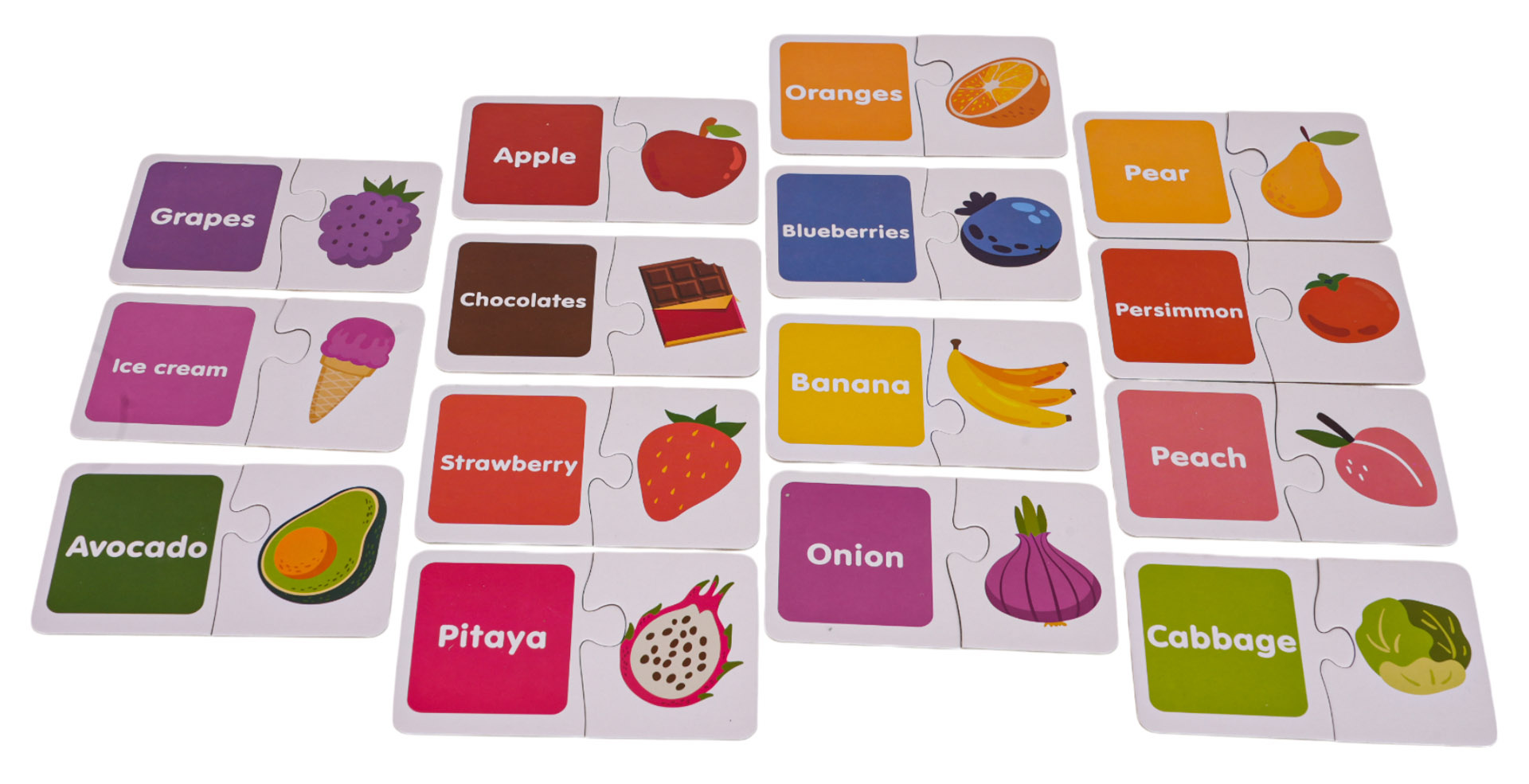 Jeden dílek skládačky obsahuje obrázek ovoce a druhý jeho název v angličtině, což povzbuzuje k přiřazování a objevování nových slov. Zářivé barvy a estetické ilustrace dělají učení zábavným a poutavým.