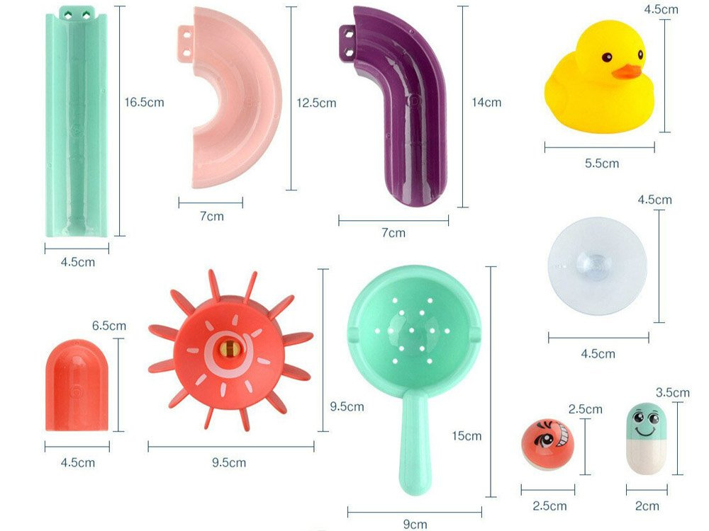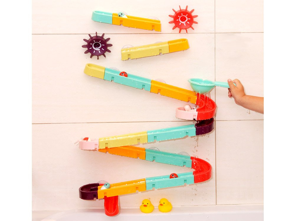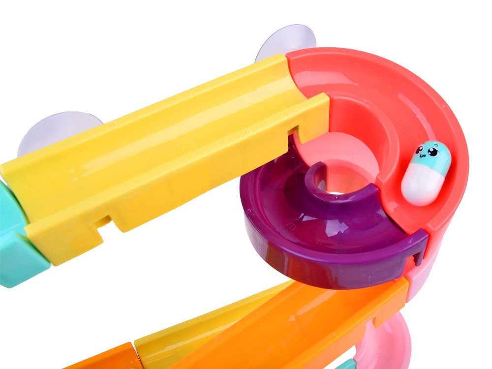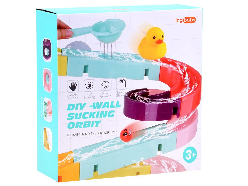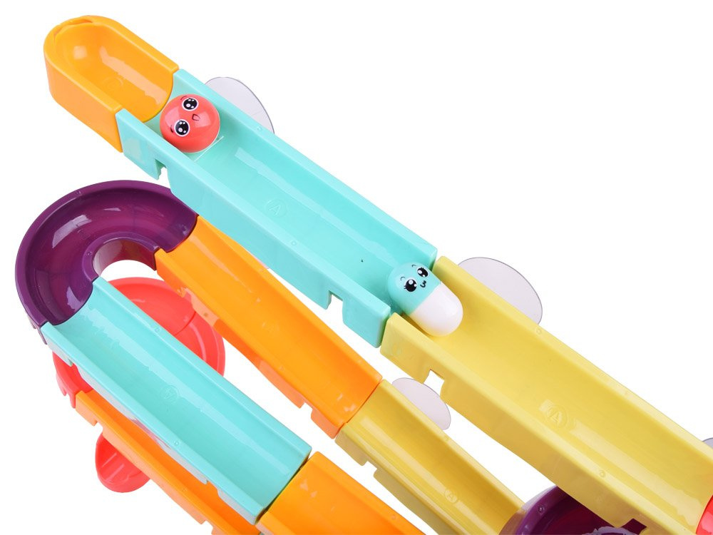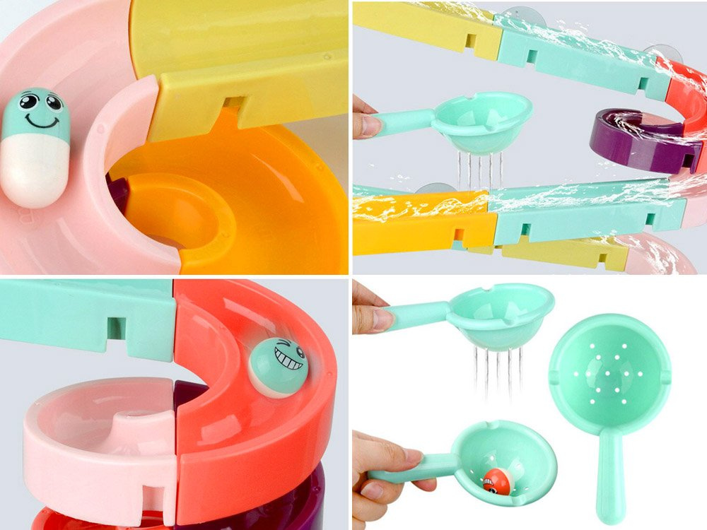Sada je vyrobena z plastu a má silikonové přísavky, takže dráhu lze připevnit k obkladům v koupelně. Součástí balení jsou barevné dílky k sestavení točité dráhy, gumové kachničky, míčky, fazole a sítko. Při koupání může dítě vymýšlet fantastické hry s prchající kachničkou, honícím míčkem a válci, které lze přilepit vedle sebe, aby dítě mohlo točit oběma najednou. Sada se skládá ze 44 dílků, ze kterých si můžete postavit skluzavku.