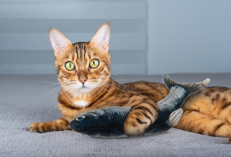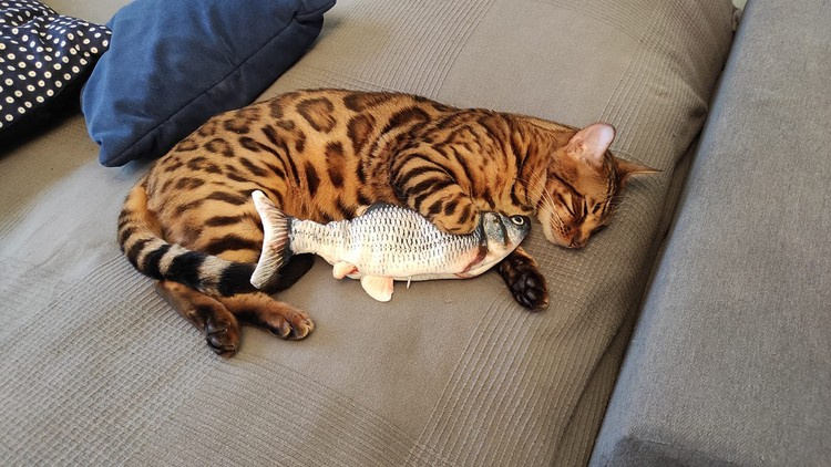 3D plyšová skákací ryba spouští přirozený lovecký instinkt kočky. Vzhled, tvar a mechanika ovládání napodobují pohyb skutečné ryby. Ryba reaguje pohybem pokaždé, když se jí kočka dotkne tlapkou. Pokud se kotě přestane ryby dotýkat - po chvíli se přestane pohybovat (dokud se znovu nedotkne).