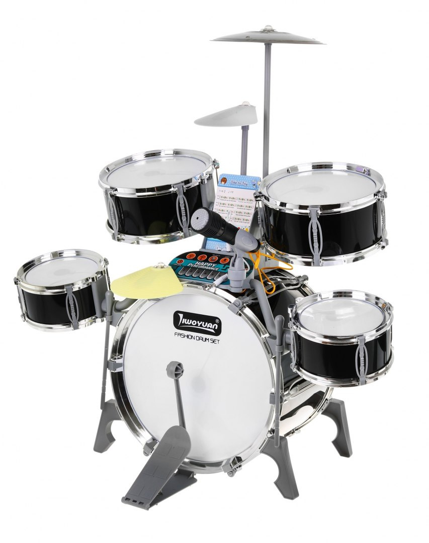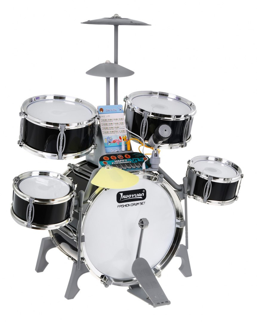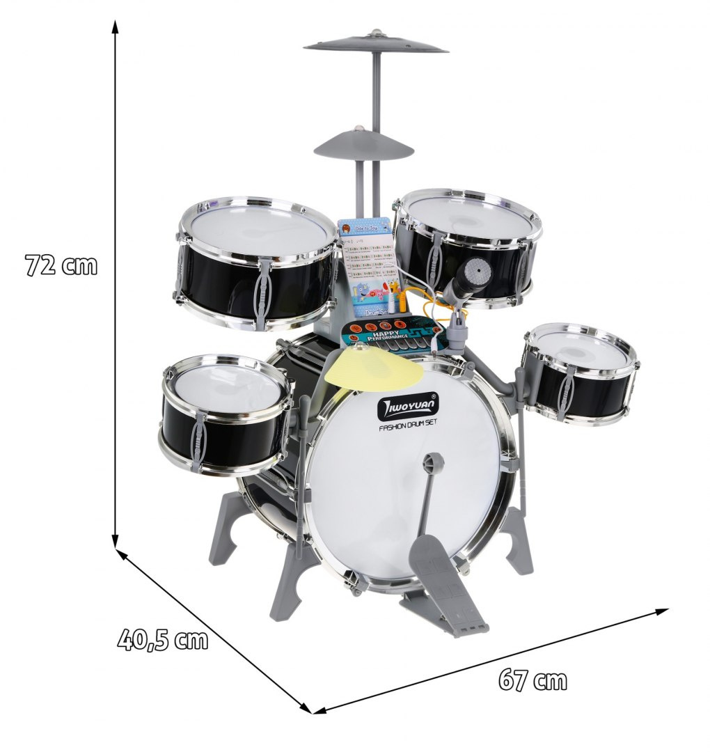Multifunkční velké perkuse s profesionálním zvukem a osvětlenými bubny jsou hračkou pro děti od 3 let. Bubny mají 5 bubnů, 2 elektronické činely (plastové) a jeden kovový činel, ovládací panel, mikrofon, 2 paličky a 6 notových karet pro výuku hry. Součástí je také pohodlná stolička. Tento senzační buben je napájen 3 bateriemi AA, ale lze jej nabíjet i přes USB.