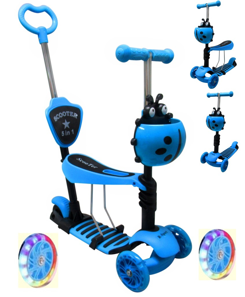 S připevněným sedátkem poslouží zároveň jako odrážedlo. Koloběžka má navíc svítící LED kolečka a je zde možnost nainstalovat vodící tyč a mít koloběžku plně pod kontrolou. Koloběžka je opatřena několika bezpečnostními a ochrannými prvky jako jsou např. prostorná nášlapná deska s neklouzavou úpravou, protiskluzové rukojeti řídítek a nášlapná zadní brzda.