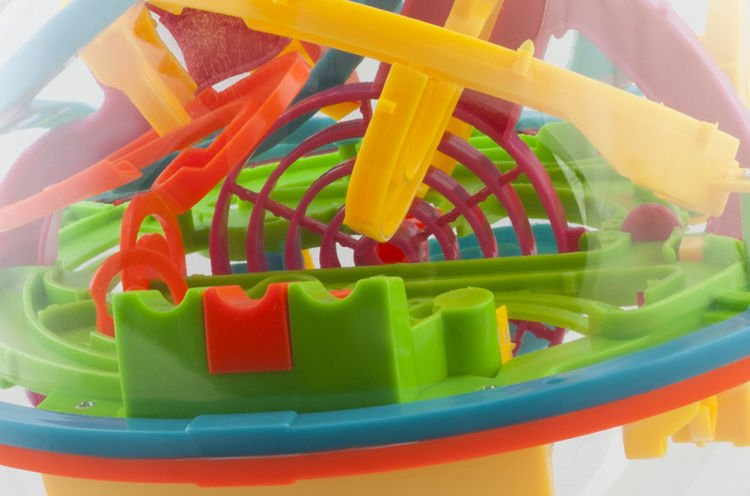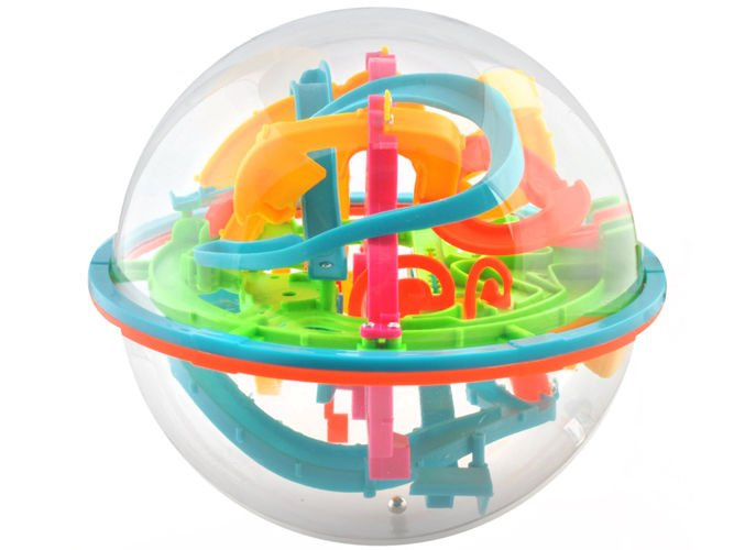 Průhledná koule s barevným bludištěm s mnoha zatáčkami, tunely, sjezdy a malou kuličkou uvnitř. Měl by být veden labyrintovými uličkami k cíli pomocí pohybů rukou, vyhýbat se nejrůznějším překážkám.