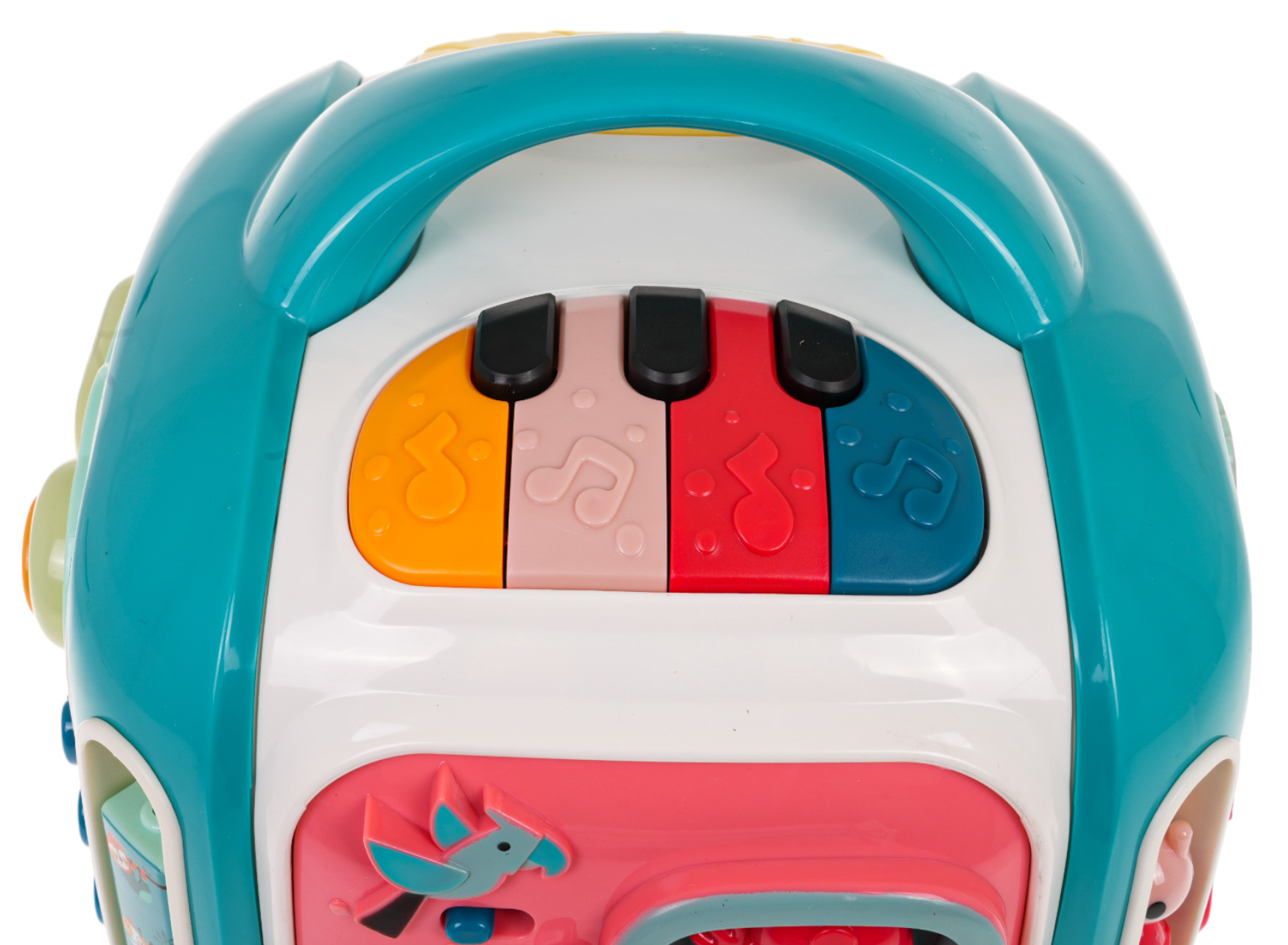 - po stranách kostky se nacházejí oblouky s otočnými prvky pro cvičení prstíků dítěte.