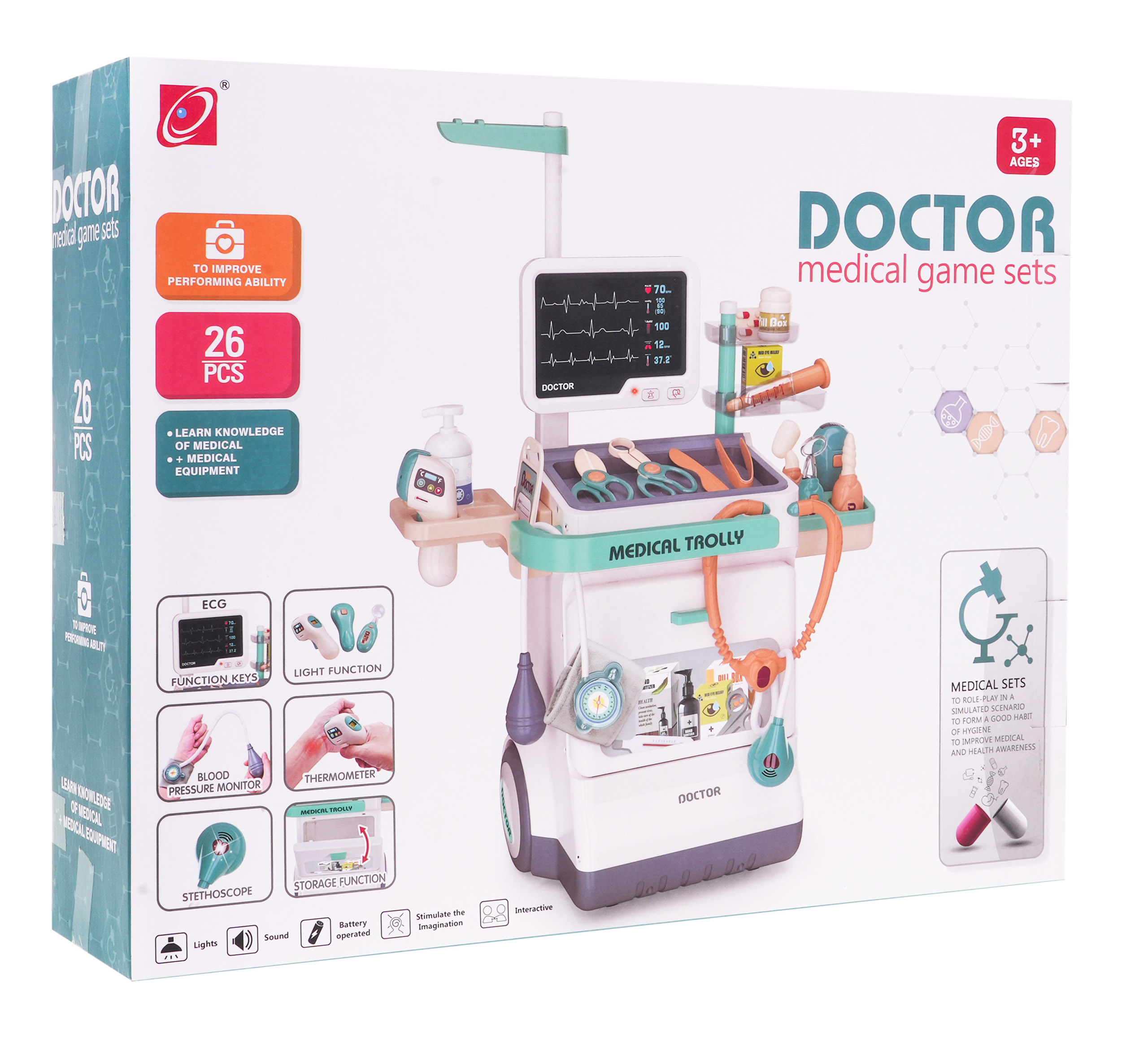 Interaktivní, dobře vybavená doktorská sada s lékařským vozíkem a příslušenstvím je určena pro děti od 3 let. S touto sadou se dítě může vžít do role očního lékaře, internisty, kardiologa nebo zubaře. Velký zdravotnický vozík, na který můžeme umístit veškeré zdravotnické příslušenství, je lehký a snadno se přemisťuje díky dvěma hladkým a velkým kolečkům a praktickému madlu. Velké množství zdravotnických pomůcek má interaktivní zvukové a světelné efekty, které zvyšují atraktivitu výrobku. Panel monitorovací obrazovky je napájen 2 bateriemi AAA 1,5 V, které nejsou součástí dodávky. Teploměr s bateriemi 2 x LR44 (součást dodávky), zubní zrcátko s bateriemi 2 x L1130 (součást dodávky), stetoskop s bateriemi 2 x LT44 (součást dodávky).