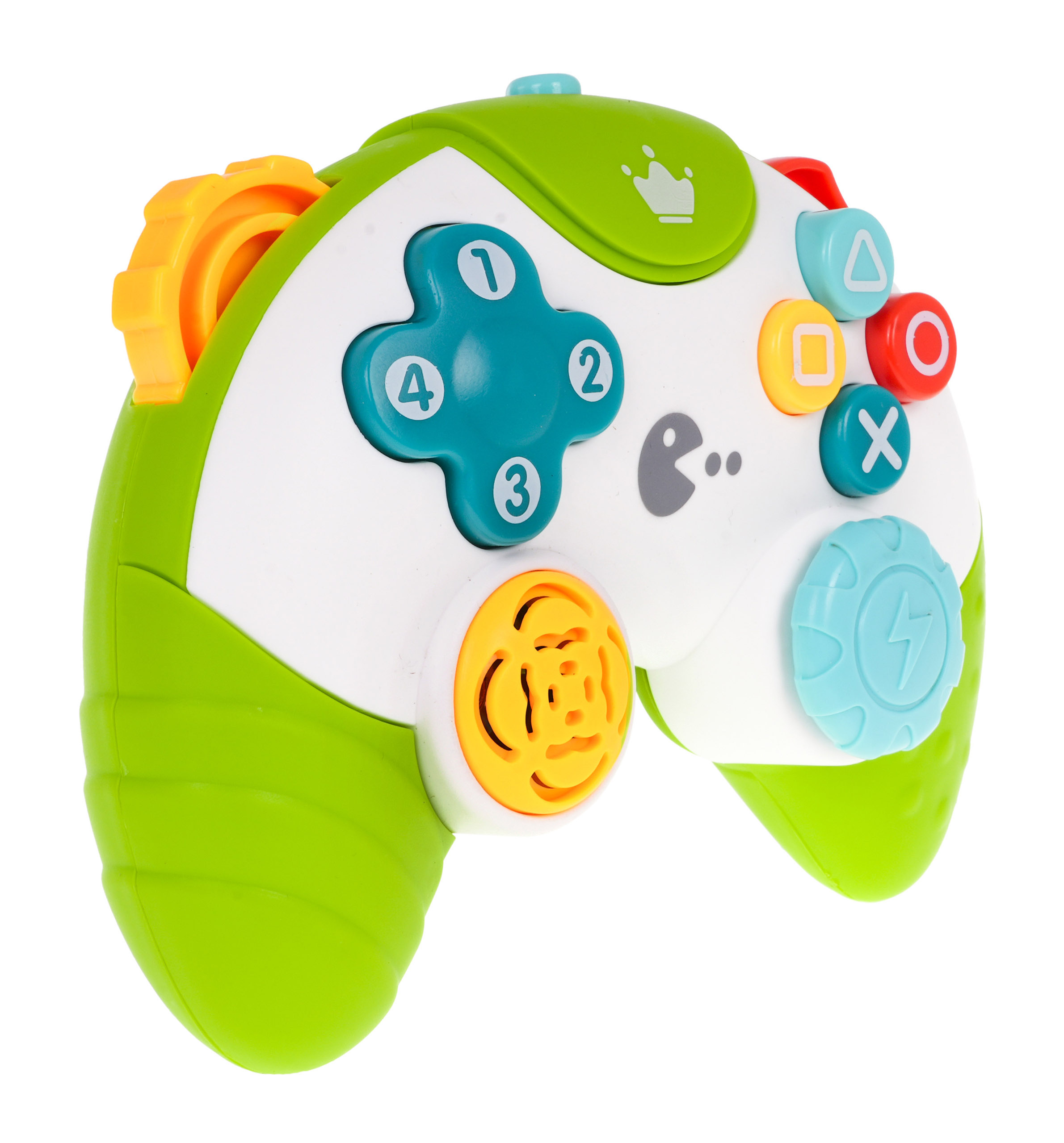 Podložka pod hračky - ovladač pro nejmenší od 18 měsíců. Hračka je vyrobena v živých barvách, které přitahují dětské oči, a veselé zvuky podporují hru. Na horní straně podložky se nachází kolečko a půlměsíc pro otáčení a vydávání zvuků cvakání. Na přední straně ovladače jsou na levé straně umístěna čísla 1 až 4, která po stisknutí vydávají legrační zvuky. Vlevo dole se nachází žluté tlačítko s reproduktorem. Na pravé straně ovladače jsou tlačítka s kruhem, křížem, čtvercem a trojúhelníkem, která po stisknutí přehrávají různé melodie. Vpravo dole na podložce je modré tlačítko s bleskem, které vydává zvuk nástrojů. Zvukové efekty v hračce jsou doprovázeny světelnými efekty. Po stisknutí některého z tlačítek se rozsvítí kresba umístěná uprostřed hračky. Hračka je napájena 2 bateriemi AAA 1,5 V, které jsou součástí balení.
