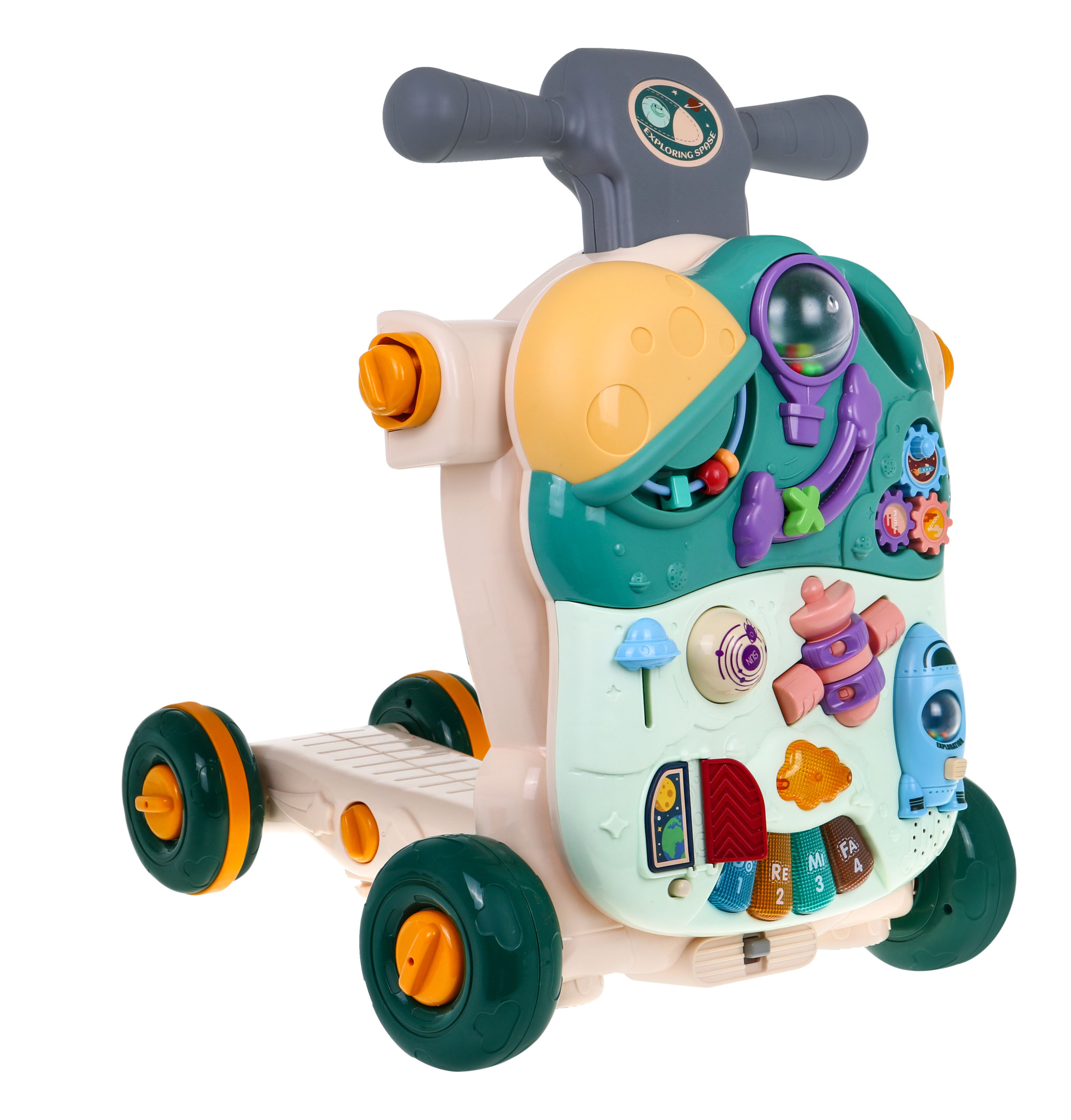Interaktivní multifunkční chodítko 4 v 1 se zvukovými a světelnými efekty je hračka pro děti od 18 měsíců. Je vyrobena z plastu bezpečného pro děti, rozmanitost barev přitahuje oči batolat a vybízí ke hře. Chodítko lze přeměnit na skateboard, vozítko nebo multifunkční stůl. Hračka je napájena 3 bateriemi AA 1,5 V (nejsou součástí balení).Celý popis