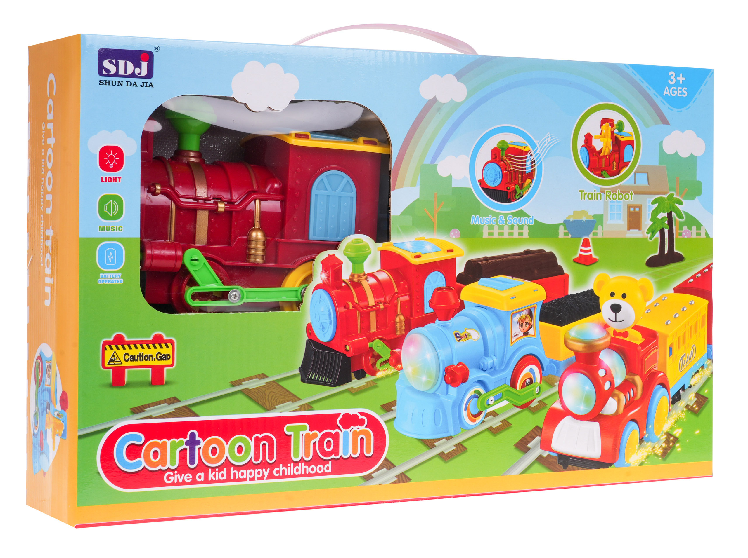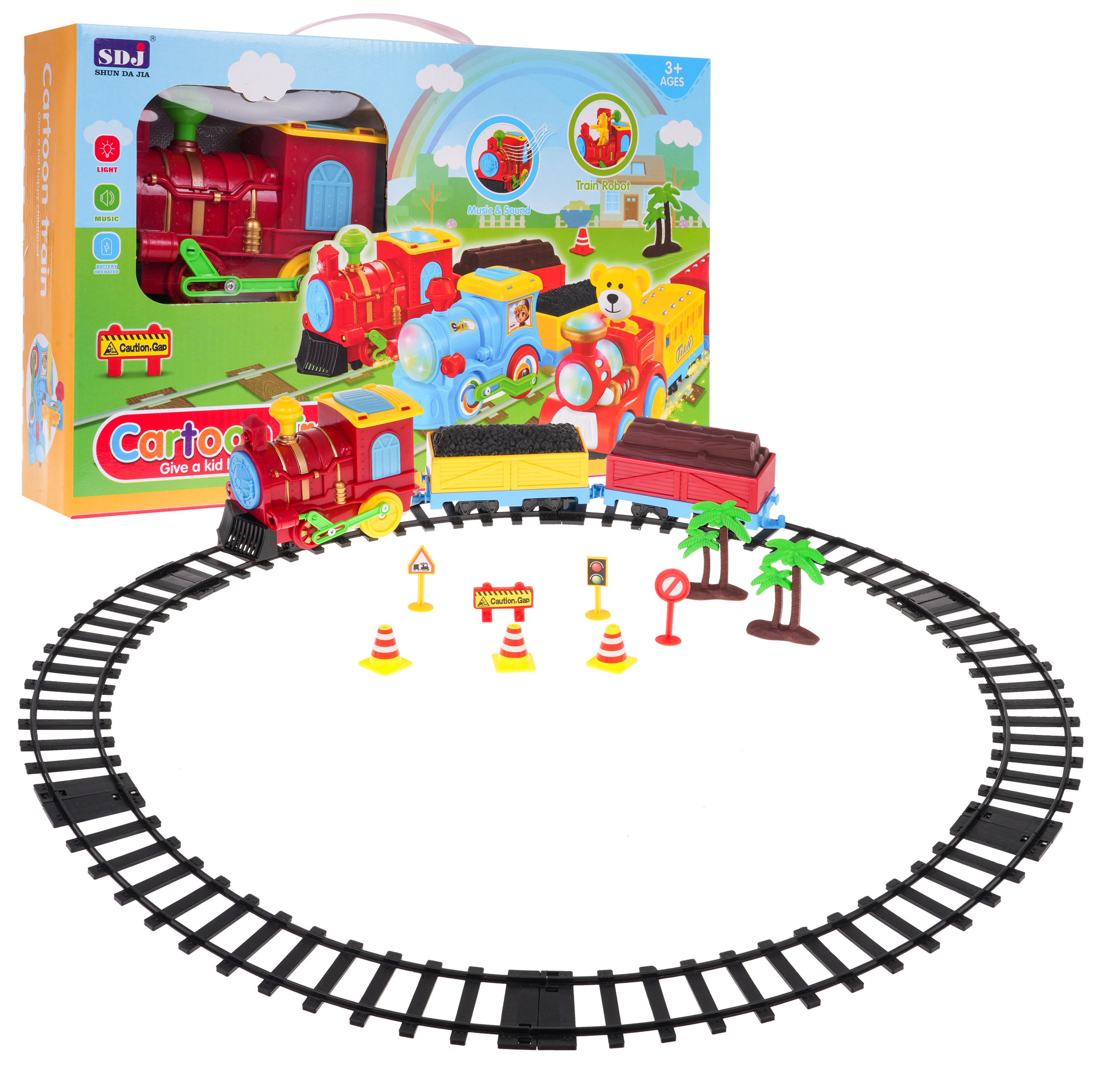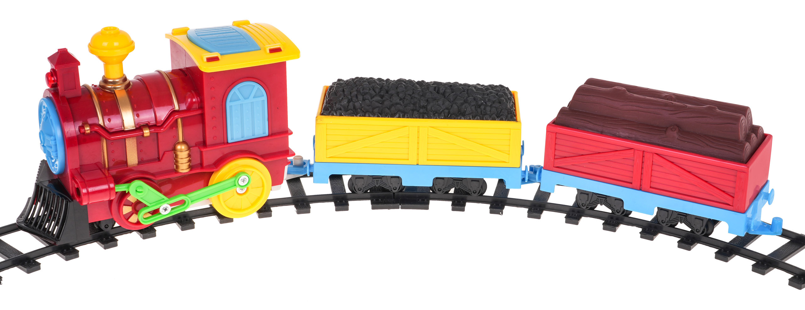 Interaktivní lokomotiva se zvuky, světly a kolejemi v balení je určena pro děti od 3 let. Lokomotiva má osvětlení - blikající světla na přední, horní a boční straně kabiny strojvedoucího. Během jízdy je také možné slyšet realistické zvuky lokomotivy. Během jízdy se kabina řidiče otevře a z jejího vnitřku vystoupí robotická postava. Ke srubu jsou přistaveny dva vozy, jeden s uhlím a druhý se dřevem. Hračka je napájena 3 bateriemi AA 1,5 V, baterie nejsou součástí balení.