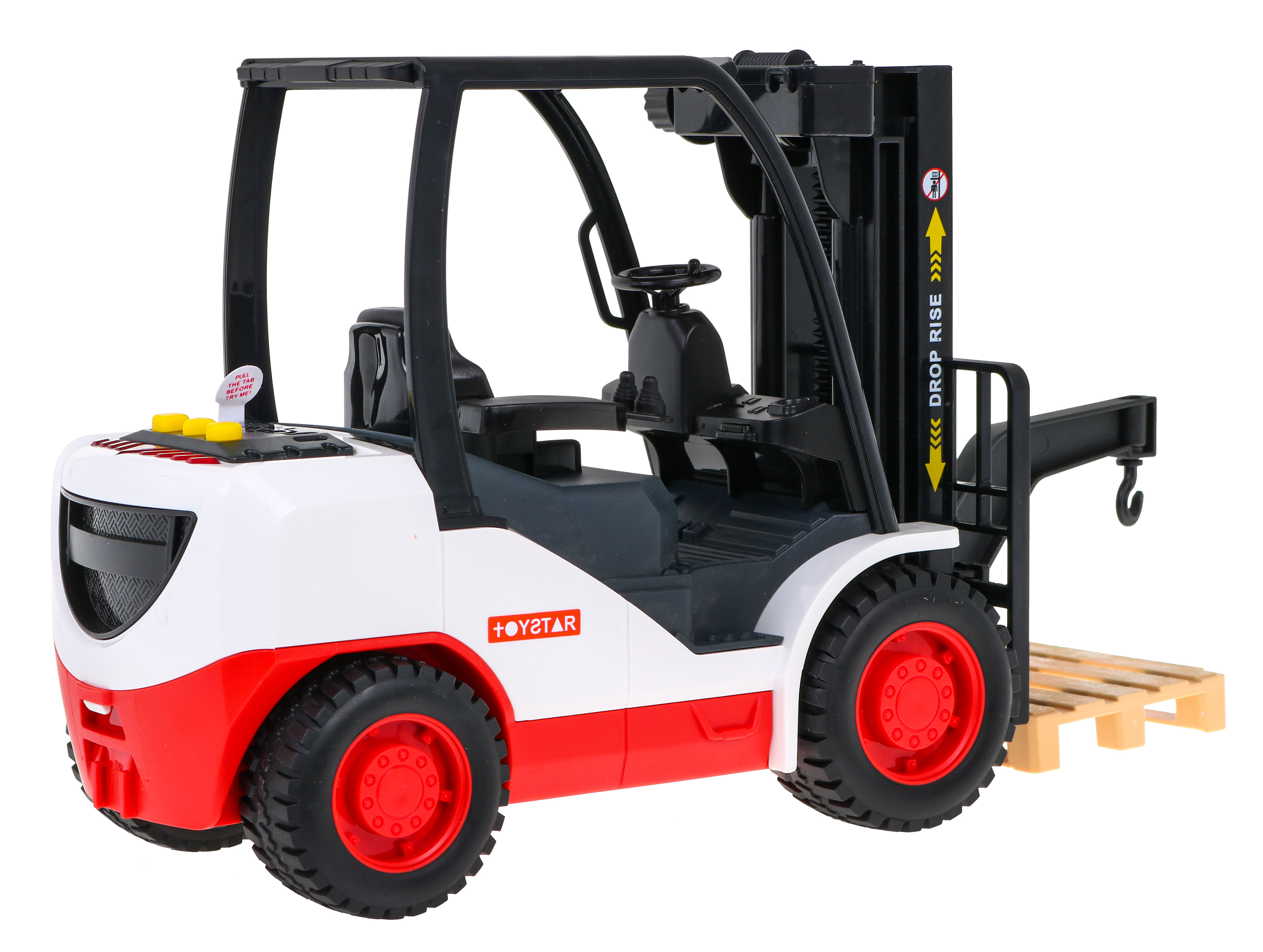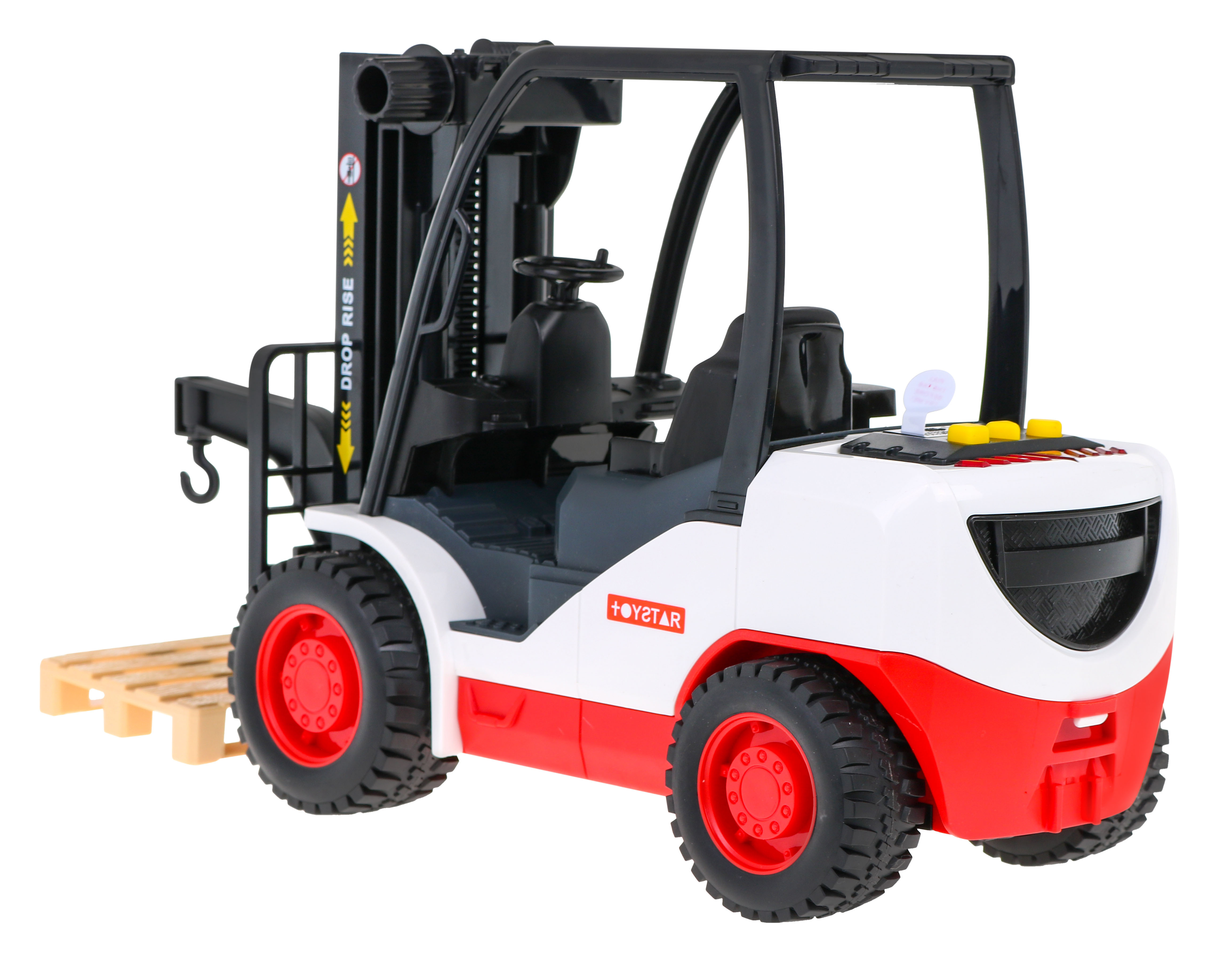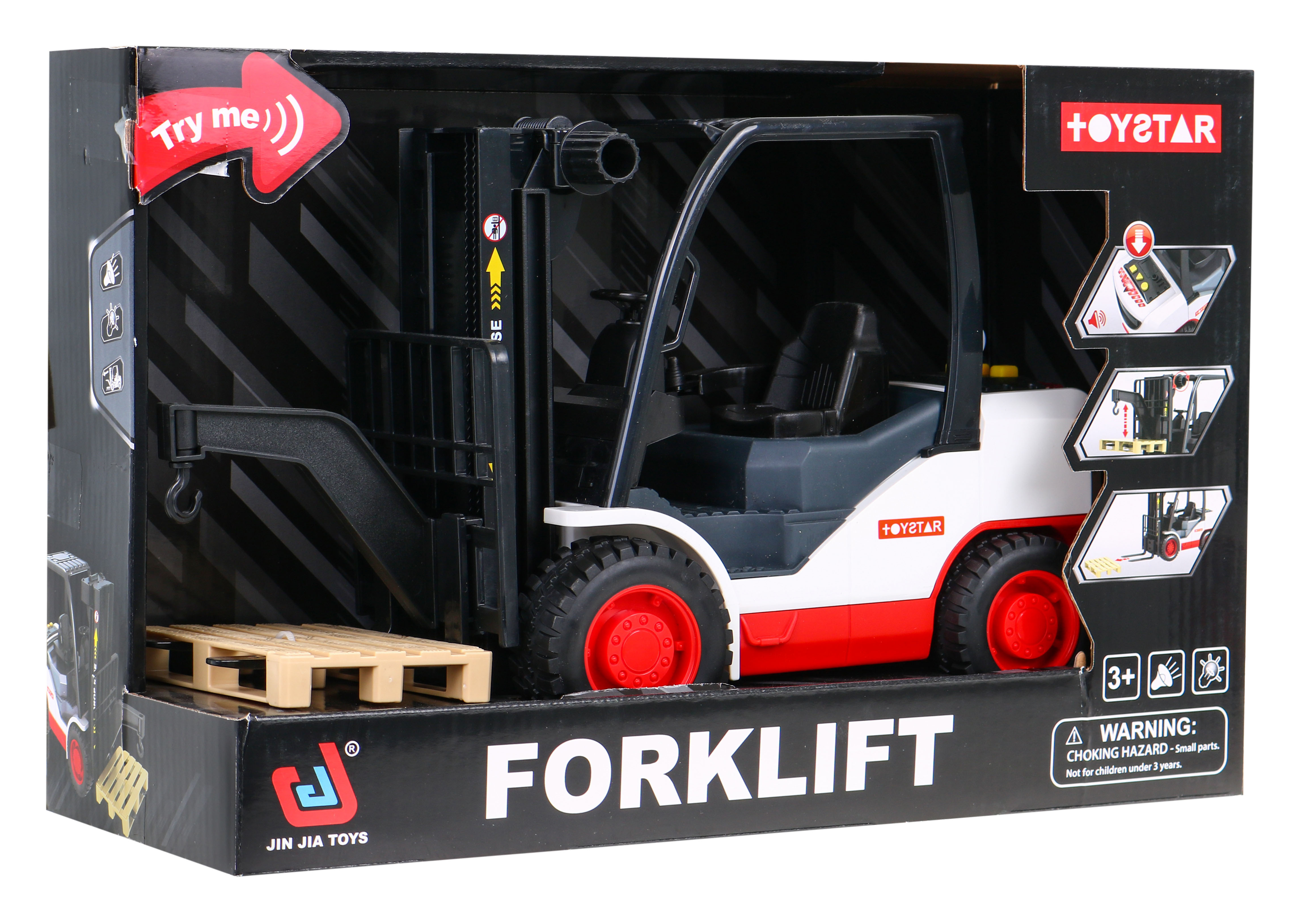 Tento interaktivní vysokozdvižný vozík s třecím pohonem, gumovými pneumatikami a zvukovými a světelnými efekty je vhodný pro děti od 3 let. Vozík se ovládá ručně pomocí kliky, která zvedá a spouští náklad na paletě (paleta je součástí dodávky). Na zadní straně vozíku je panel, který je zodpovědný za zvukové efekty (couvání, zvuk zvedání, klakson) a světelné efekty (blikající světla na panelu). Hračka je napájena 3 bateriemi AG13, které jsou součástí balení.