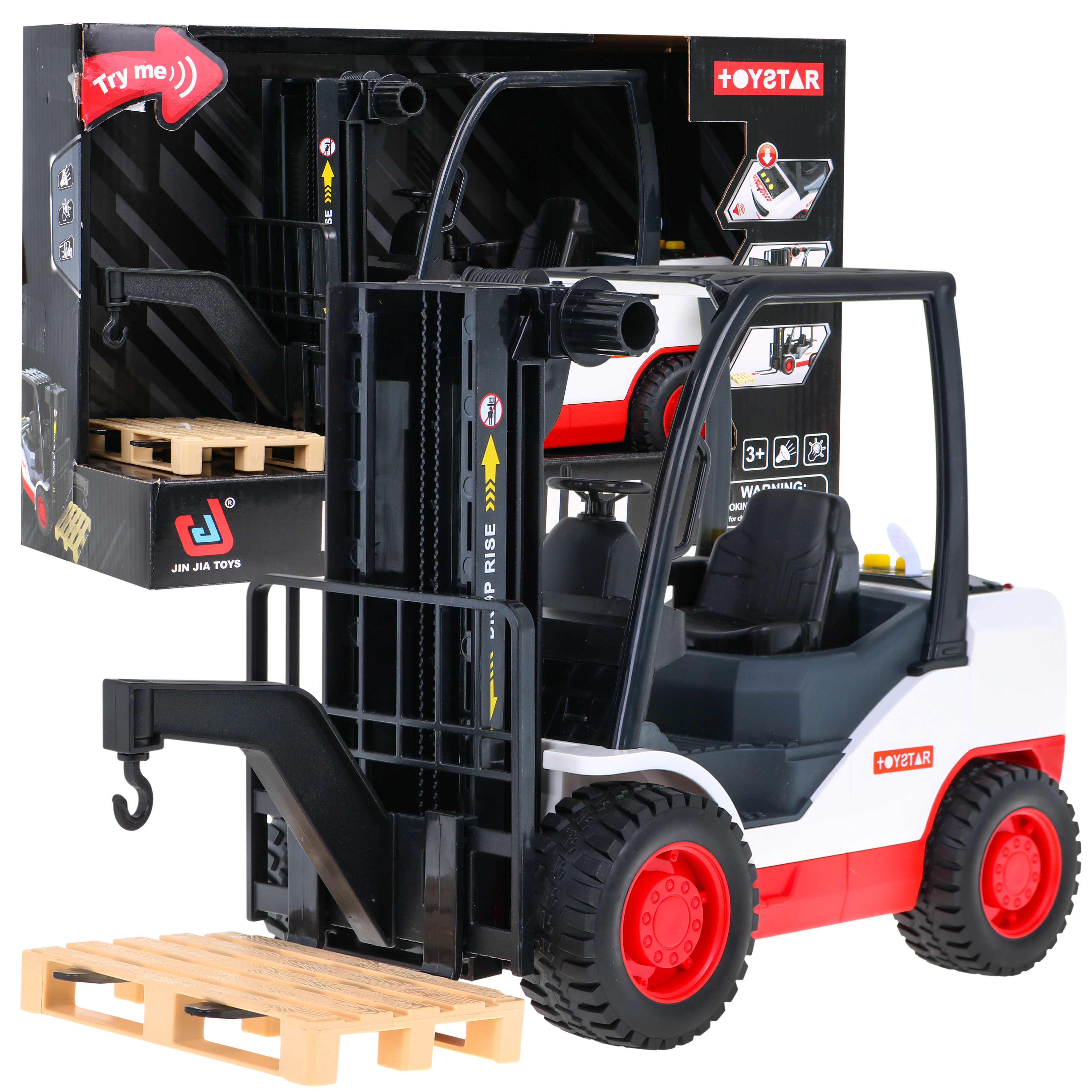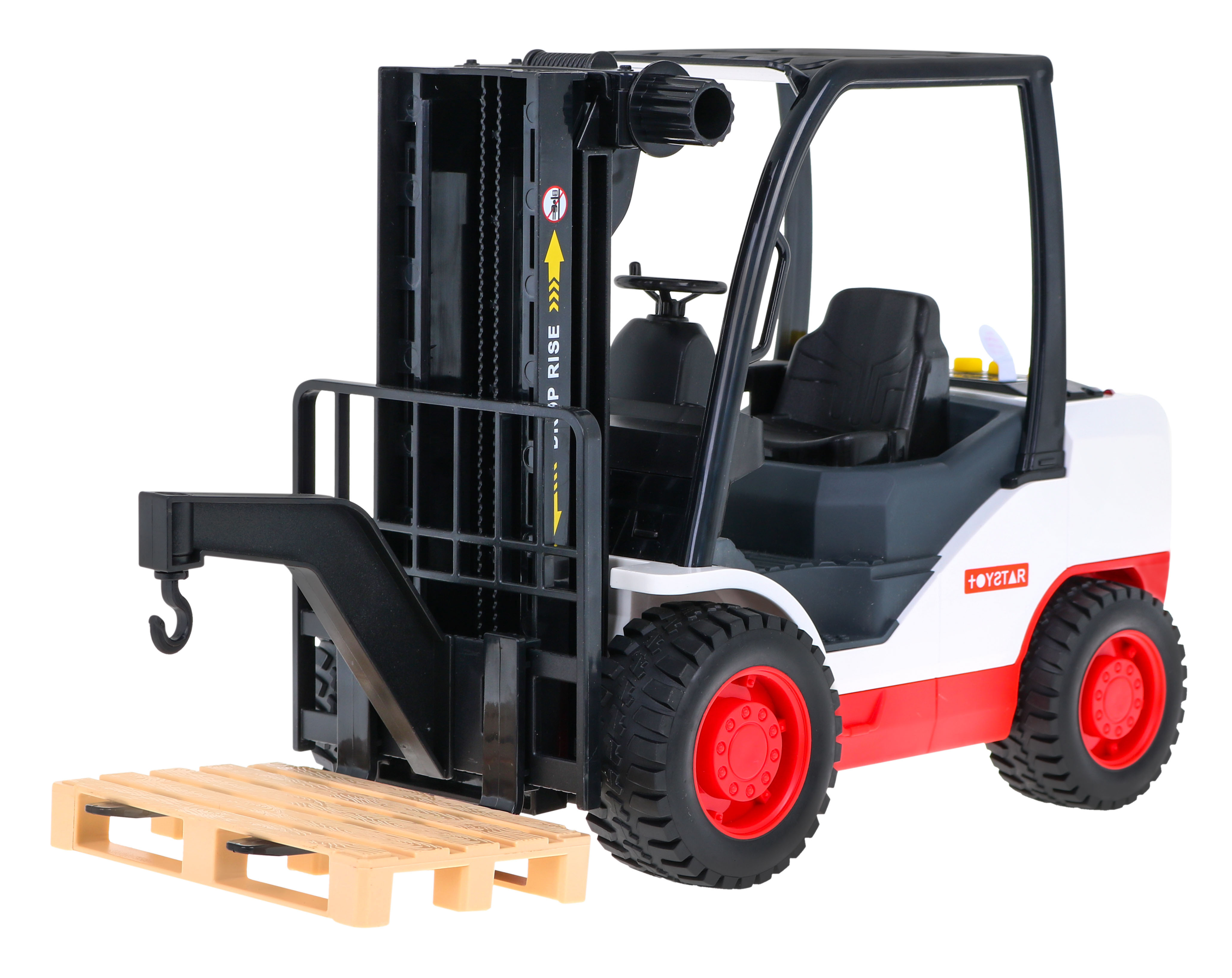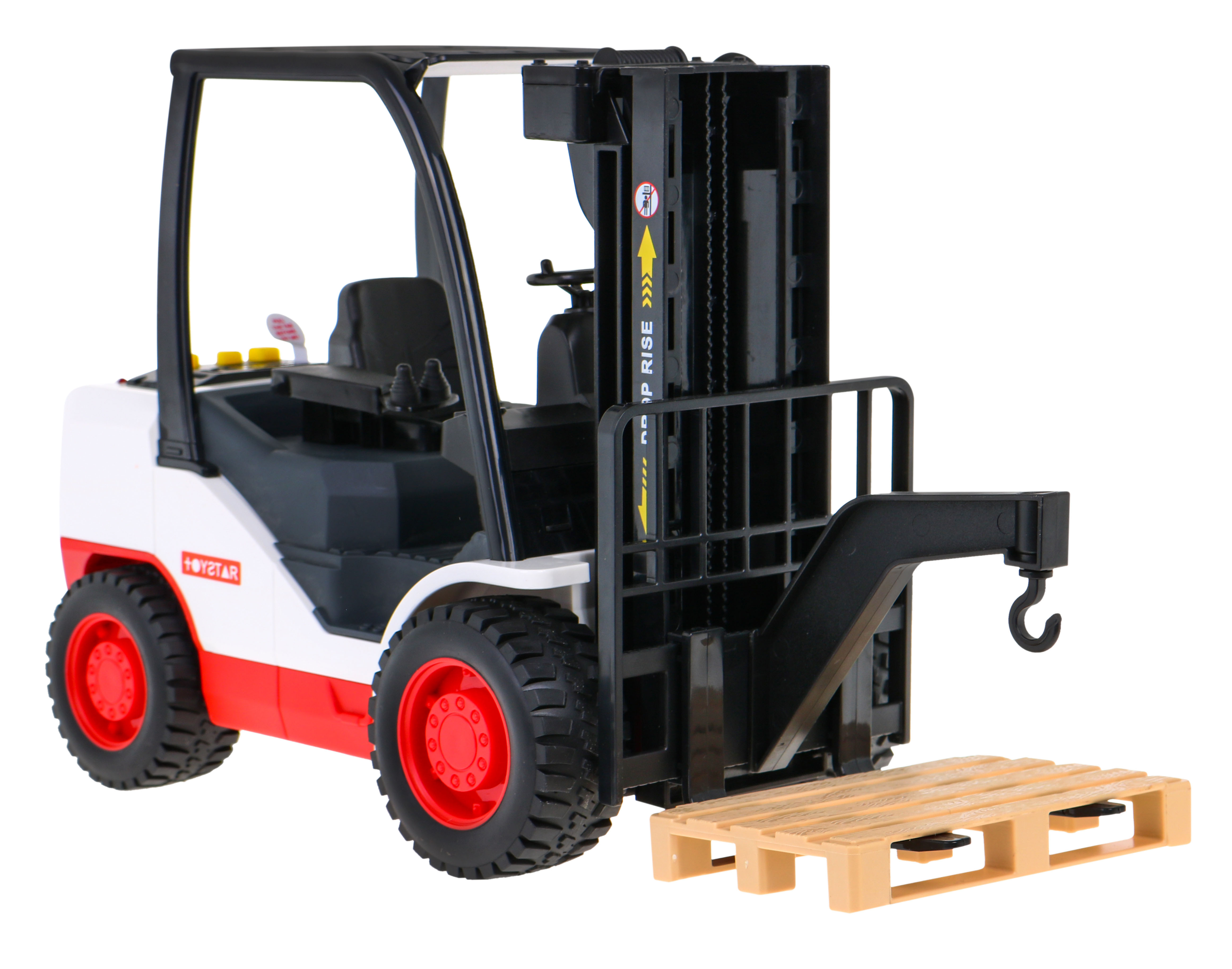 Tento interaktivní vysokozdvižný vozík s třecím pohonem, gumovými pneumatikami a zvukovými a světelnými efekty je vhodný pro děti od 3 let. Vozík se ovládá ručně pomocí kliky, která zvedá a spouští náklad na paletě (paleta je součástí dodávky). Na zadní straně vozíku je panel, který je zodpovědný za zvukové efekty (couvání, zvuk zvedání, klakson) a světelné efekty (blikající světla na panelu). Hračka je napájena 3 bateriemi AG13, které jsou součástí balení.