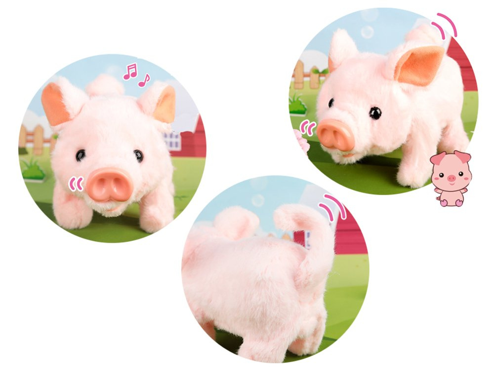 Rozkošné plyšové interaktivní prasátko se s vaším dítětem rádo skamarádí! Hračka je vyrobena z příjemného plyše, který vás nutí ji hladit. Po zapnutí hračka prasátko chodí dopředu, legračně mrská čumáčkem, vrtí ocáskem a samozřejmě vrní. Je to velmi uklidňující hračka a pravděpodobně se bude líbit každému.