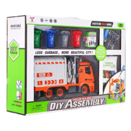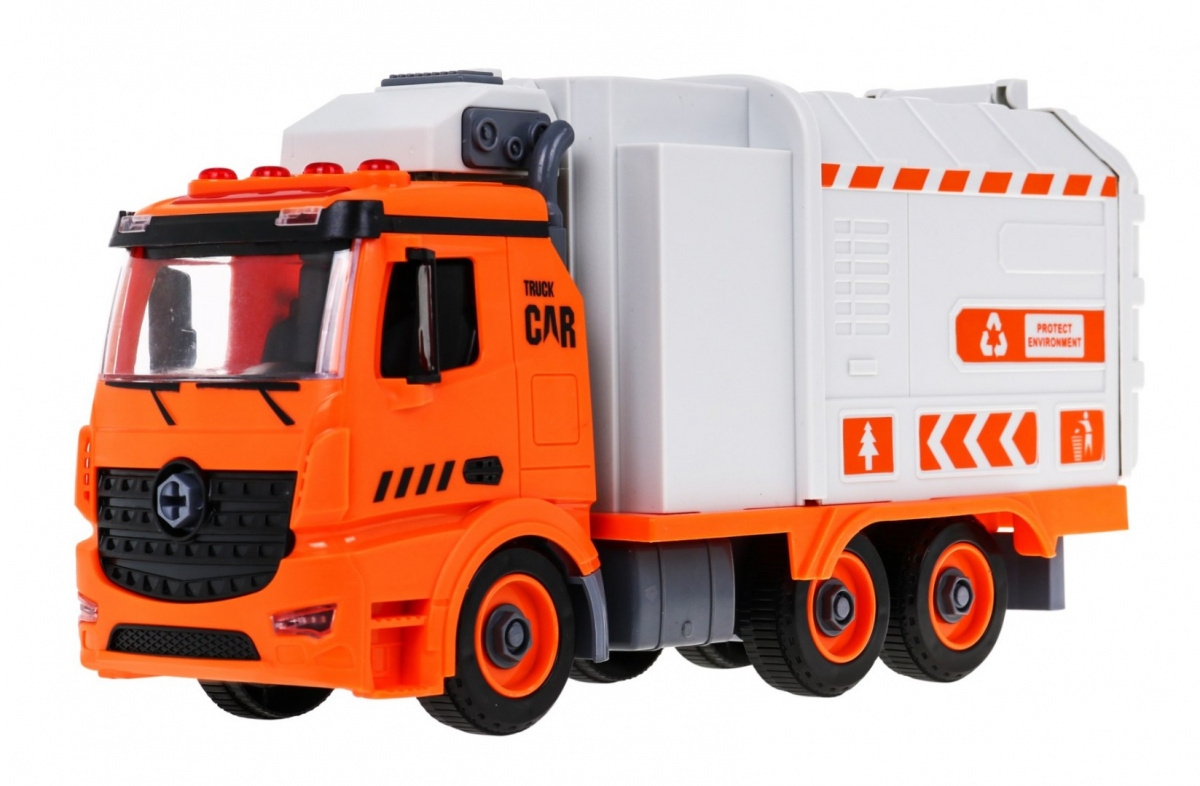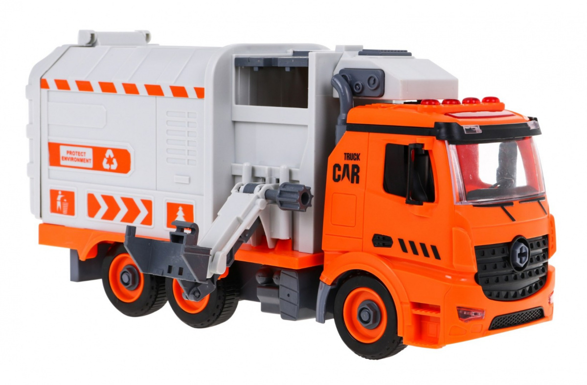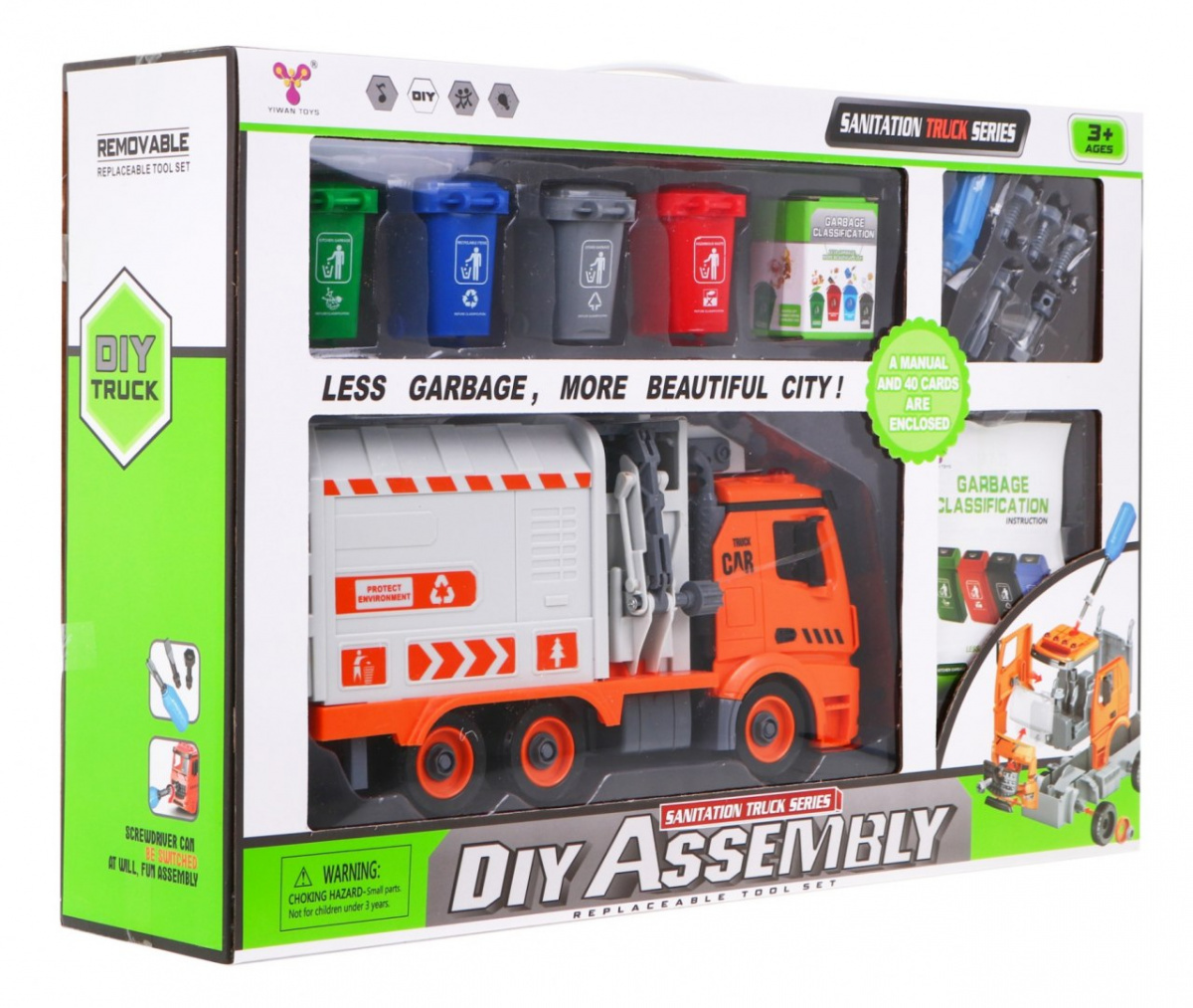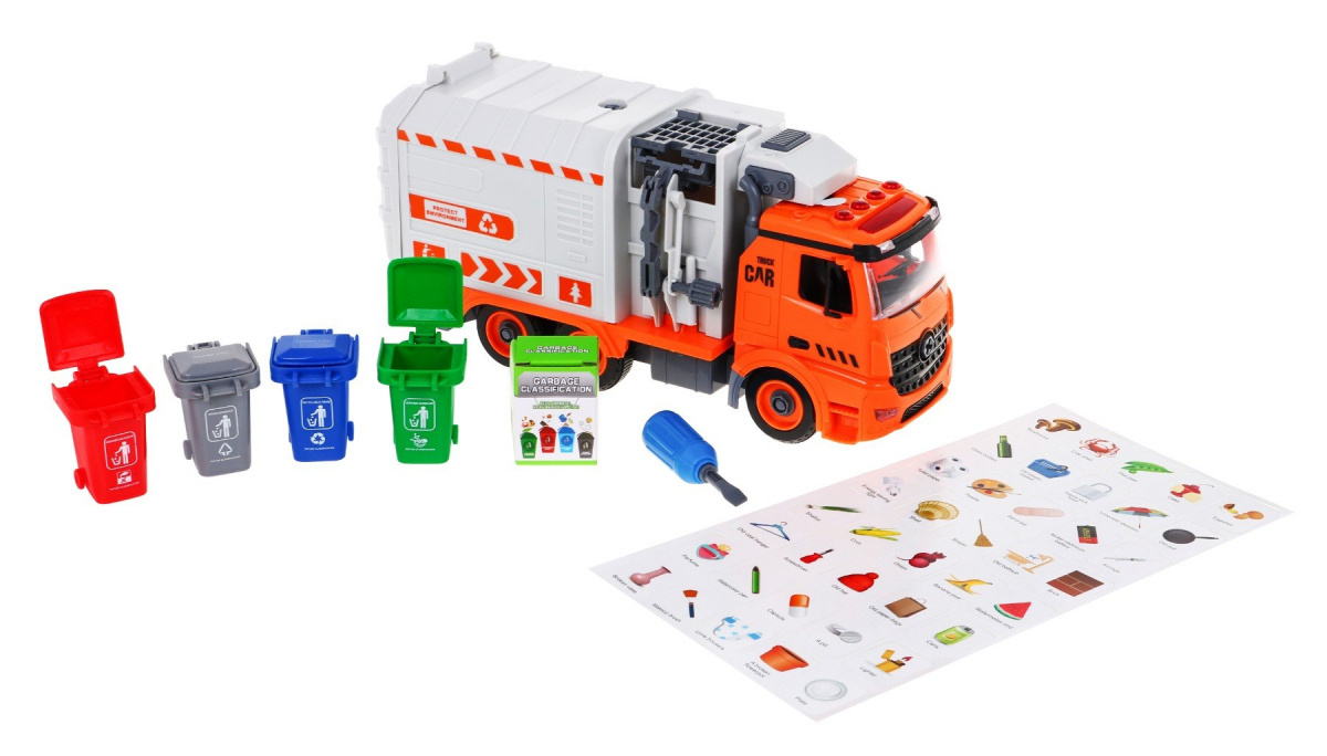 Představená sada kontejnerů a popelářského auta je pomůckou pro učení hrou. Určitě se bude líbit každému nadšenci do vozidel a kutilství. Popelářský vůz lze rozebrat pomocí dodaného šroubováku s vyměnitelnými hroty a poté jej opět složit. Vůz má zvukové a světelné funkce. Na boku vozidla je tyč pro zavěšení a zavěšení kontejnerů na tříděný odpad. Součástí je obrázková brožura. Z návodu se dítě dozví, které odpadky se mají dávat do kterého kontejneru. Zelená barva - kuchyňský odpad, modrá barva - recyklovatelný odpad, šedá barva - ostatní odpad a červená barva - nebezpečný odpad.