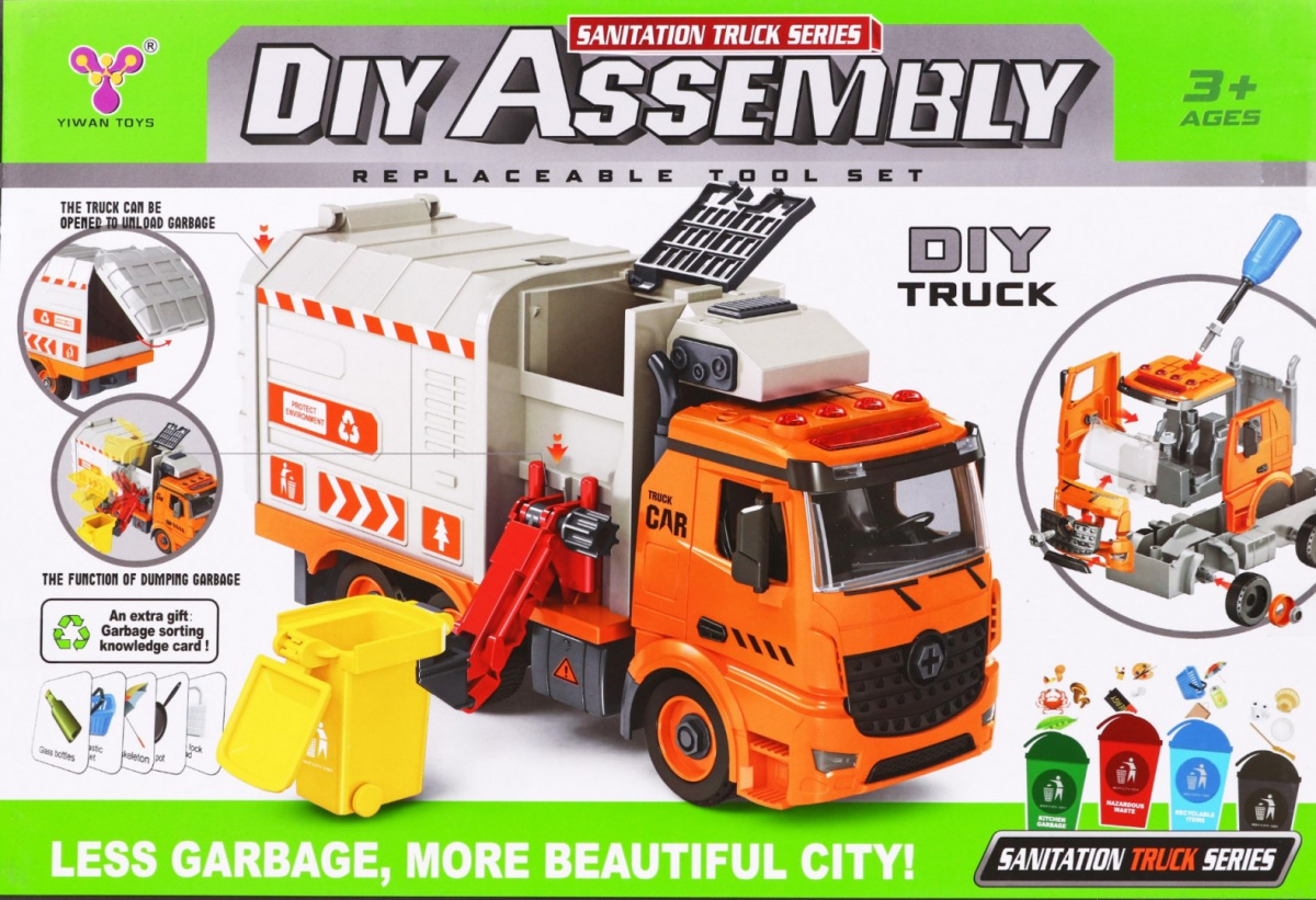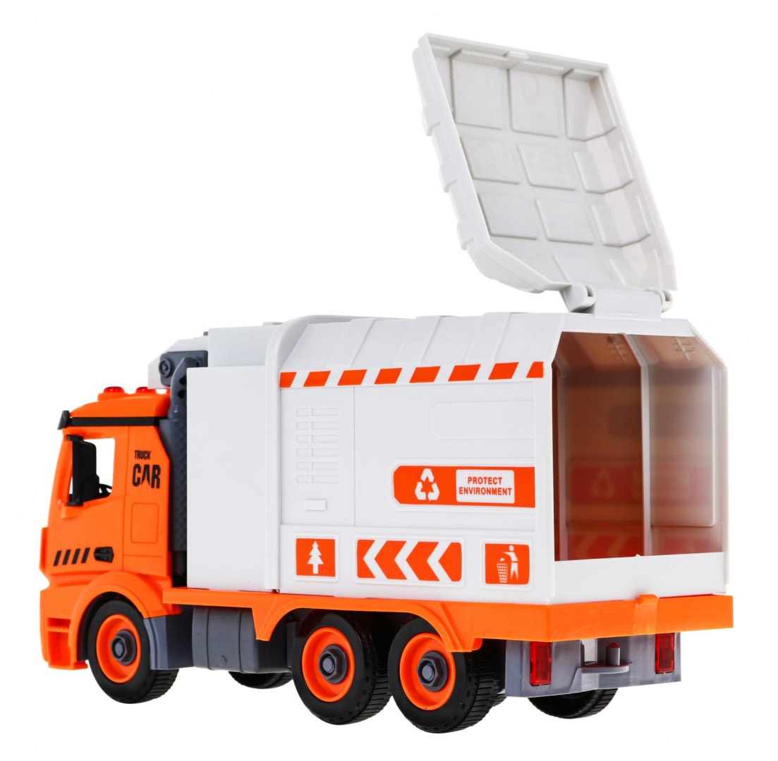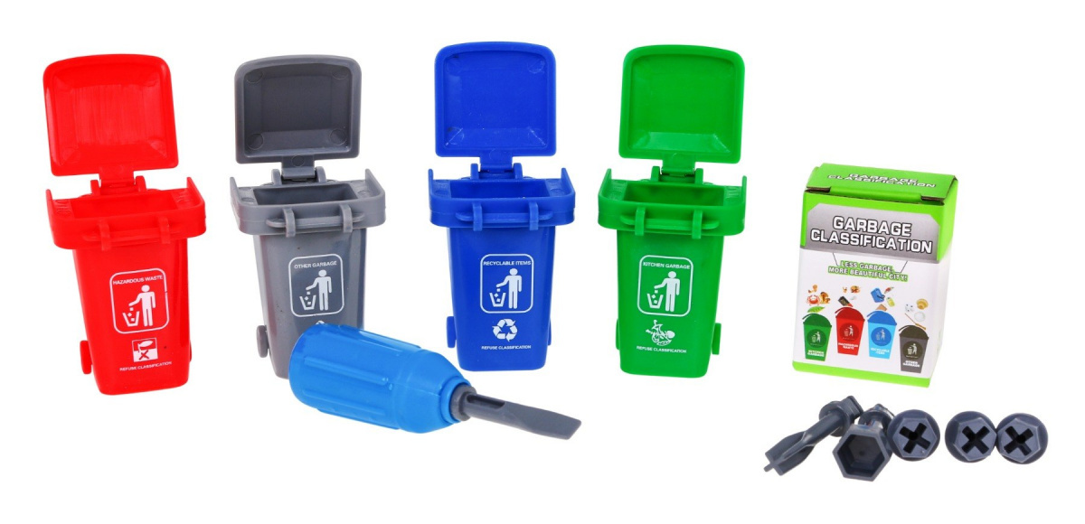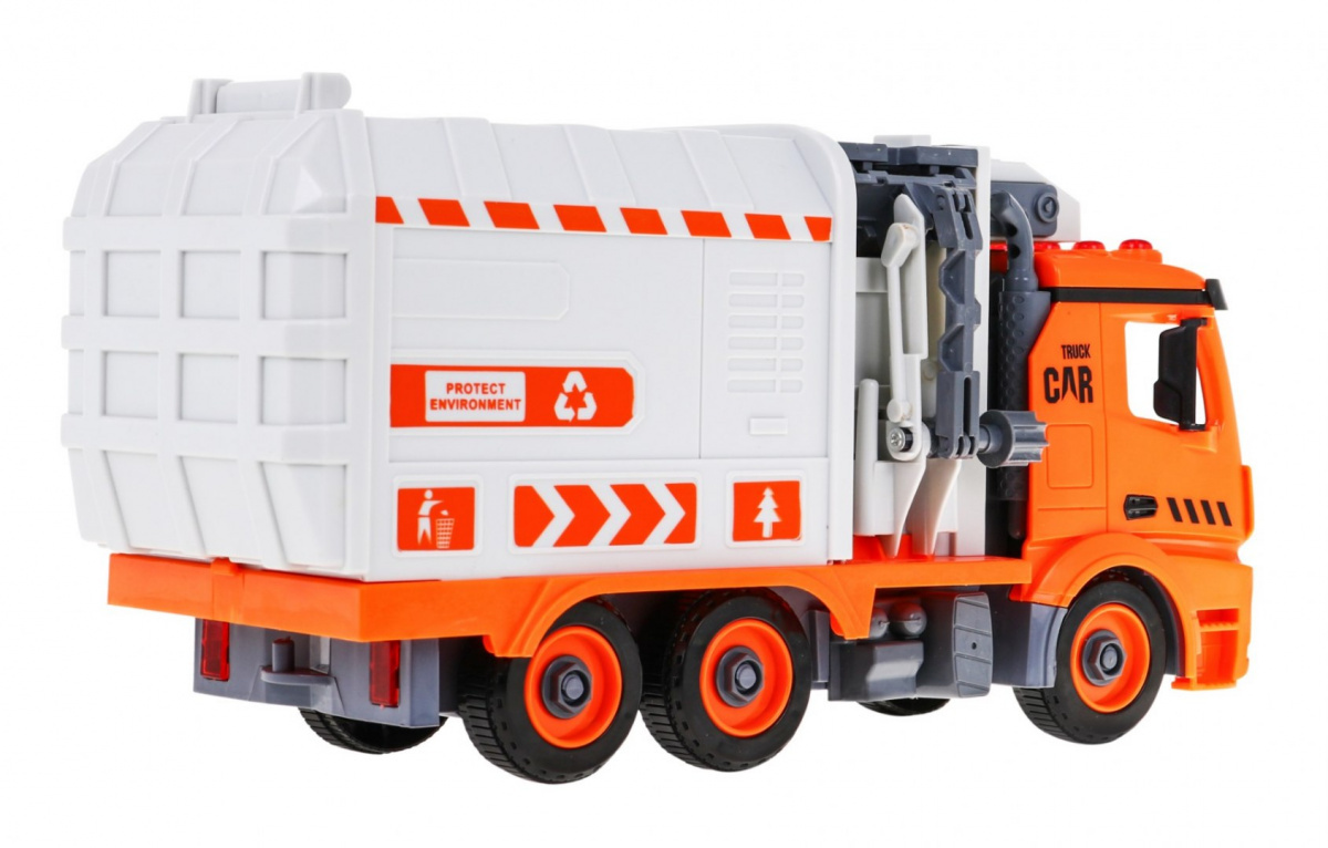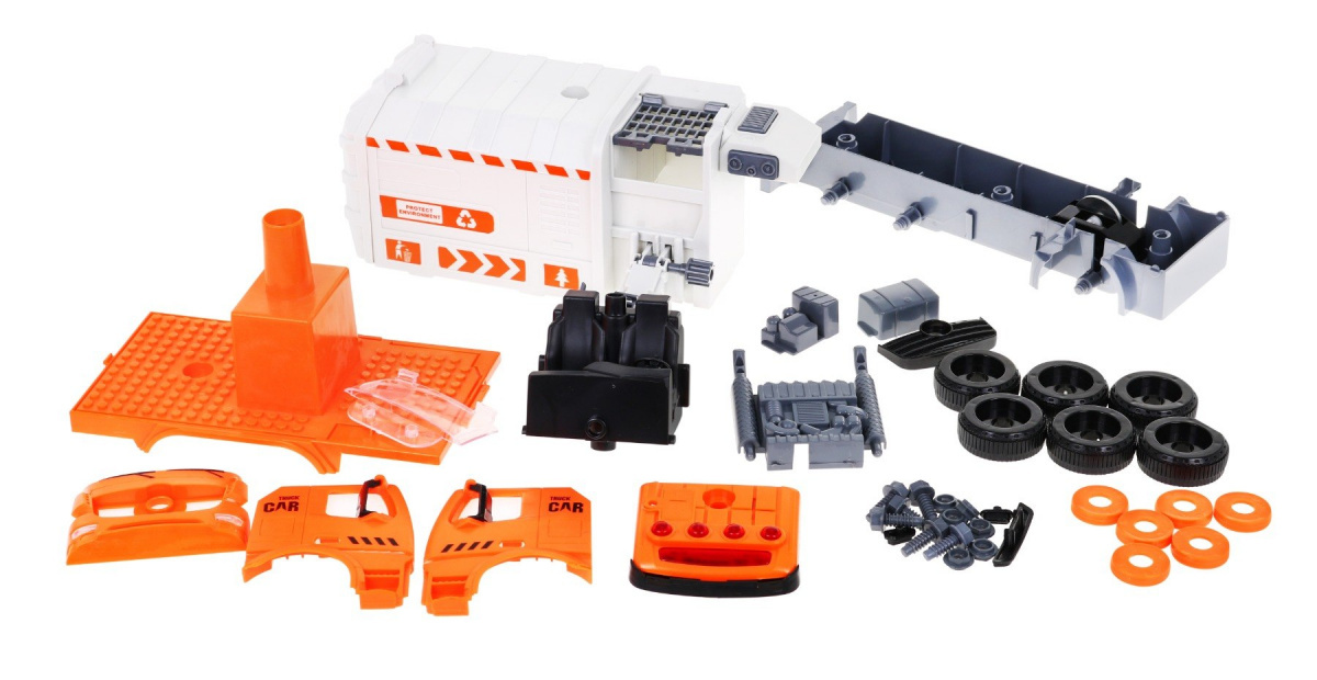 Představená sada kontejnerů a popelářského auta je pomůckou pro učení hrou. Určitě se bude líbit každému nadšenci do vozidel a kutilství. Popelářský vůz lze rozebrat pomocí dodaného šroubováku s vyměnitelnými hroty a poté jej opět složit. Vůz má zvukové a světelné funkce. Na boku vozidla je tyč pro zavěšení a zavěšení kontejnerů na tříděný odpad. Součástí je obrázková brožura. Z návodu se dítě dozví, které odpadky se mají dávat do kterého kontejneru. Zelená barva - kuchyňský odpad, modrá barva - recyklovatelný odpad, šedá barva - ostatní odpad a červená barva - nebezpečný odpad.