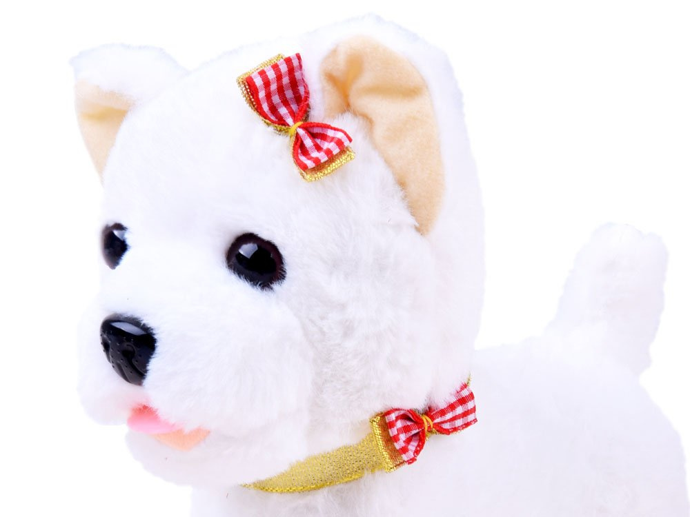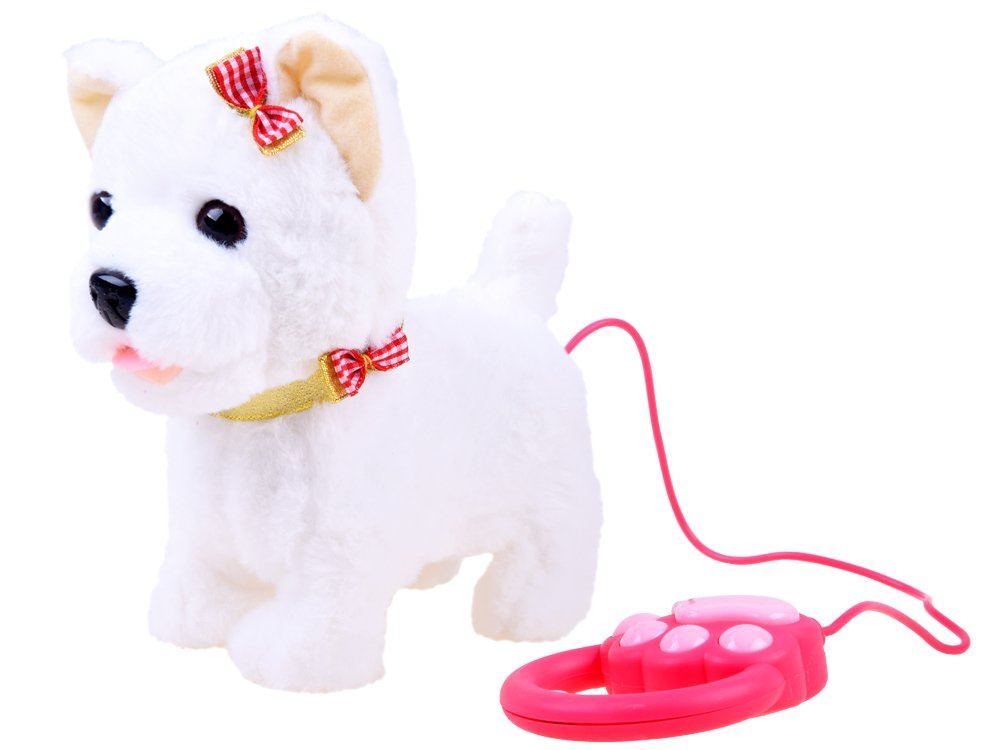 Interaktivní pes na vodítku může být splněním dětského snu o skutečném čtyřnohém kamarádovi. Asi neexistuje dítě, které by nesnilo o vlastním pejskovi. Plyšový interaktivní pejsek je napájen 3 bateriemi s 1,5V AA prsty, díky kterým může štěkat, chodit, vrtět ocasem, kňučet. Pes reaguje na dotek, hlazení dítěte zvuky štěkání, vrtění ocasem, radost.