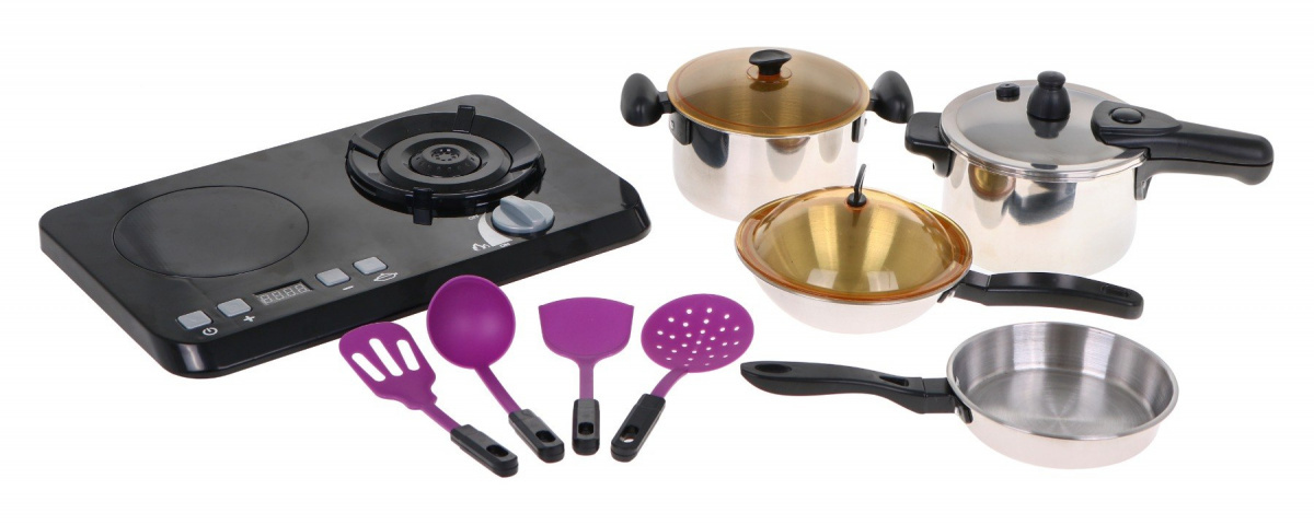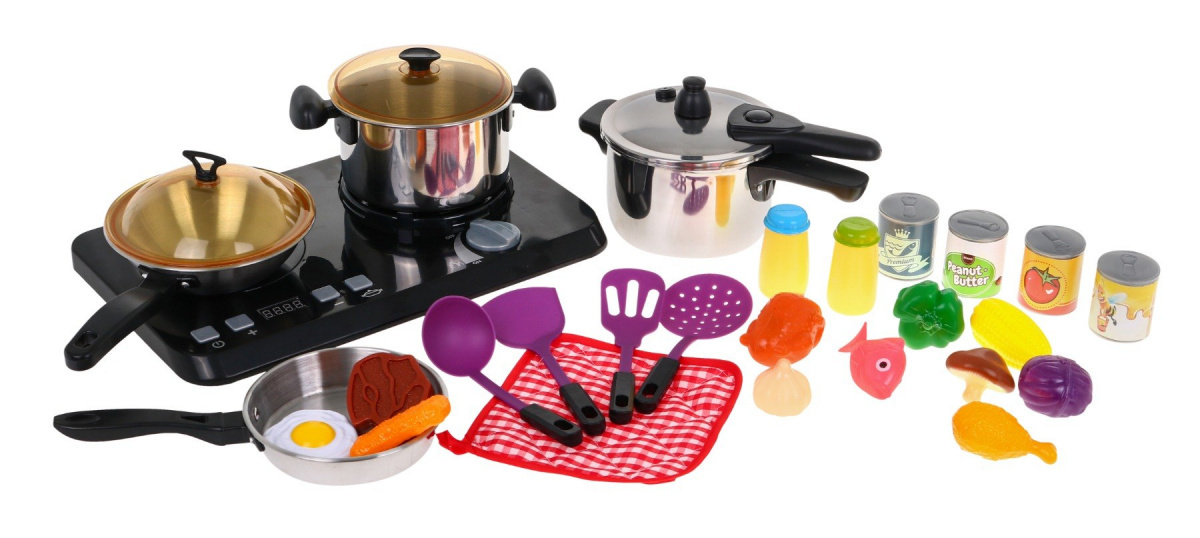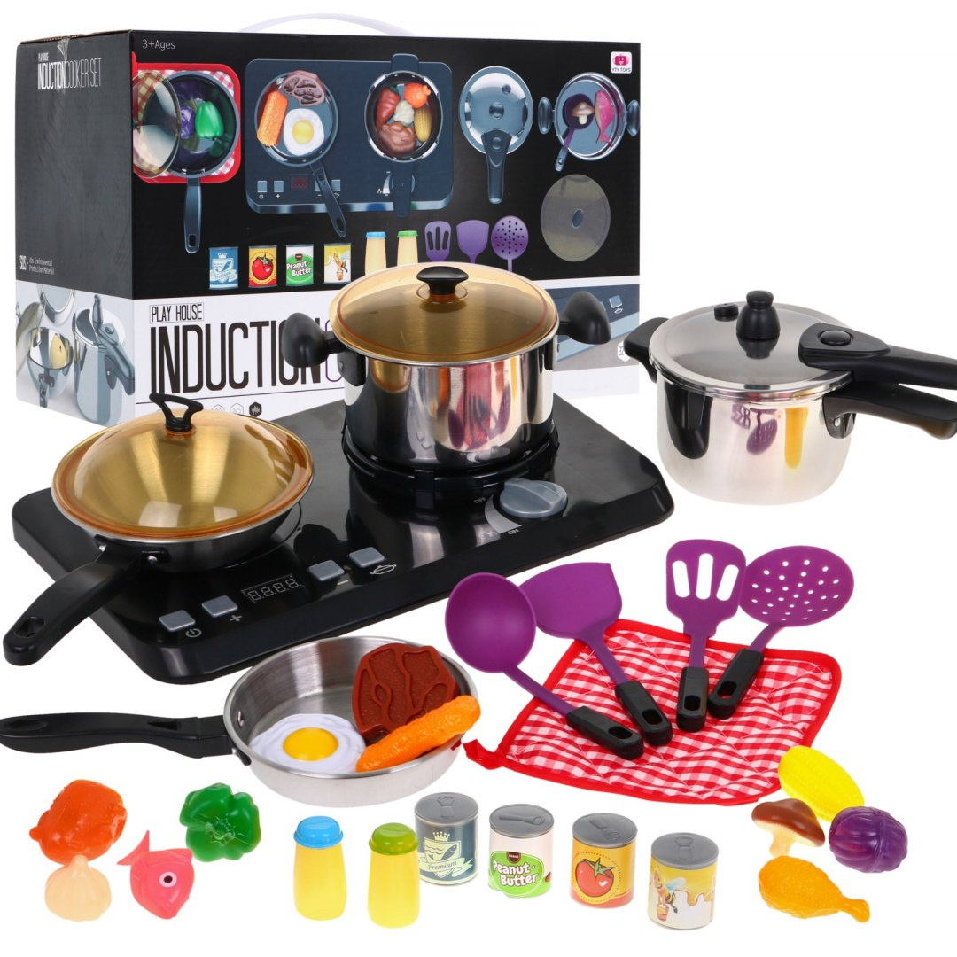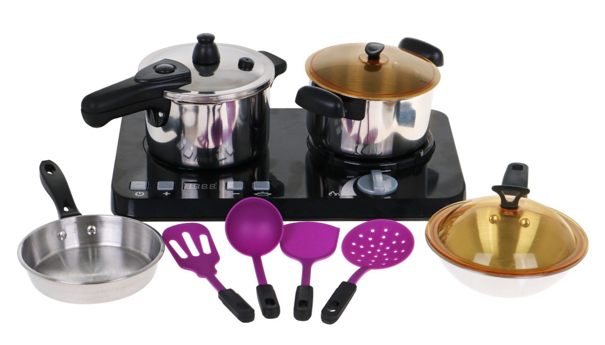 Úžasná, dobře vybavená kuchyňská sada sestávající z indukční varné desky, hrnců a příslušenství na vaření je určena pro děti od tří let. Pánev, hrnec a tlakový hrnec se podobají skutečným, jen ve zmenšené podobě. Indukční varná deska je napájena 3 bateriemi AA 1,5 V (nejsou součástí balení) a má zvukové a světelné efekty. Vlevo je osvětlený hořák se zvuky vaření a panel pro změnu doby vaření od 2 do 20 minut. Vpravo je osvětlený hořák se zvuky smažení a knoflíkem ON/OFF. Zahrnuty jsou také fiktivní potraviny.