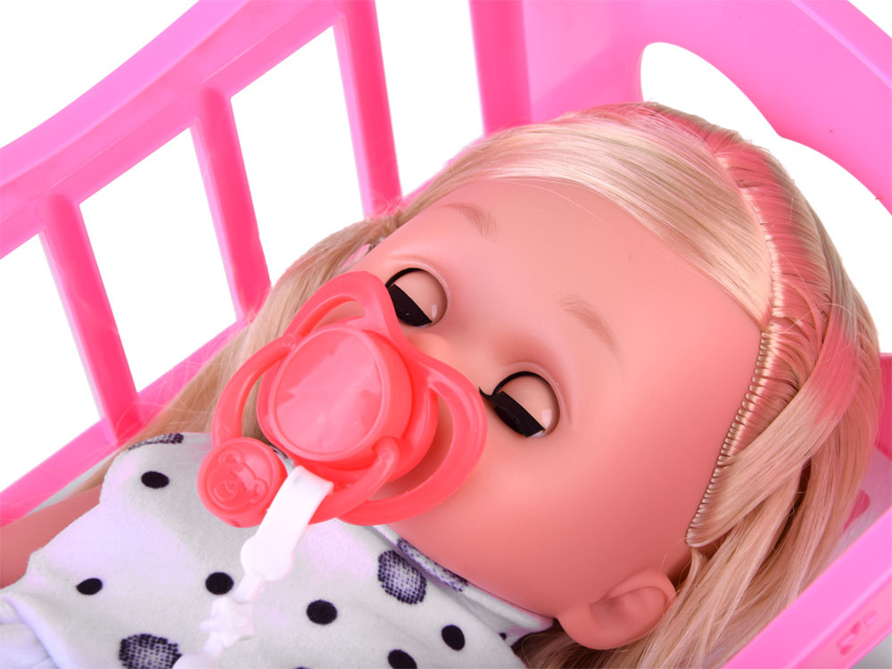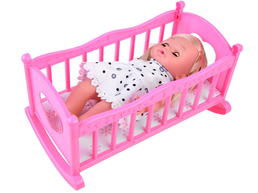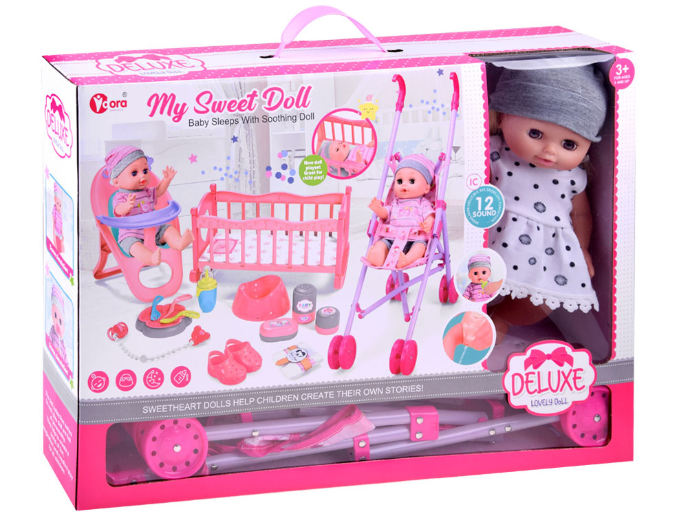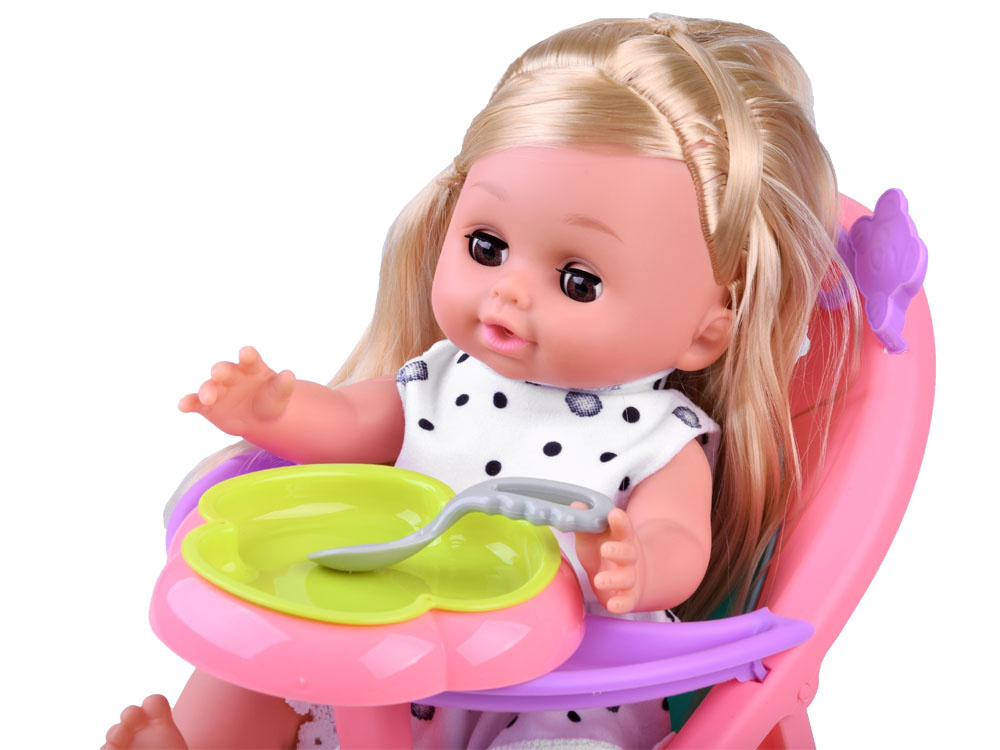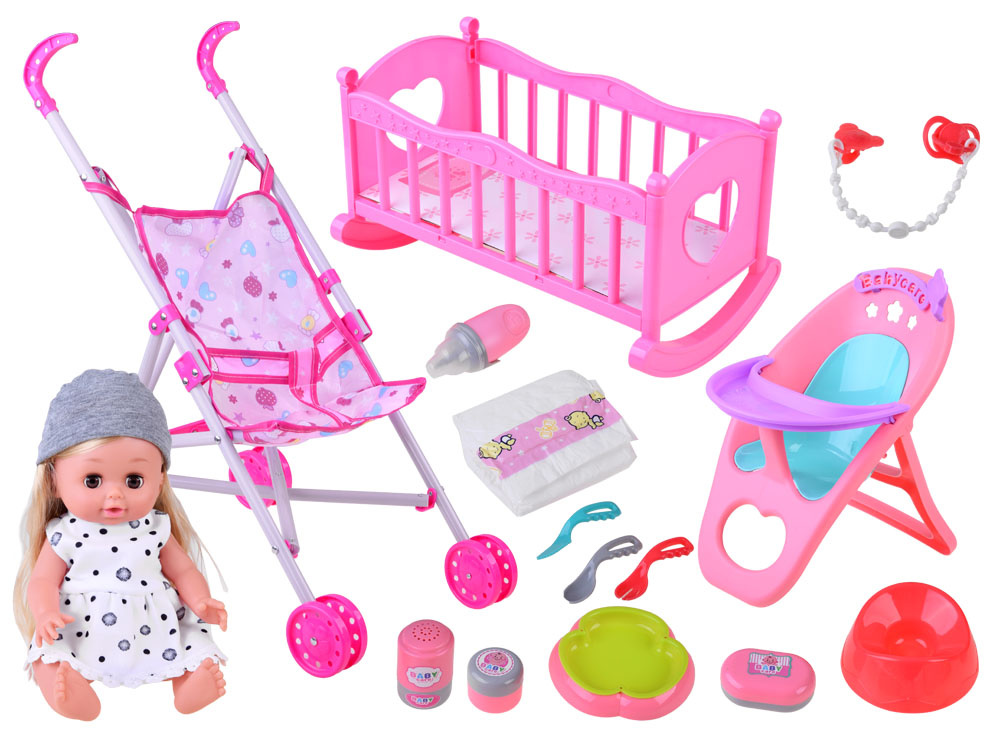Při jídle můžeme batole bezpečně posadit do židličky na krmení. Křeslo je vybaveno stolkem, na který lze při krmení umístit misku. Součástí je také sada bezpečnostních příborů (lžíce, vidlička, nůž).Po jídle je čas na zdřímnutí v pohodlné kolébce. Rám kolébky je vyroben z plastu, zatímco dno je ze silného kartonu s květinovou grafikou. Růžový rámeček kolébky je zdobený hvězdičkami a měsícem. Po spánku je čas na procházku v oblíbeném kočárku.