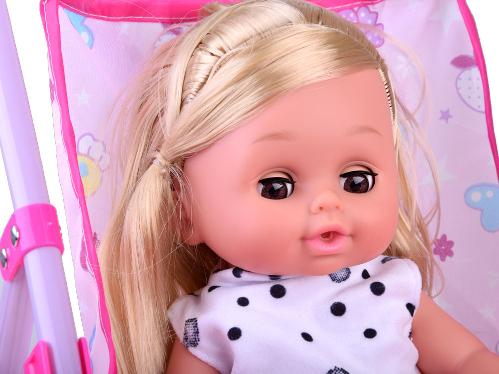 Rám a kola kočárku jsou vyrobeny z plastu. Pozornost upoutá okouzlující světle růžová látka s grafikou srdíček, ovoce a květin. Vozík je vybaven popruhy, které chrání panenku před vypadnutím. Snadno se skládá do tzv. deštník, takže v místnosti nezabere mnoho místa.