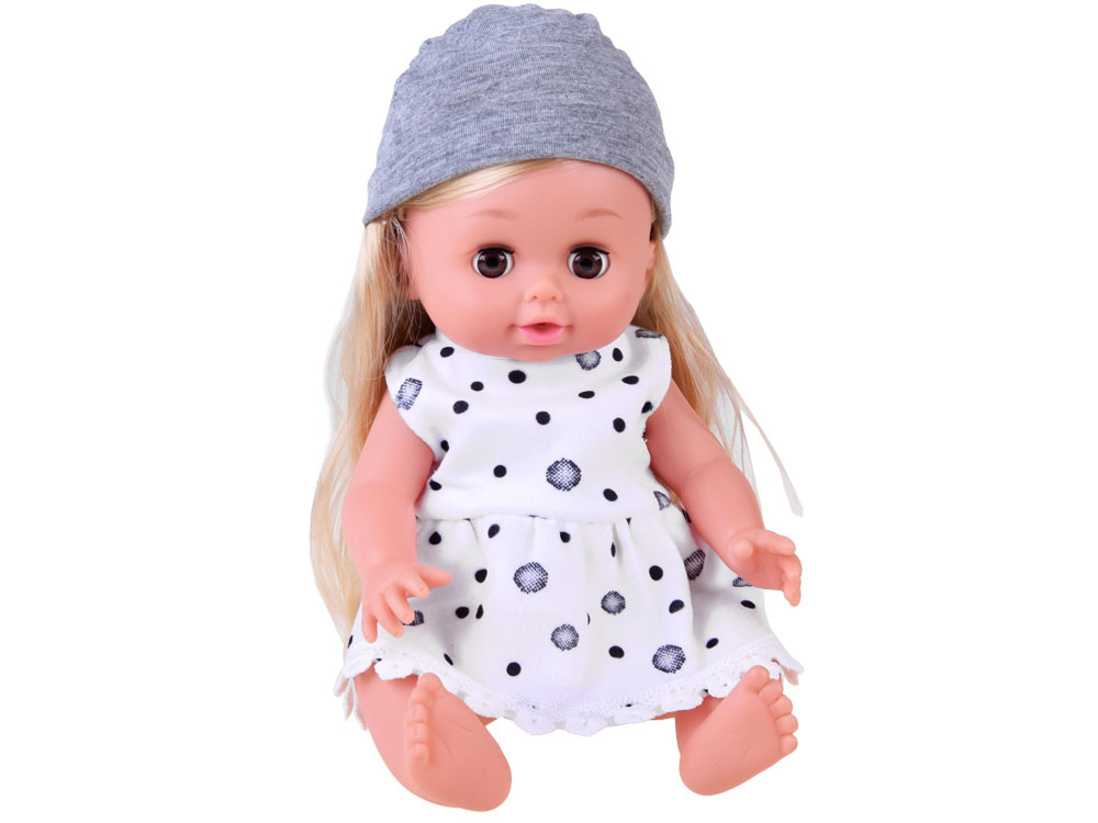 Sada obsahuje krásnou panenku s hnědýma očima a dlouhými blond vlasy. Je oblečená do krásných bílých puntíkovaných šatů. Celý outfit doplňuje šedá tenká čepice ideální na procházky. Oči panenky se zavírají, aby mohla také spát. Trup panenky je vyroben z plastu a hlava, ruce a nohy z gumy.