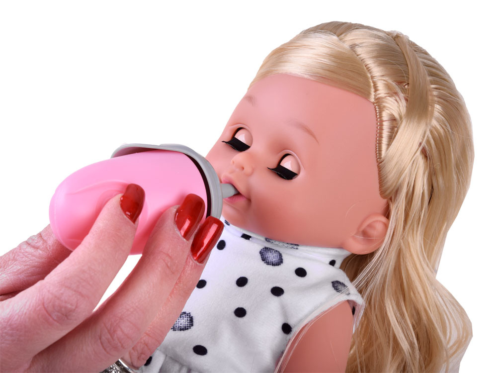 Panenku lze napájet přiloženou lahvičkou a má také funkci čůrání. Součástí sady je také plenka a nočník, na který si může panenka po jídle sednout.