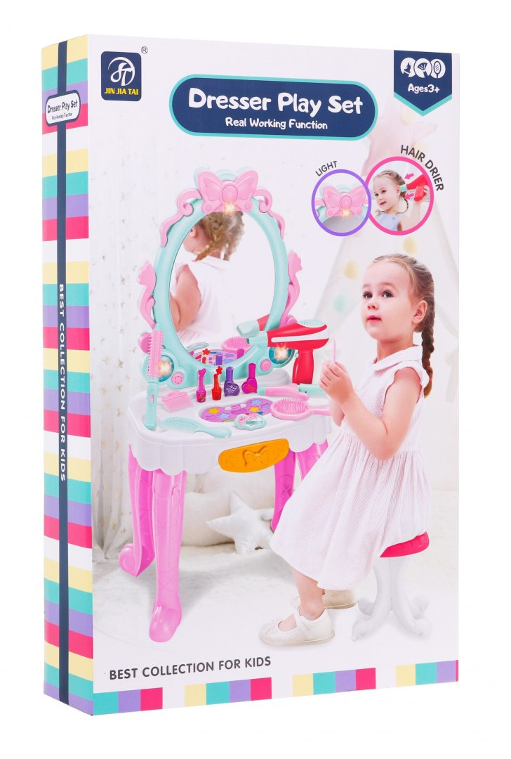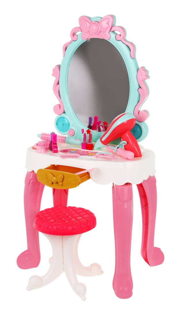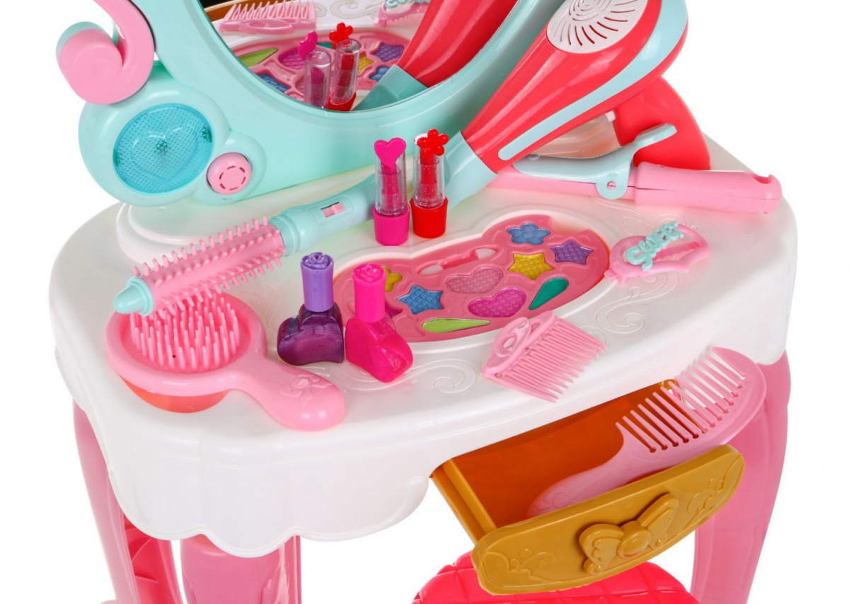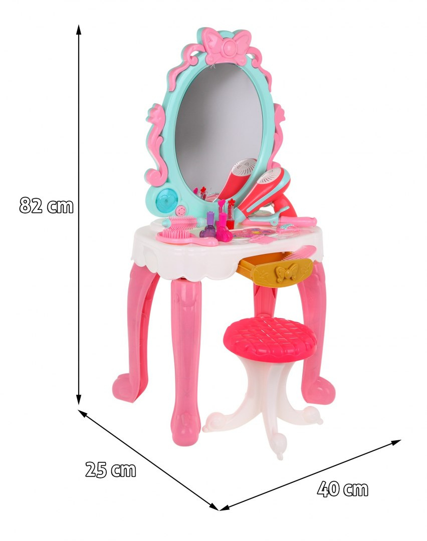 Tato dobře vybavená sada toaletního stolku s doplňky a stoličkou je ideální pro malé princezny od 3 let. Hračka má zvukové a světelné efekty. Je napájen 5 bateriemi AA - nejsou součástí dodávky.