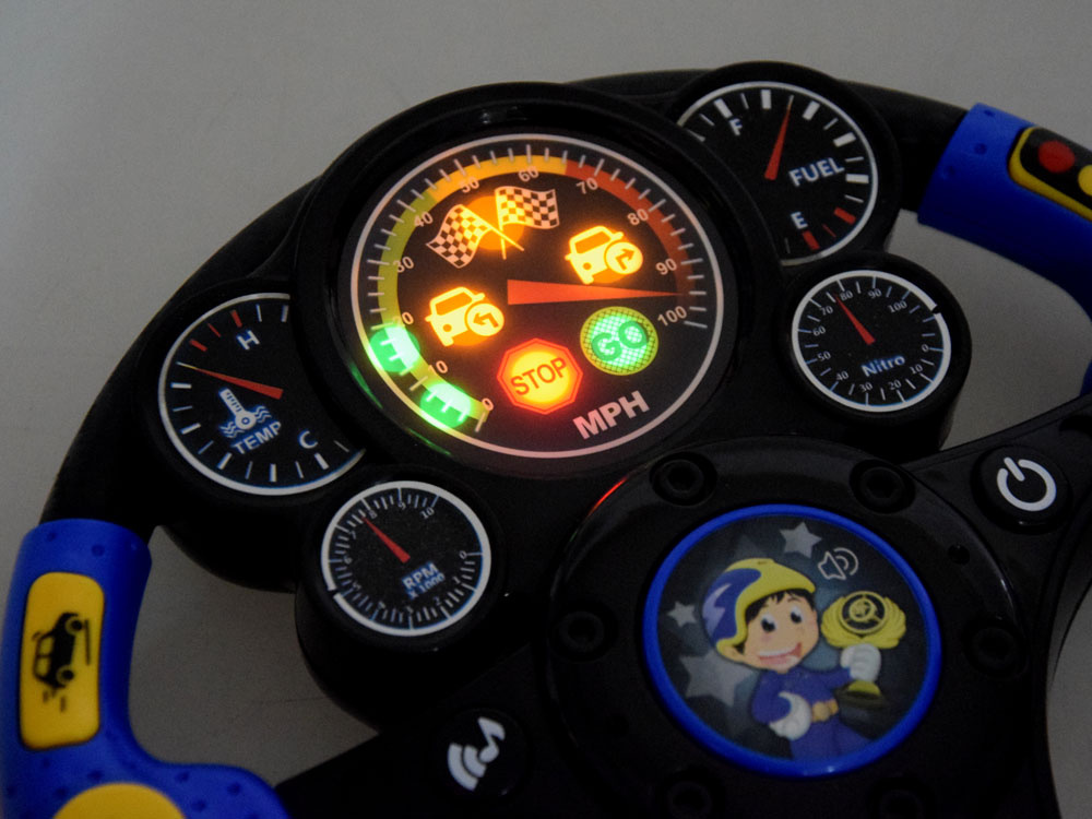 - notové tlačítko spustí: klakson, veselé melodie, světelné efekty na hodinách