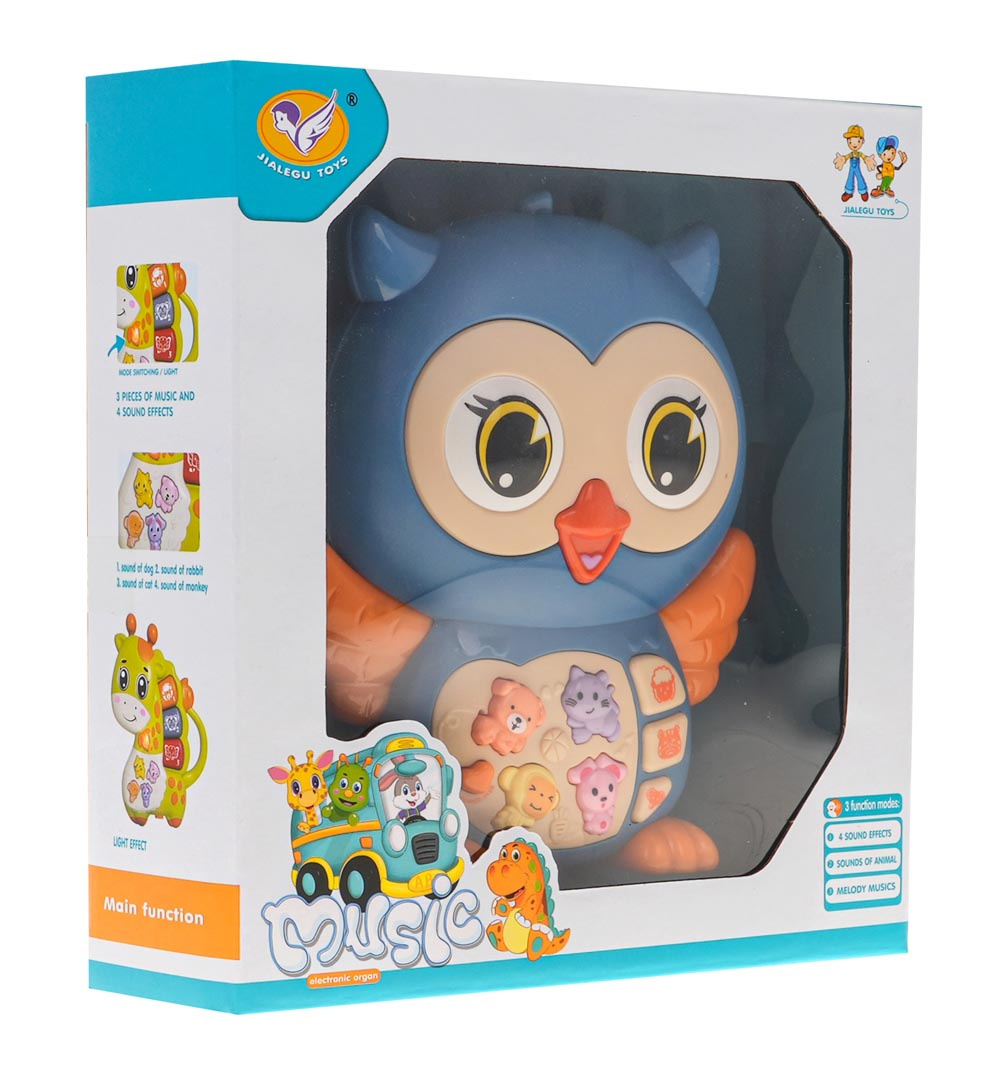 Interaktivní sova s funkcí zvuku a světla pro děti od 6. měsíce věku. Sova byla vyrobena z nejkvalitnějšího plastu, je odolná proti nárazům a bezpečná pro malé děti, nemá žádné ostré hrany. Sovu vyrobili v živých barvách, které přitahují dětský zrak a povzbuzují ke hře. Na bříšku sovy se nachází panel s tlačítky, které spouštějí zvuky zvířat (v prvním režimu), melodie, zvuky Do-Re-Mi (v druhém režimu) a světelné efekty v podobě blikajících světýlek na křidélkách sovy. Režimy měníme tlačítkem ve tvaru srdíčka. Hračka má regulaci hlasitosti. Je napájena bateriemi typu 2 x AA 1,5 V (nejsou součástí balení)